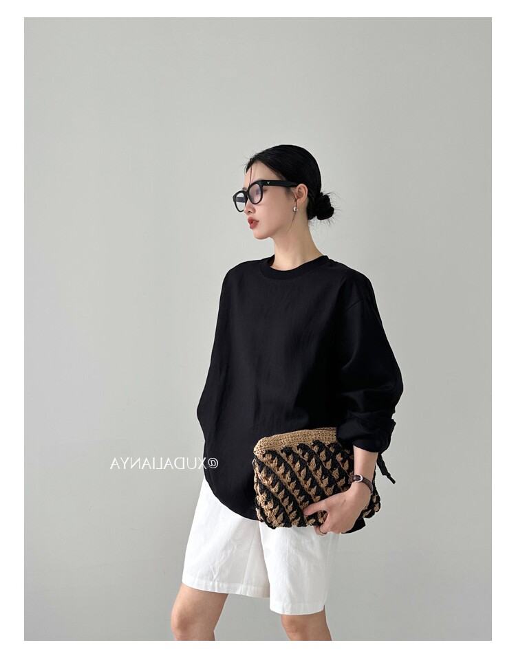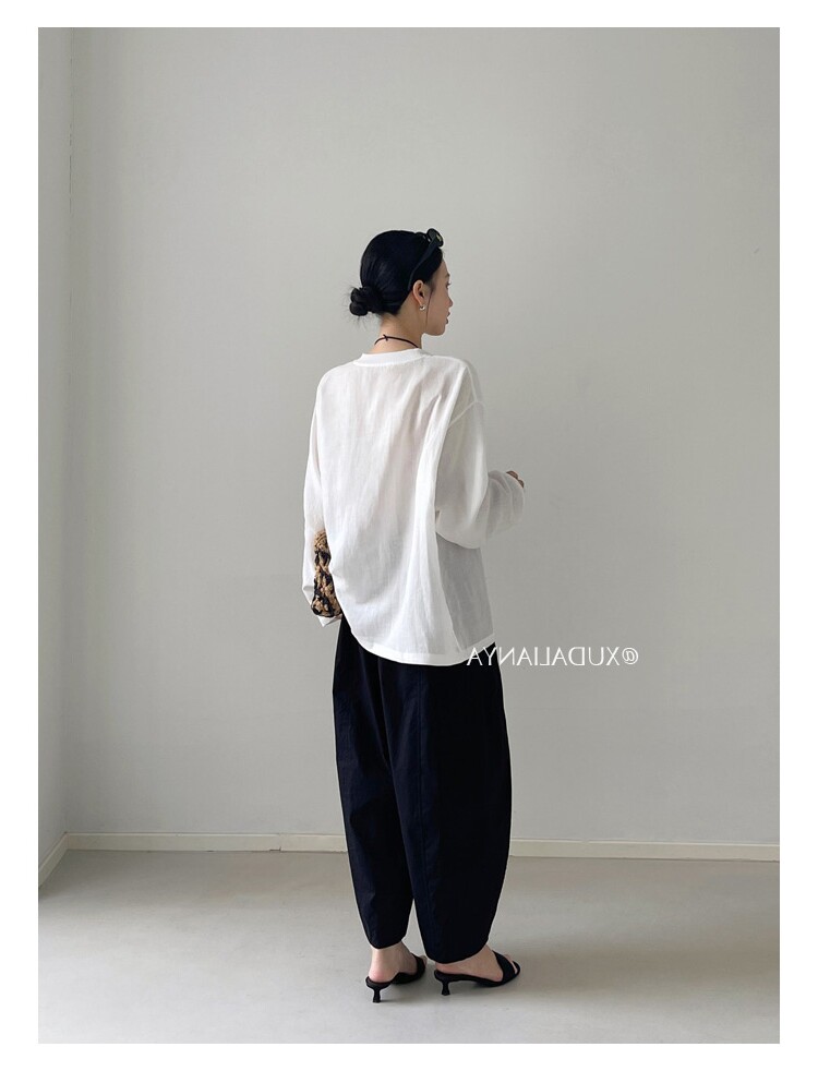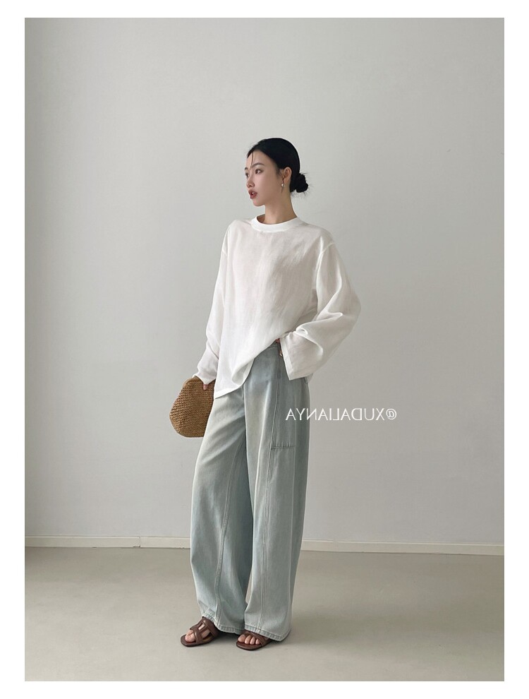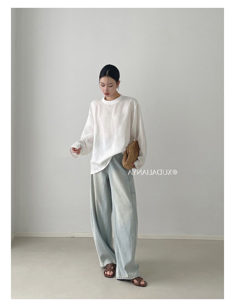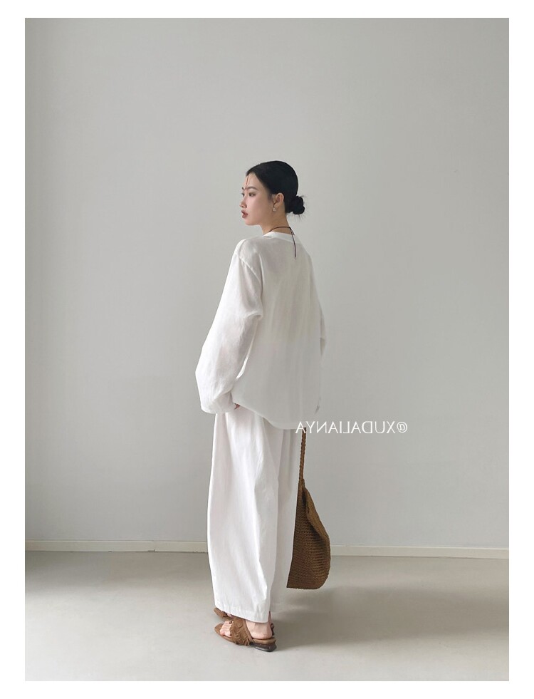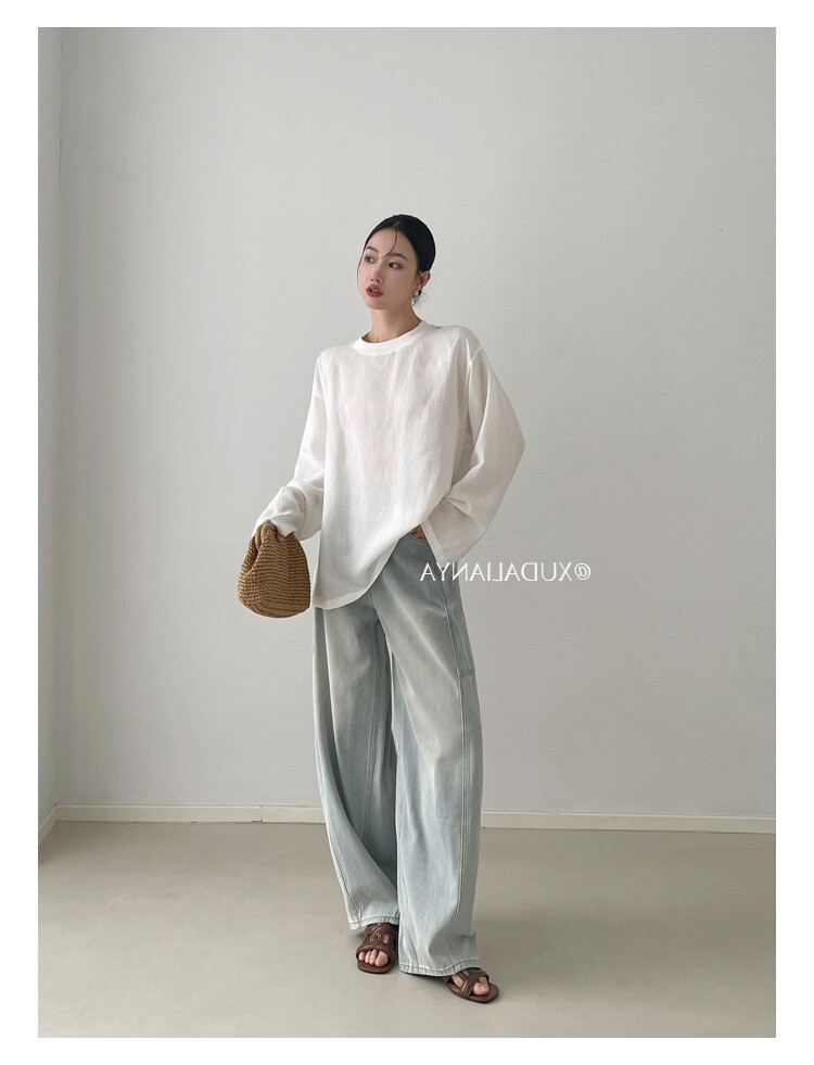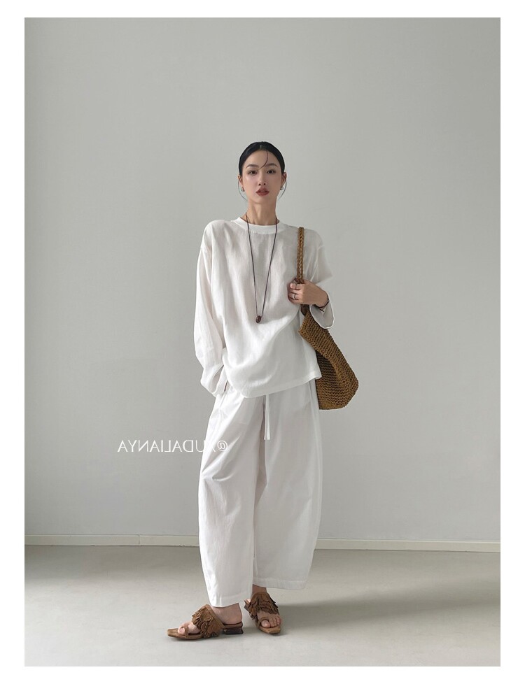 Old money style white linen long-sleeved shirt T-shirt for women early spring thin sun protection blouse loose round neck outer top