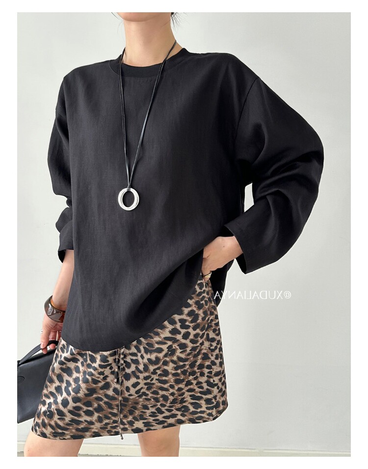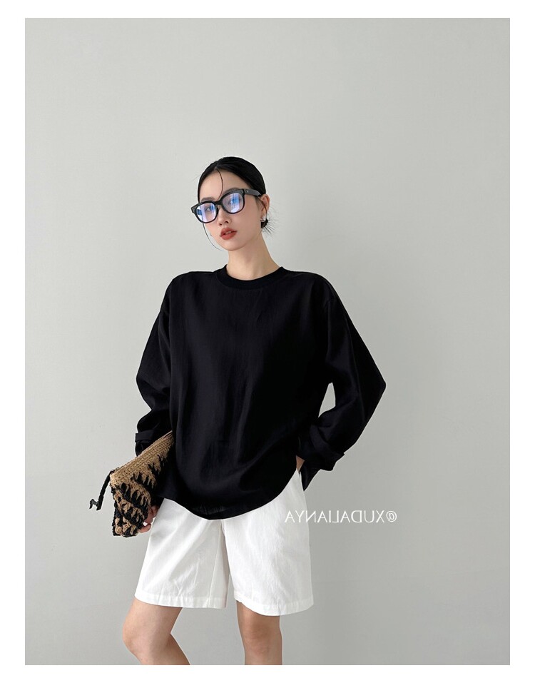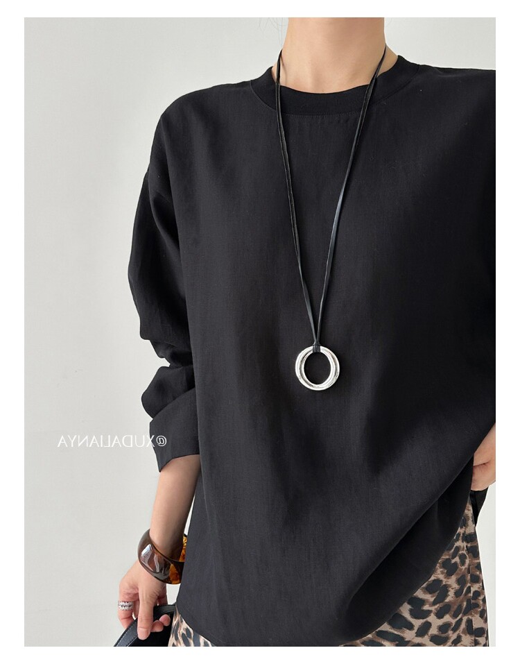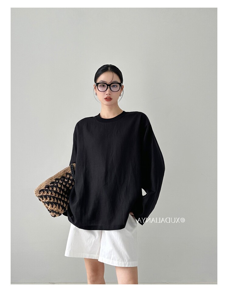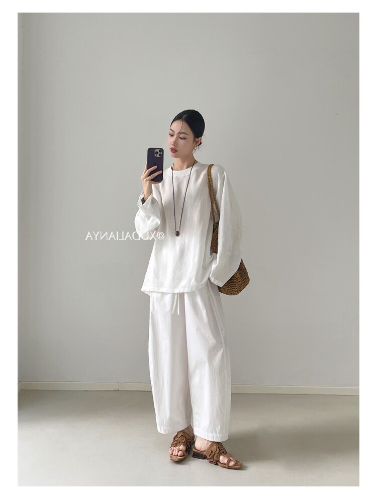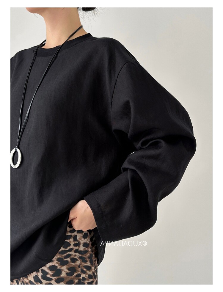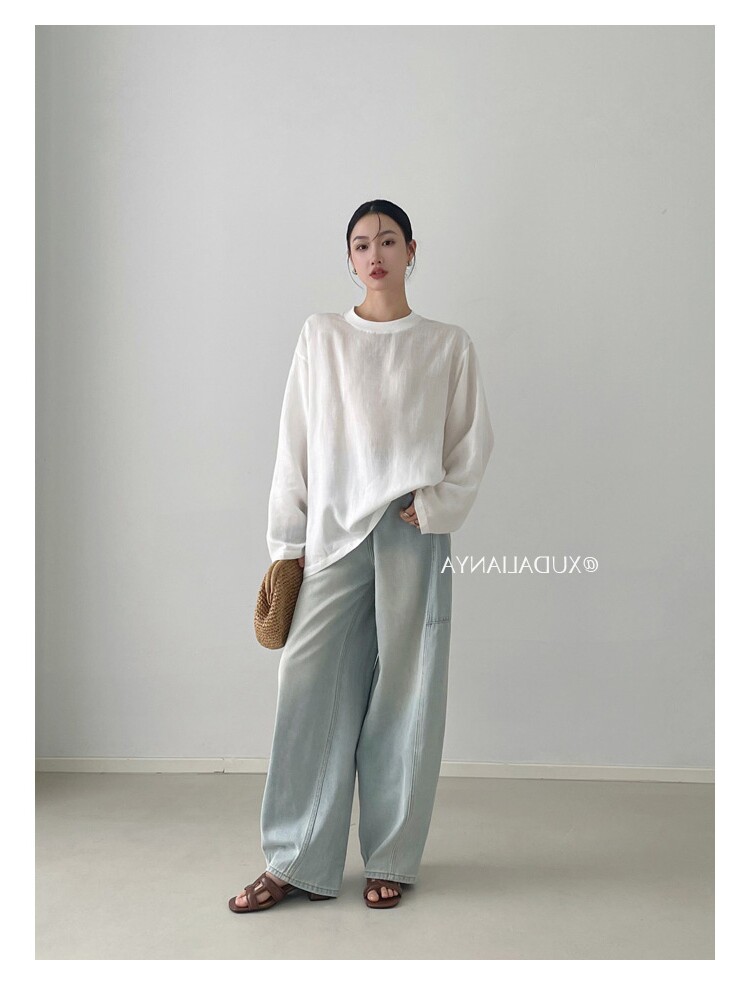 Old money style white linen long-sleeved shirt T-shirt for women early spring thin sun protection blouse loose round neck outer top