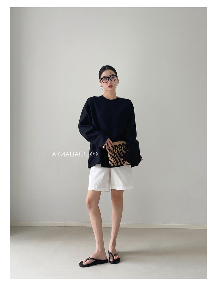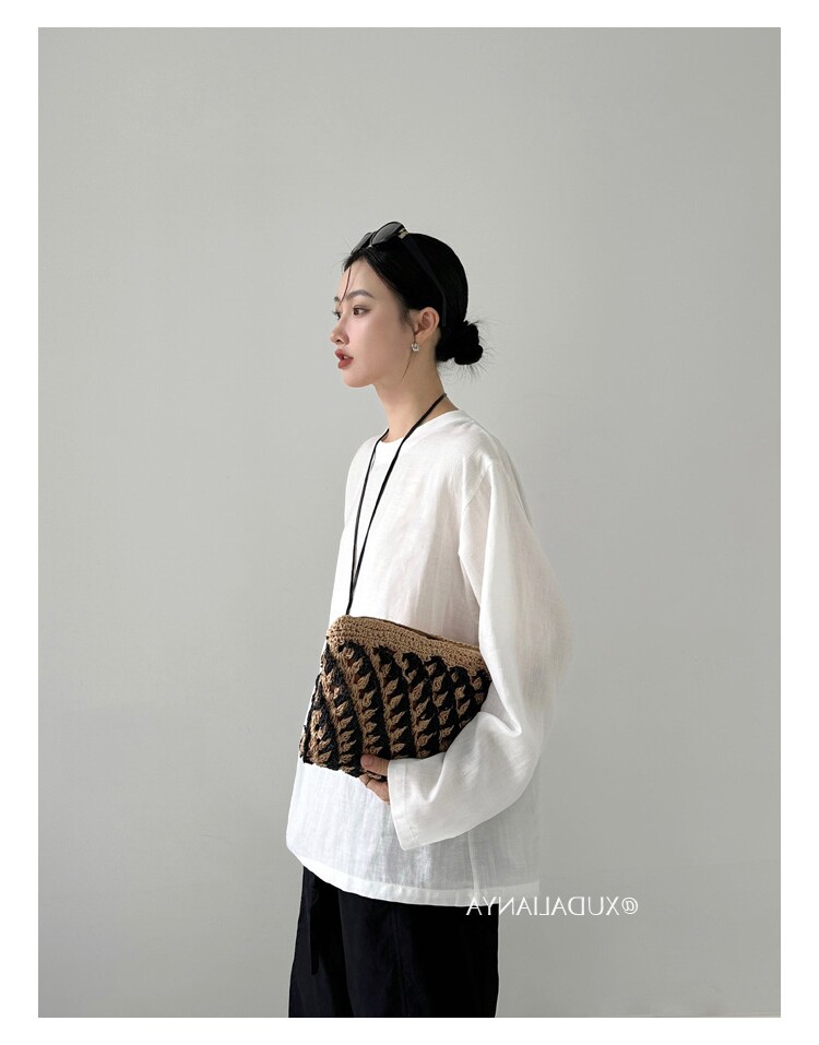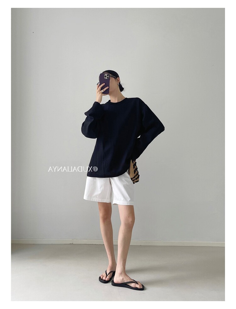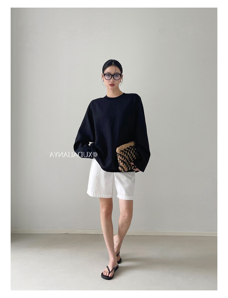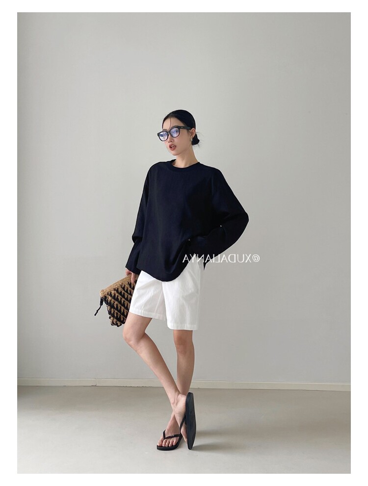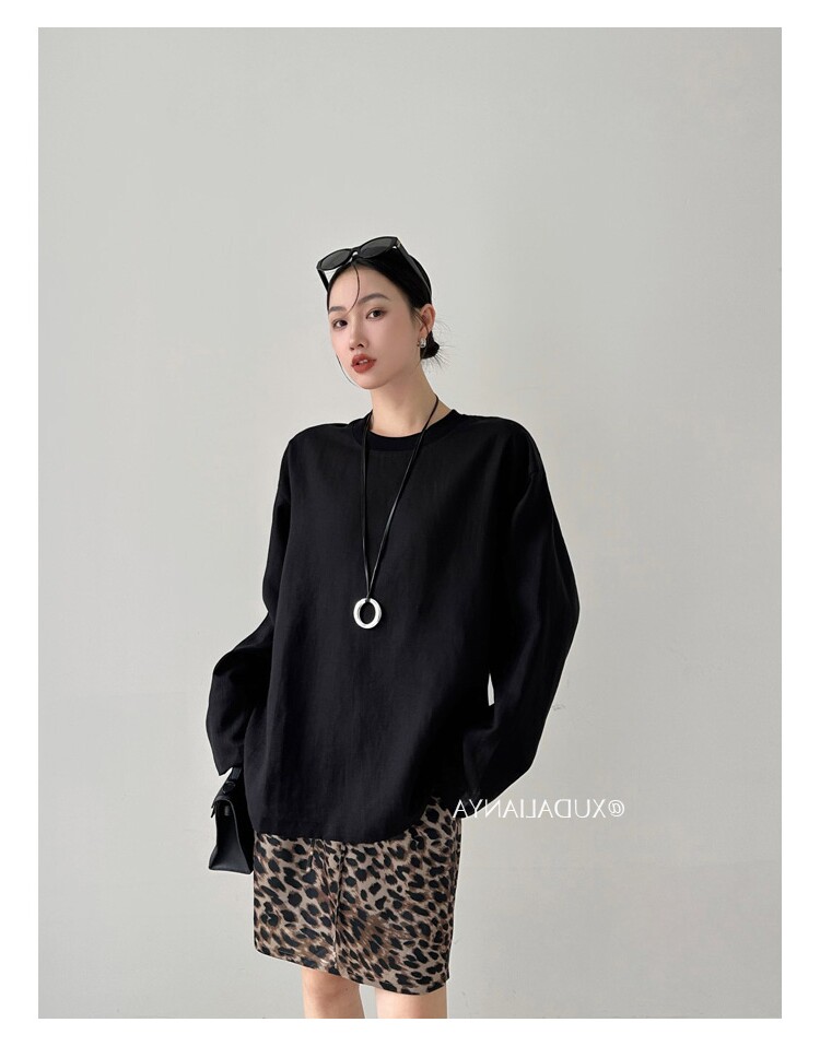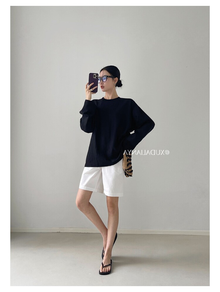 Old money style white linen long-sleeved shirt T-shirt for women early spring thin sun protection blouse loose round neck outer top