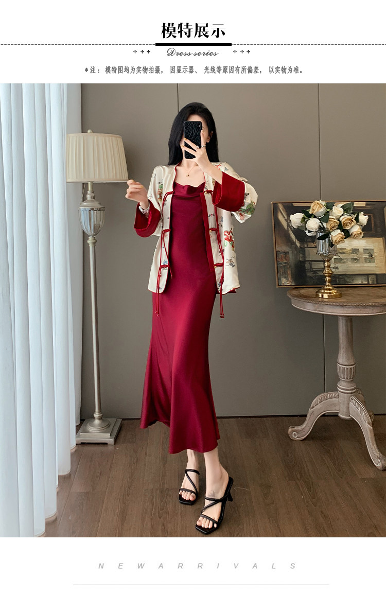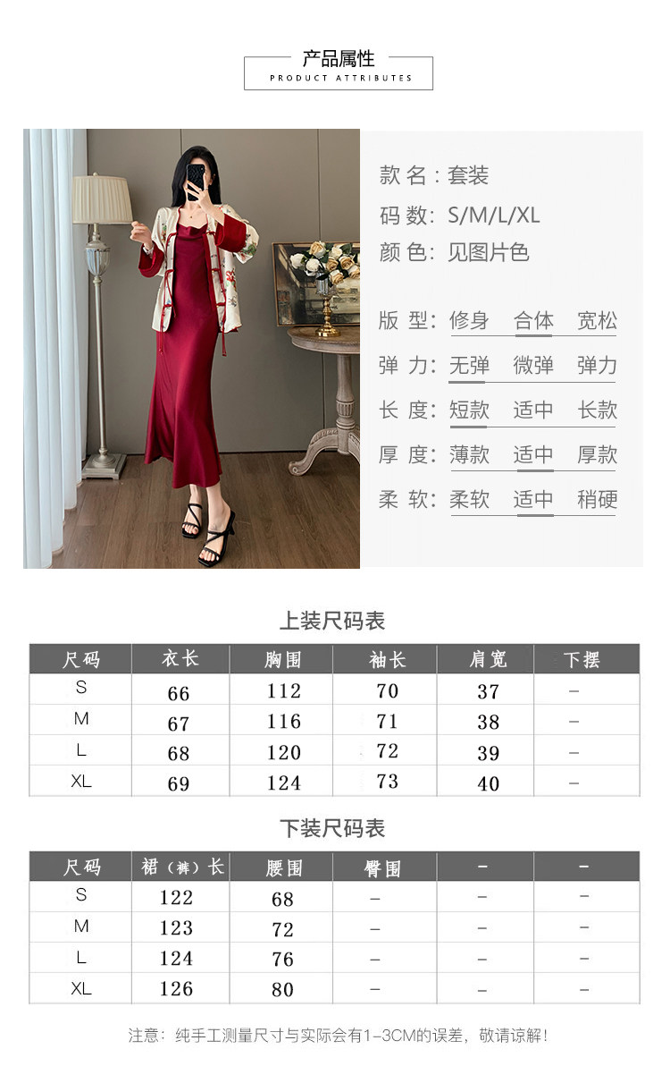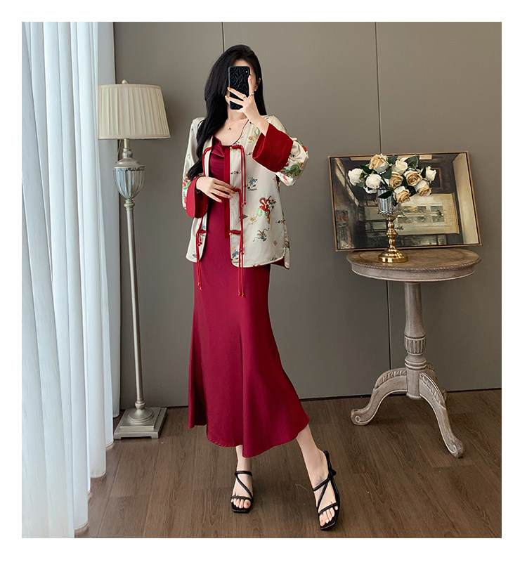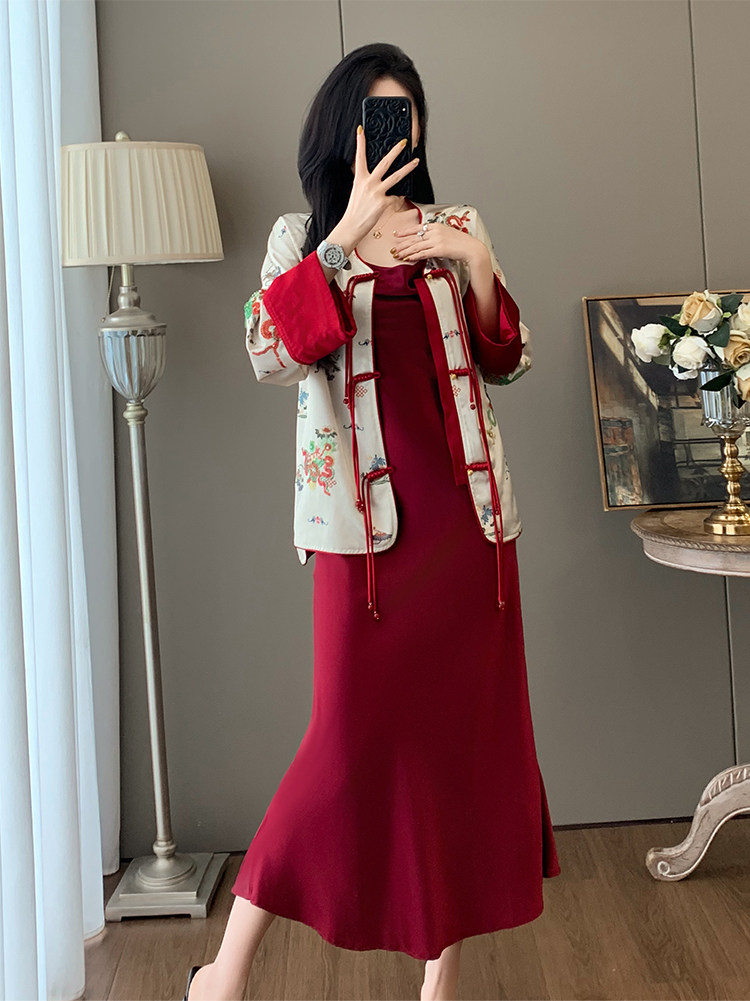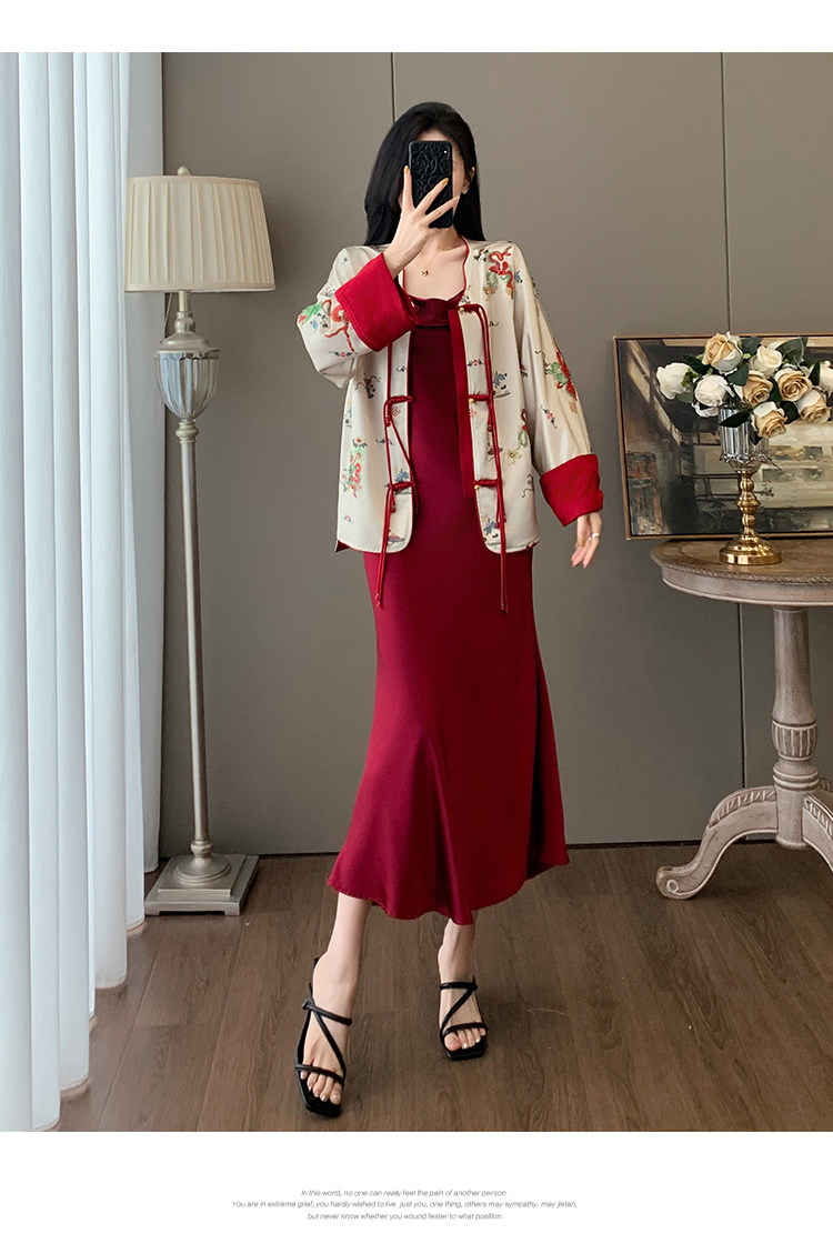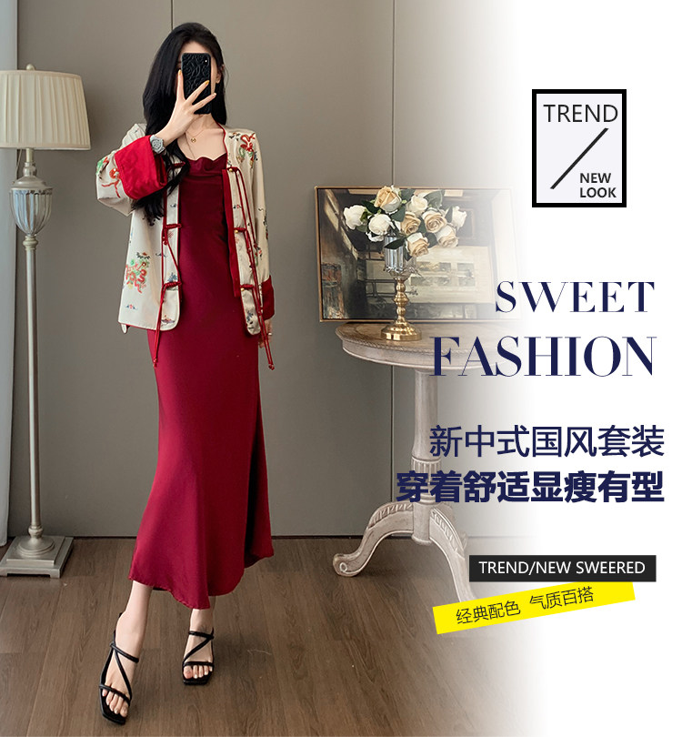 Fashionable New Chinese Style National Style Button-Up Retro Printed Top Women's Suit Elegant Lady Suspender Dress Two-Piece Set