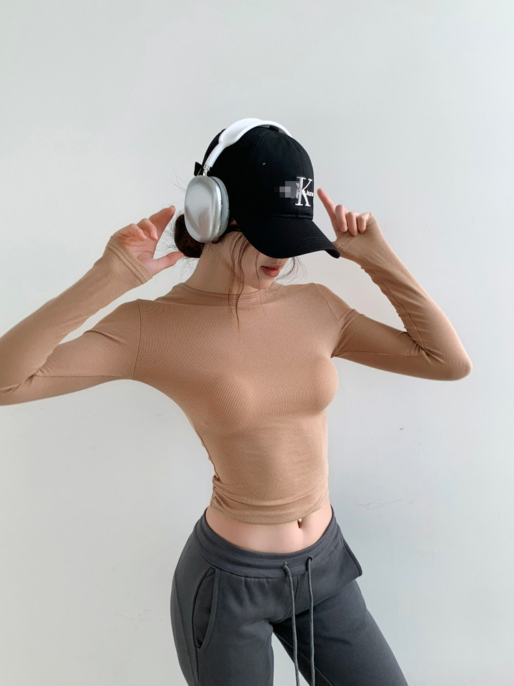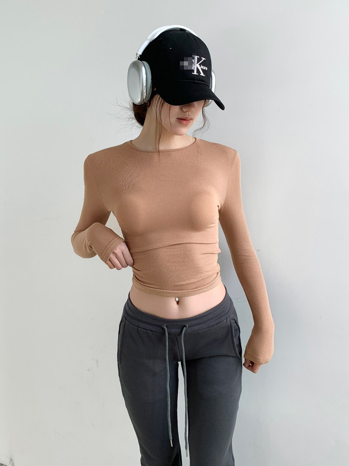 Melard Coffee-Colored Round-Neck Tight-Fitting Long-Sleeve T-Shirt for Women, Autumn and Winter American Style, Light and Mature, Slimming and Form-Fitting Base Layer Top