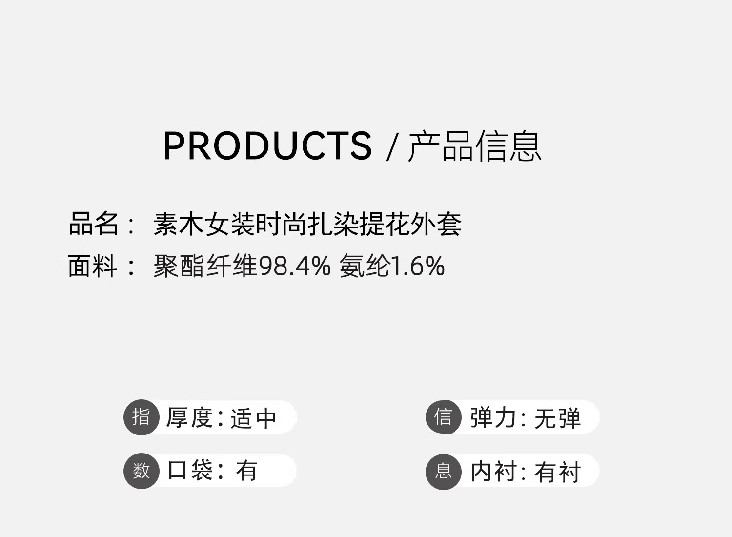 Material ingredients Polyester fiber 98.4% polyurethane elastic fiber (spandex) 1.6%