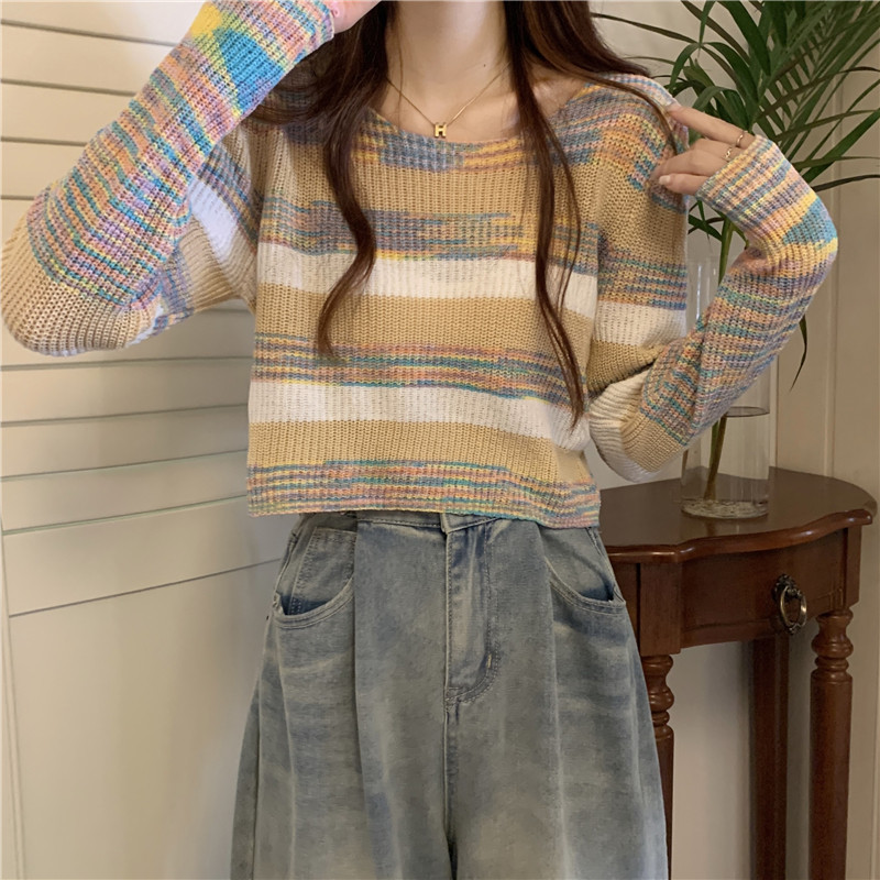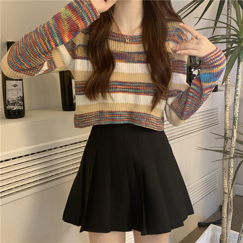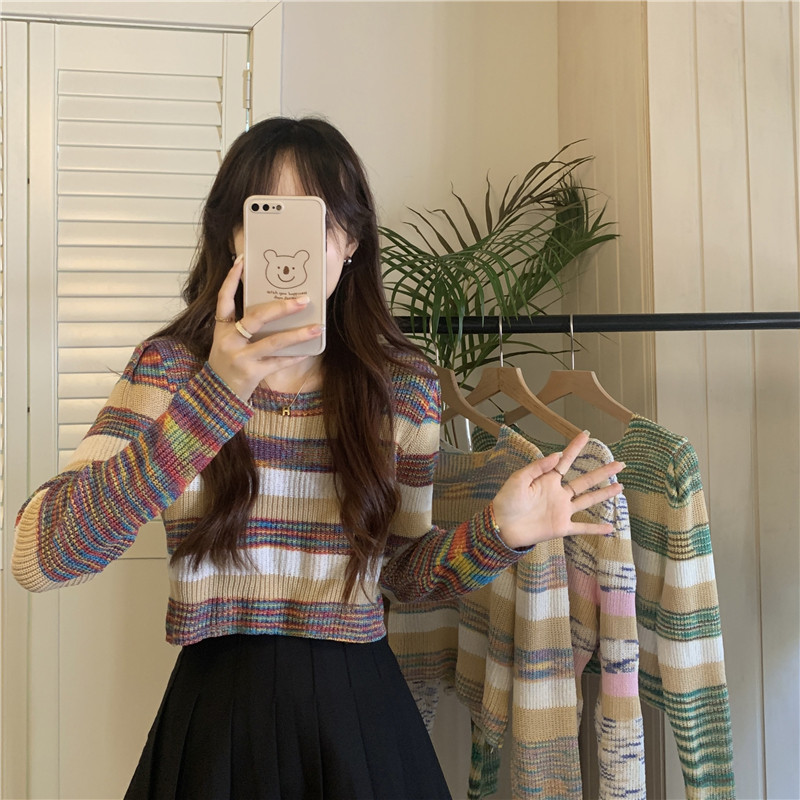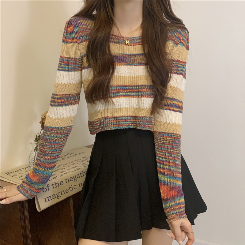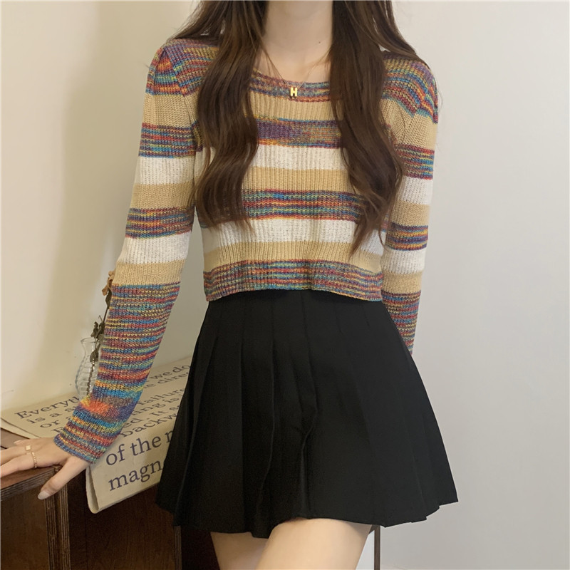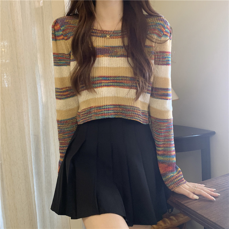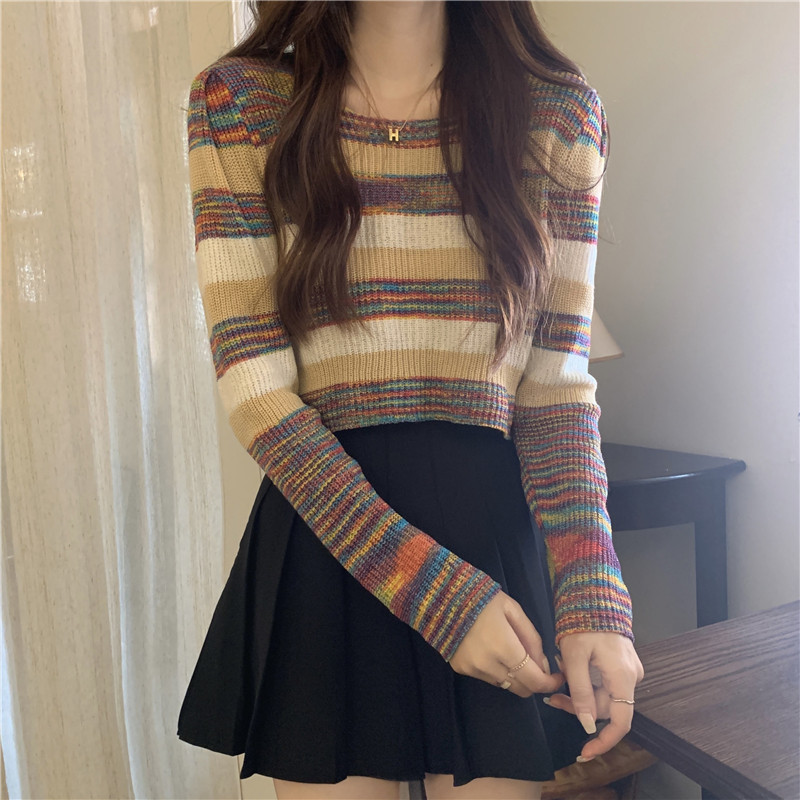 Petite Rainbow Striped Knit Sweater for Women, New Autumn Vintage Style, Round Neck, High Waist, Short Length, Long Sleeve Sweater