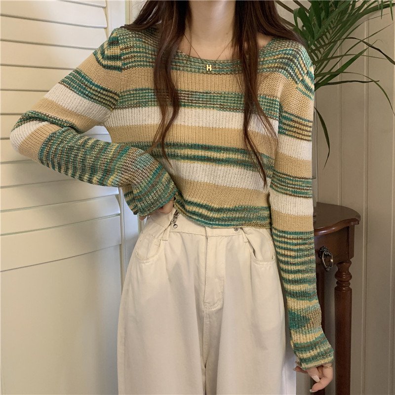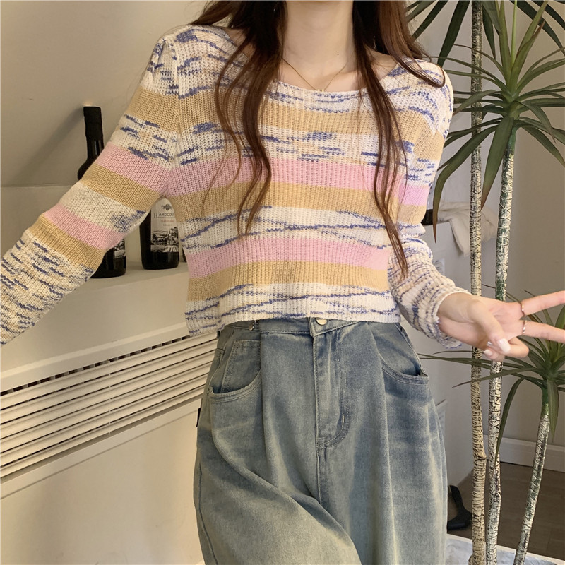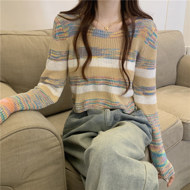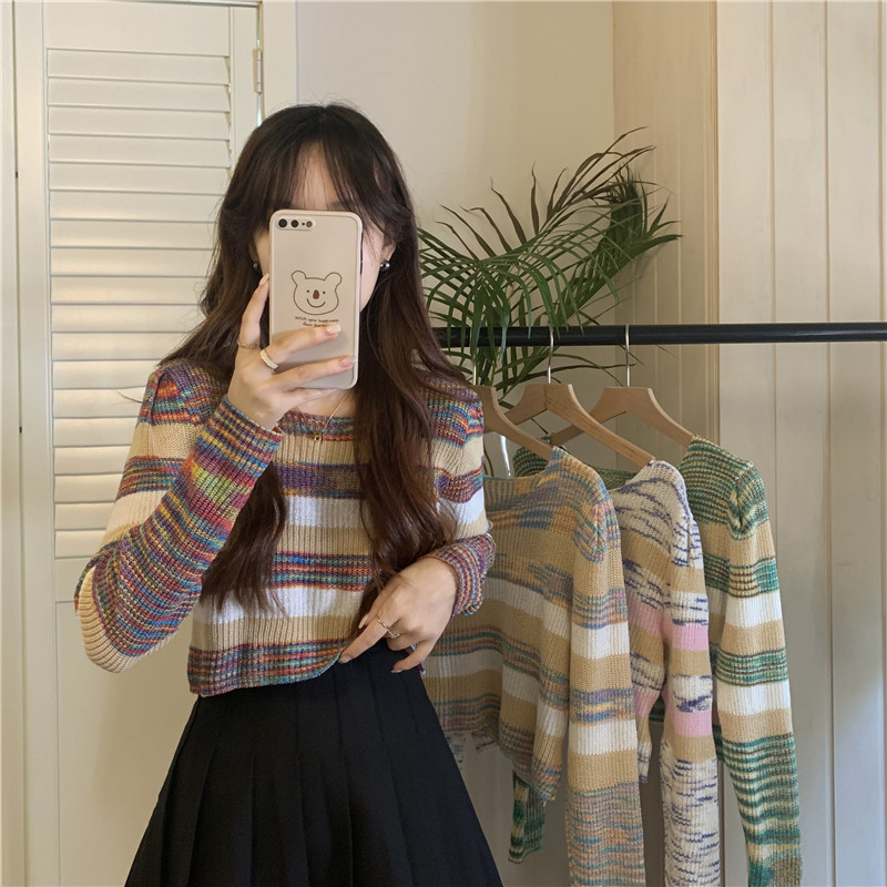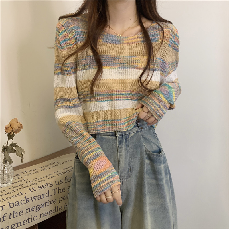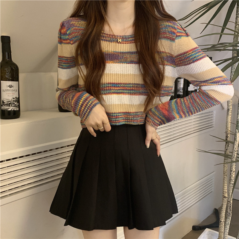 Petite Rainbow Striped Knit Sweater for Women, New Autumn Vintage Style, Round Neck, High Waist, Short Length, Long Sleeve Sweater