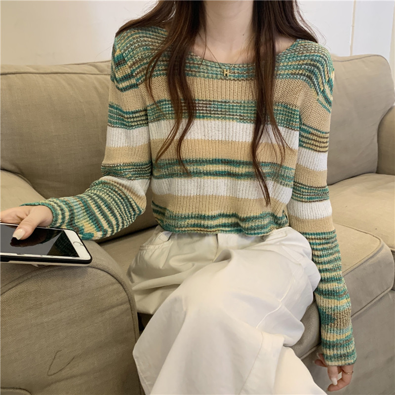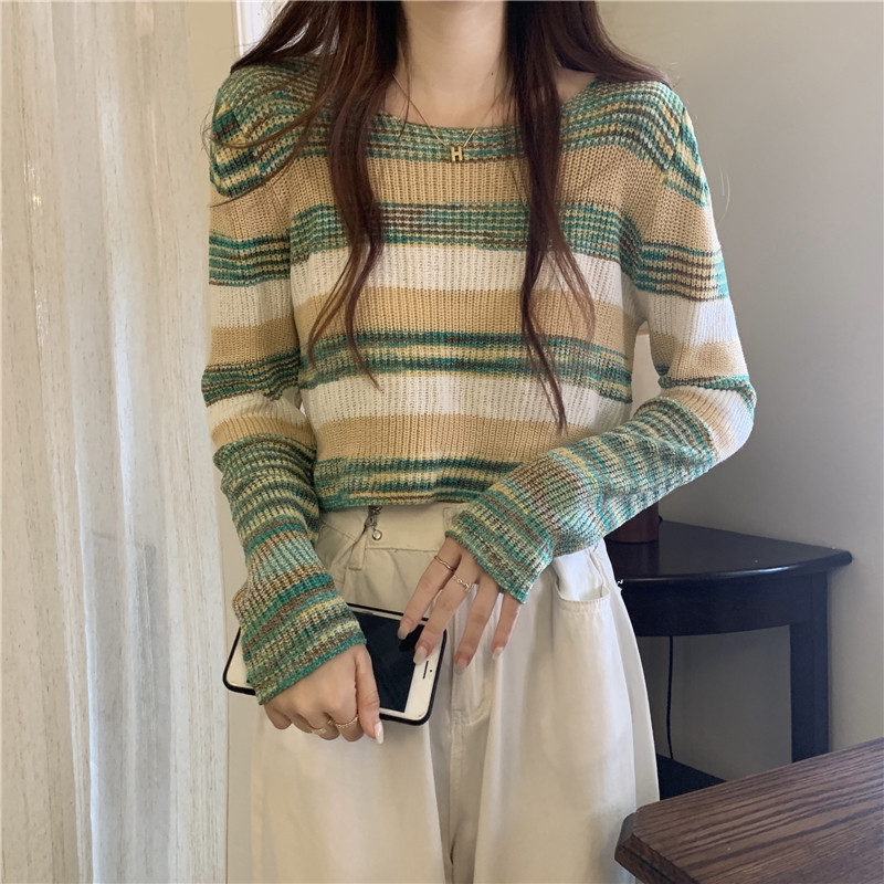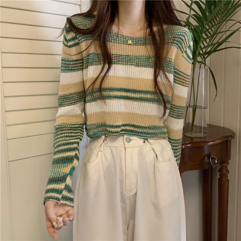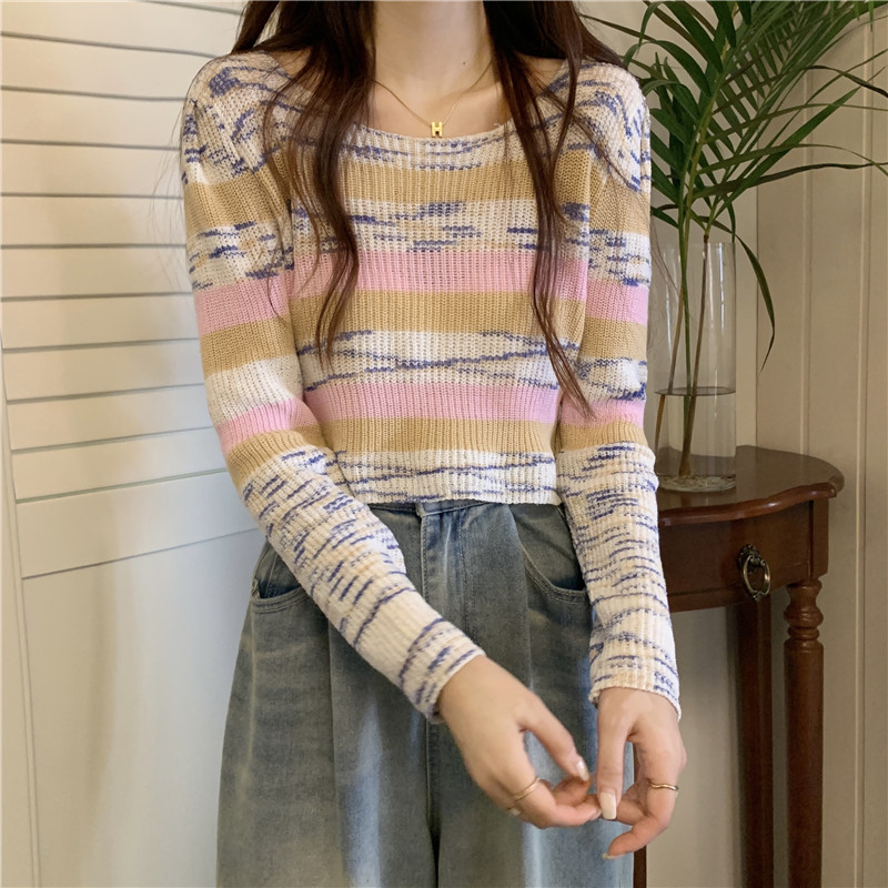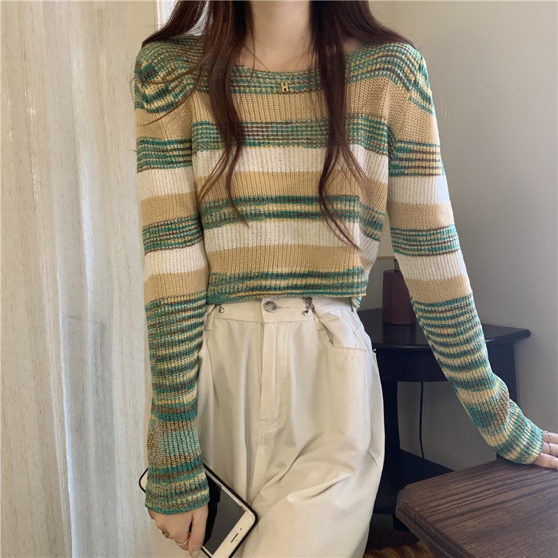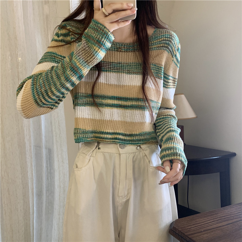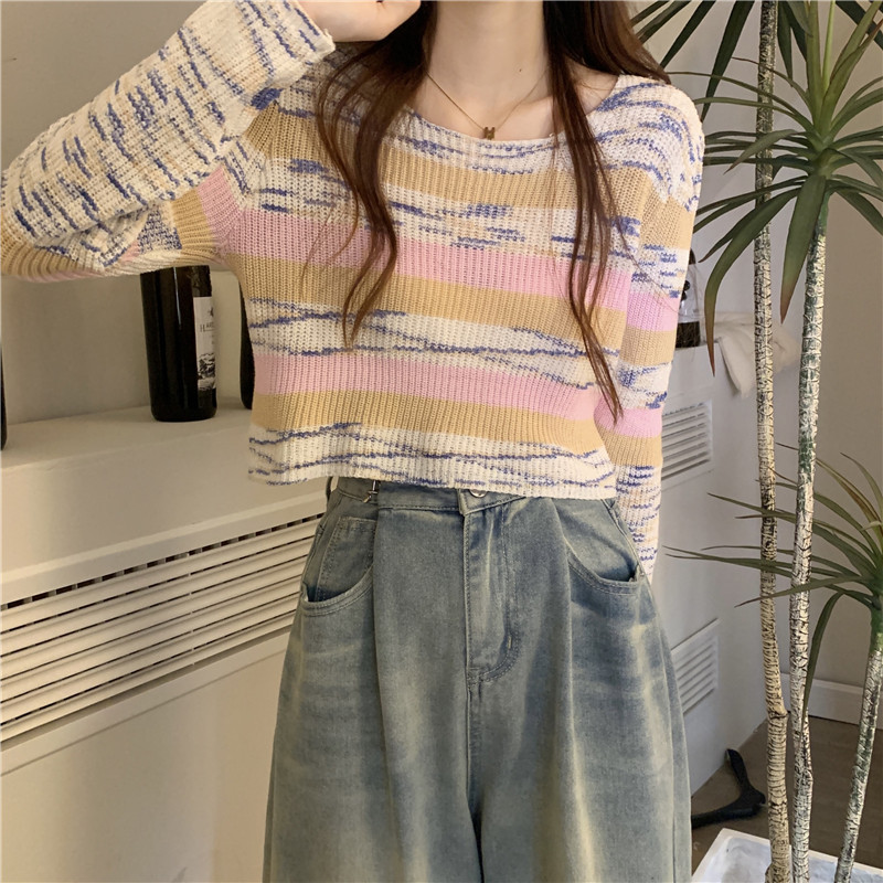 Petite Rainbow Striped Knit Sweater for Women, New Autumn Vintage Style, Round Neck, High Waist, Short Length, Long Sleeve Sweater