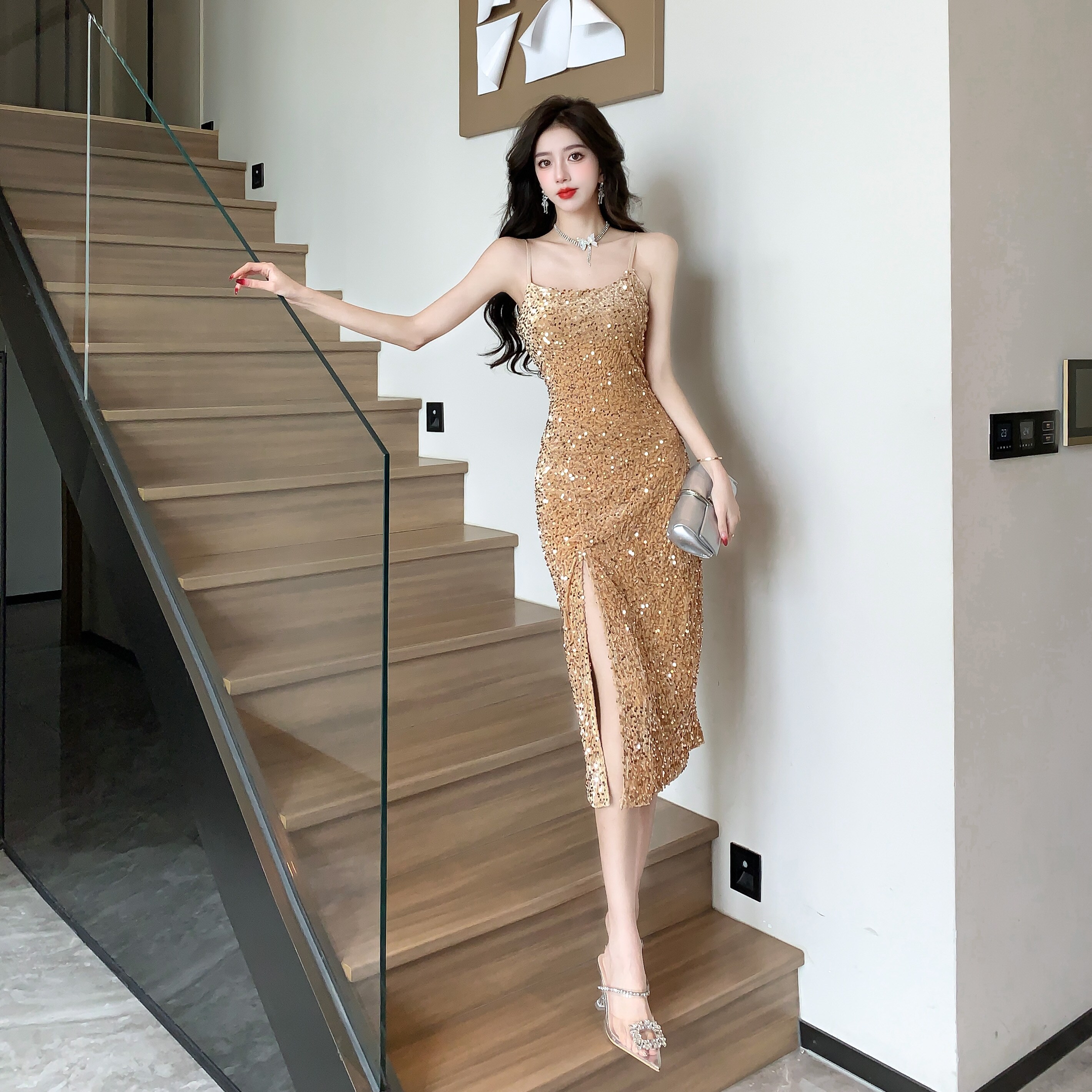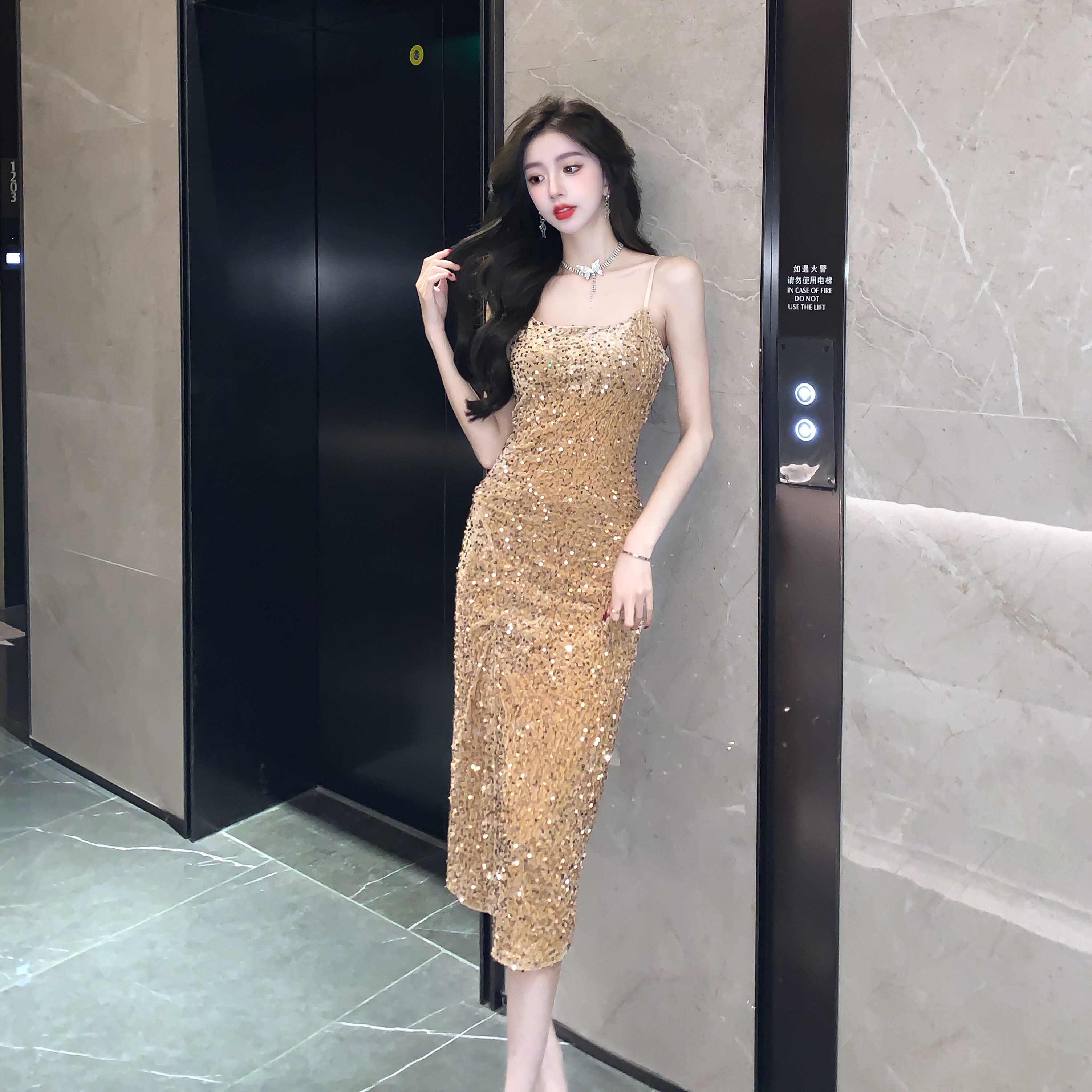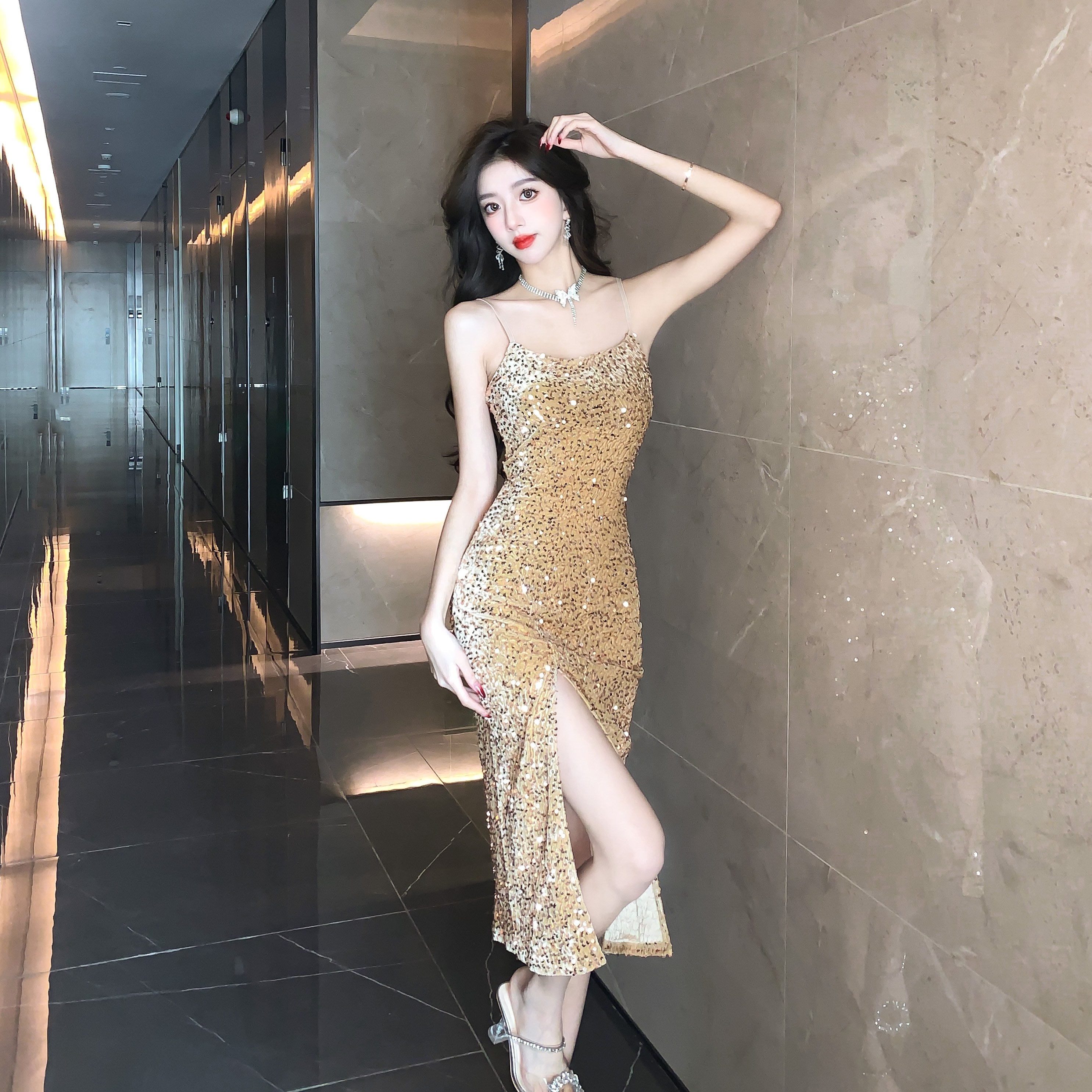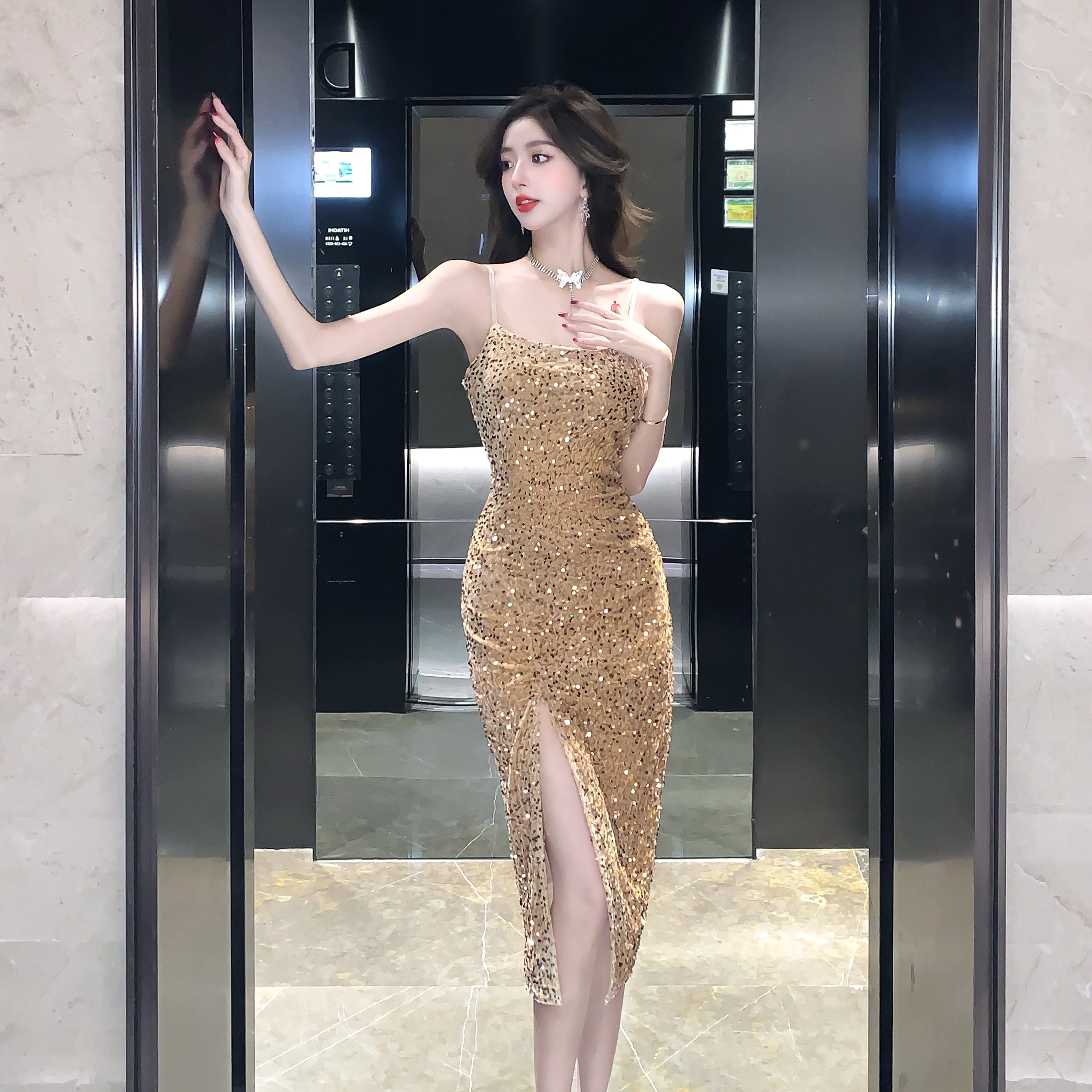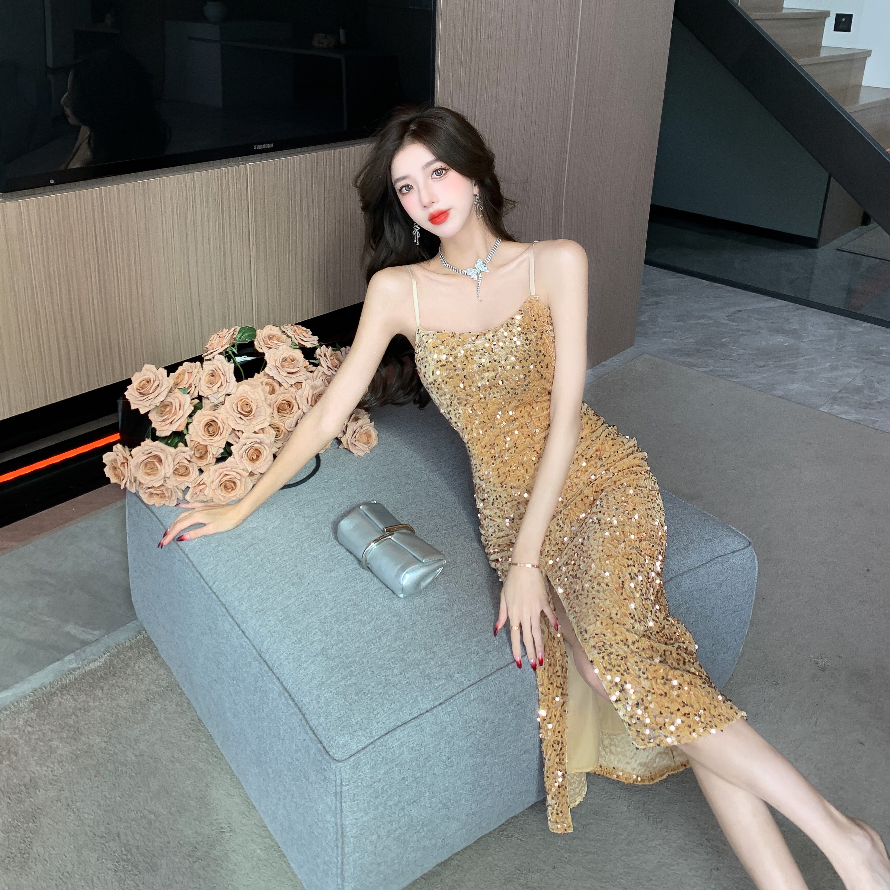 Gold High-End Sequin Suspender Dress for Women, Shiny, Light Luxury, Elegant, Classy Party Evening Dress