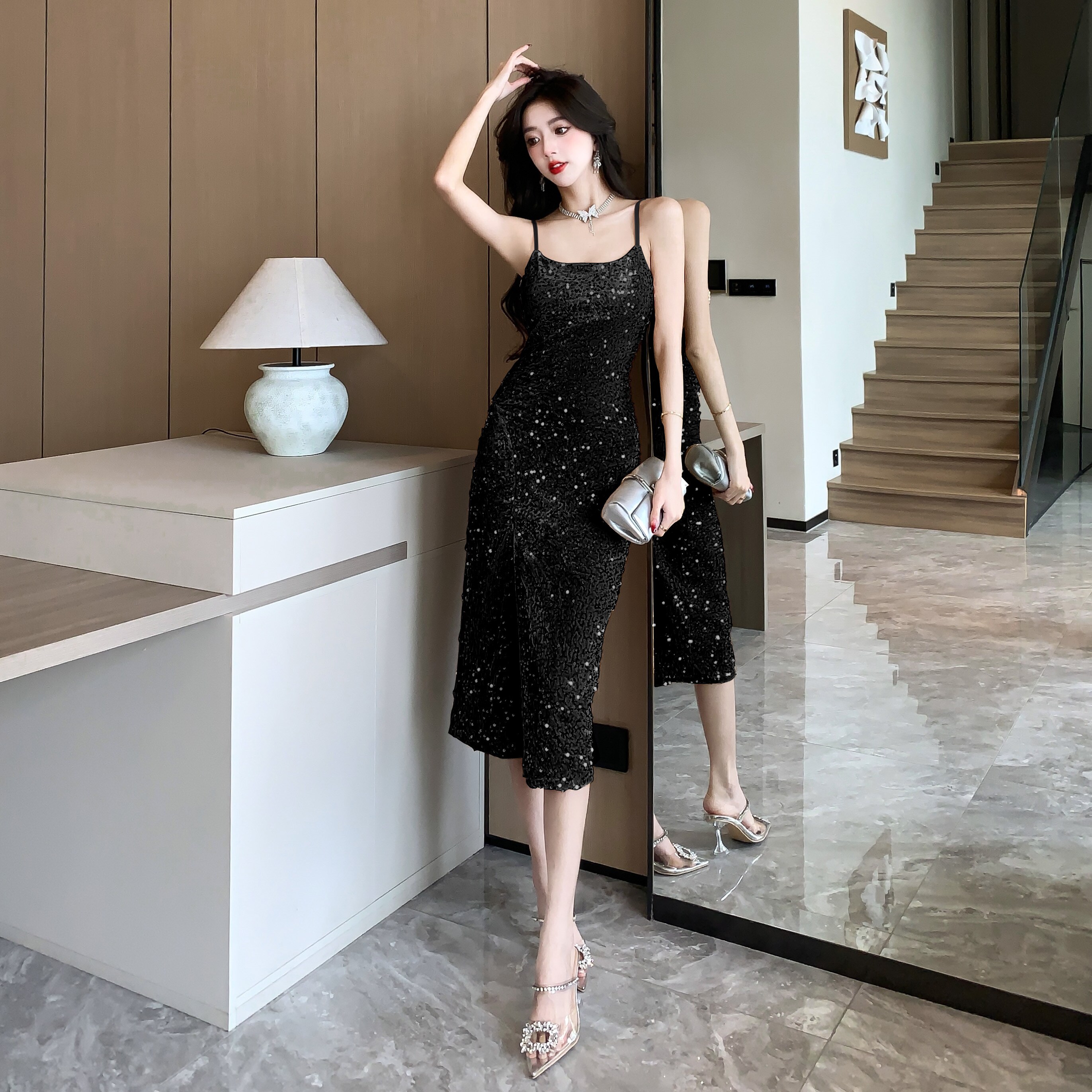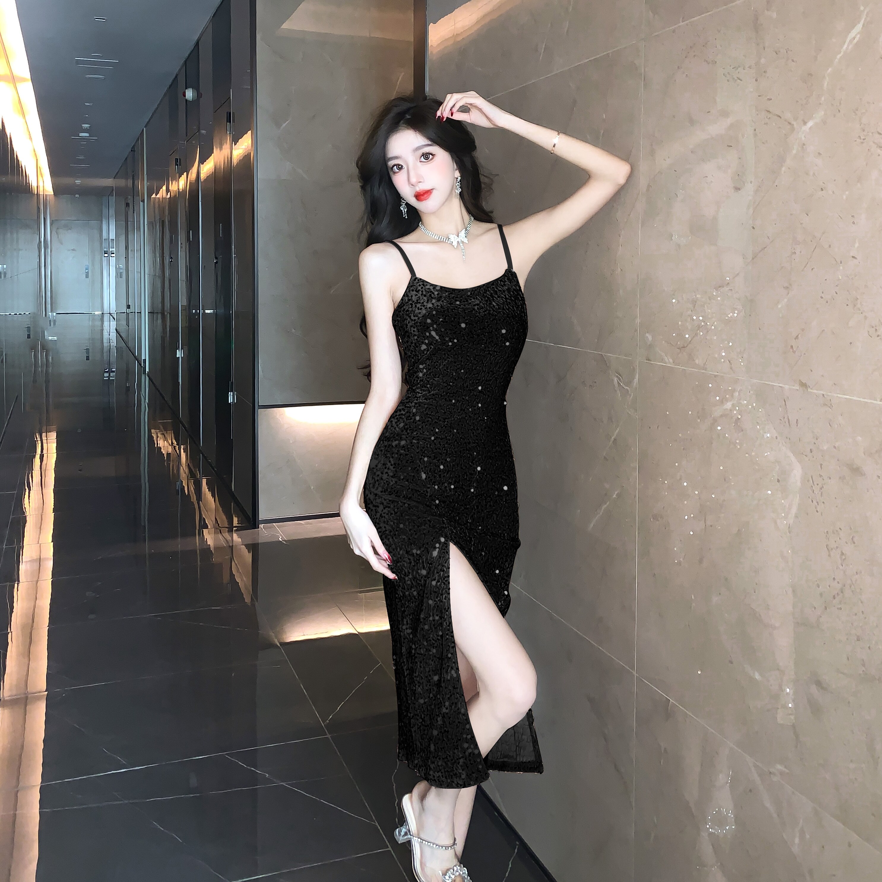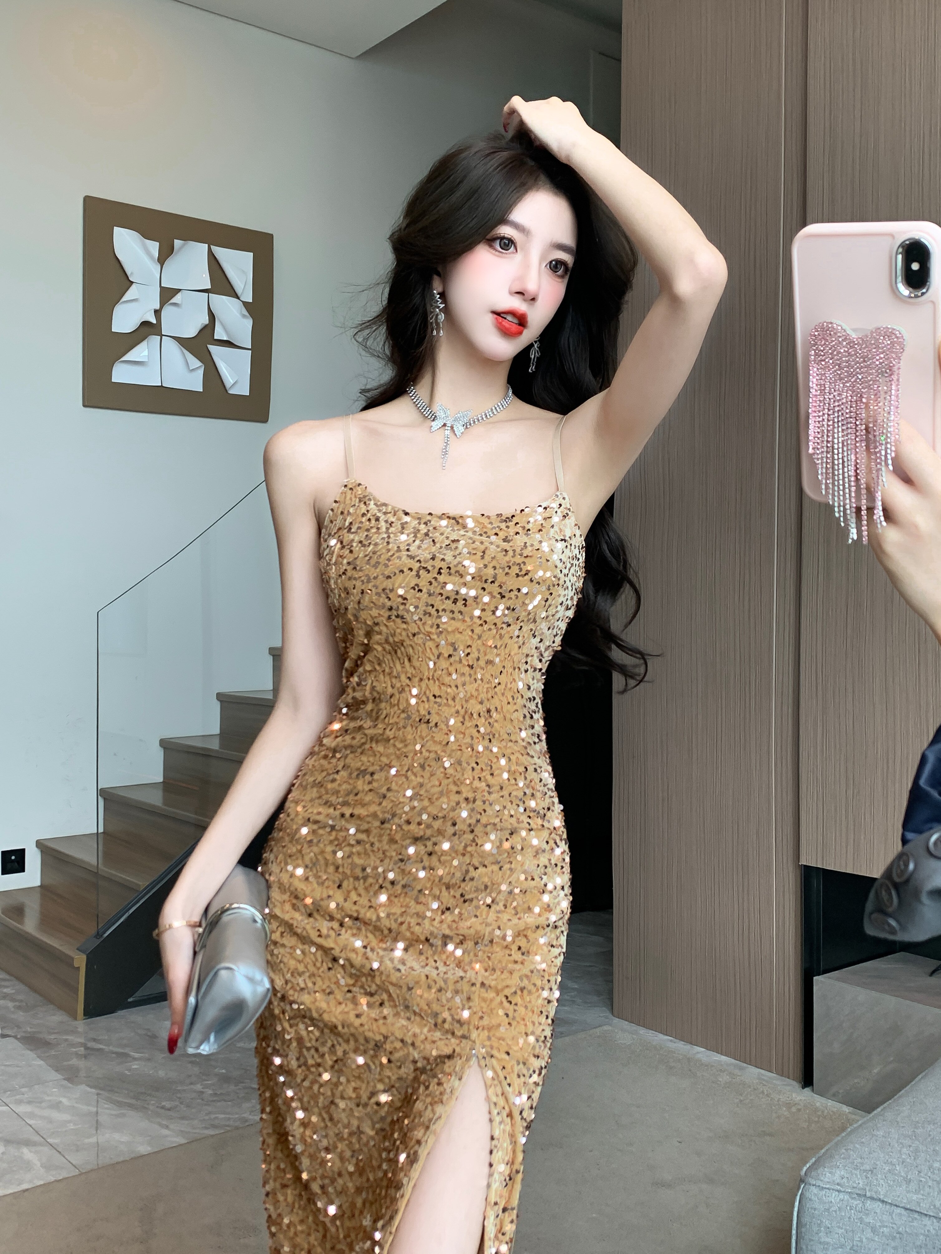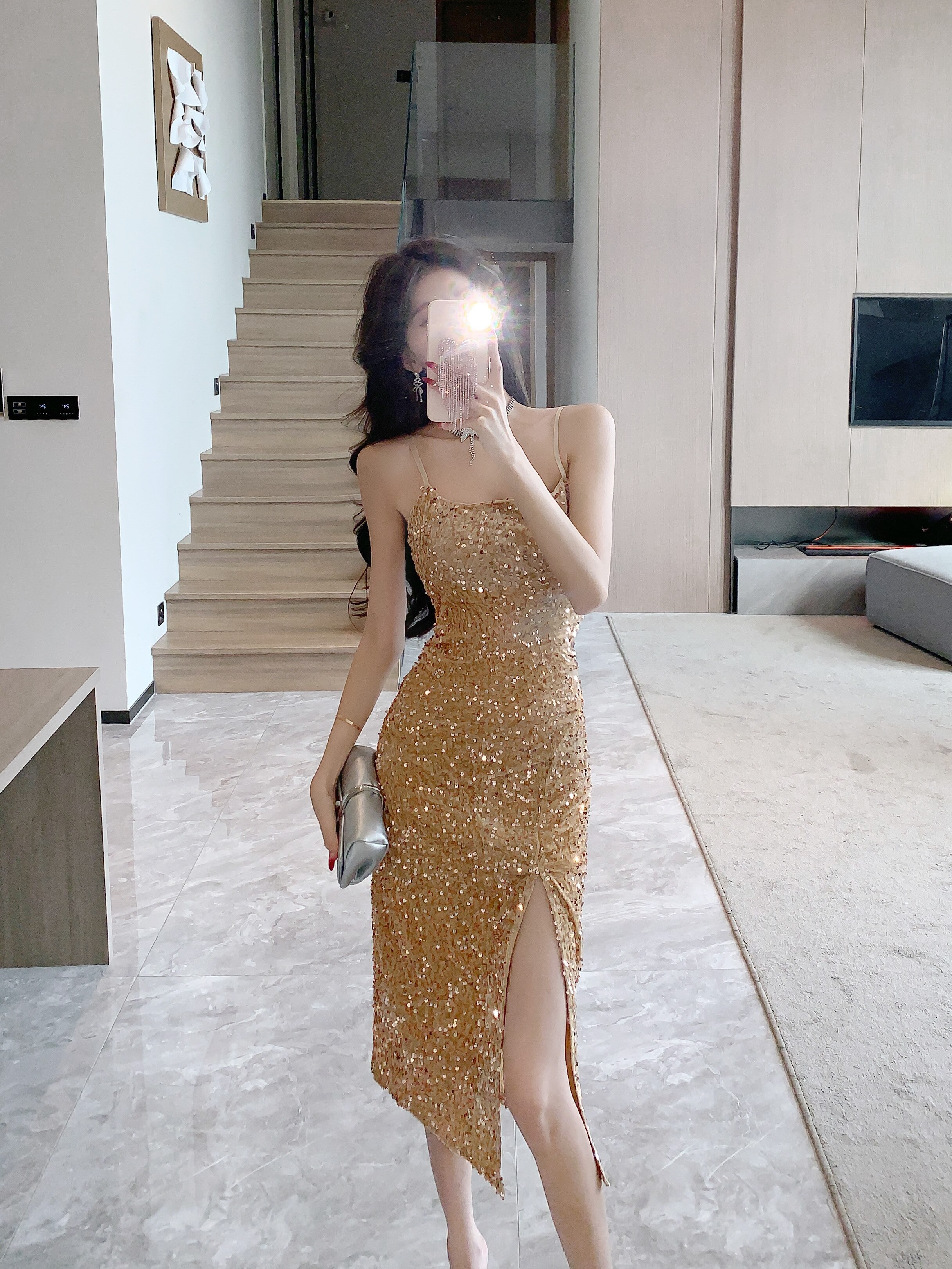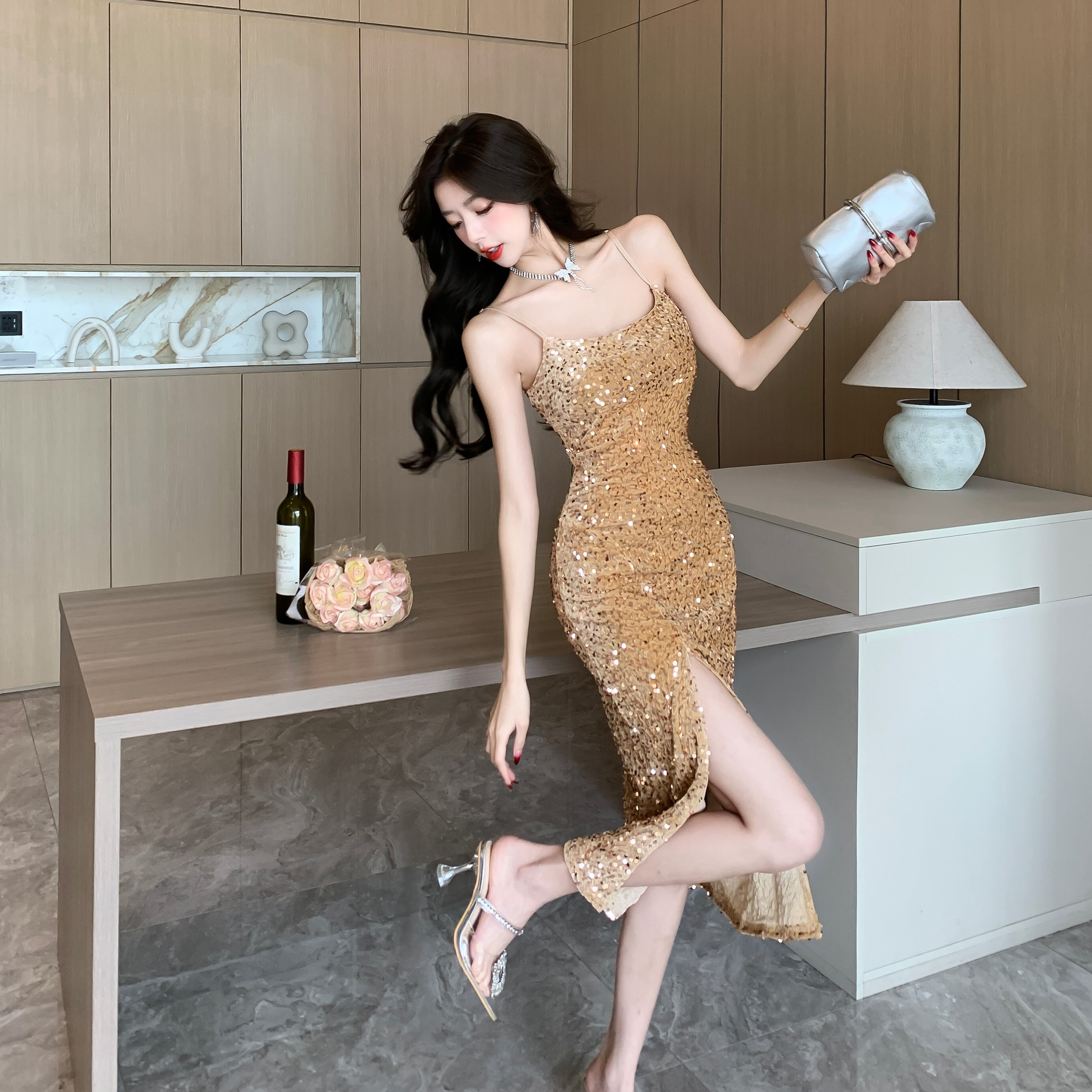 Gold High-End Sequin Suspender Dress for Women, Shiny, Light Luxury, Elegant, Classy Party Evening Dress