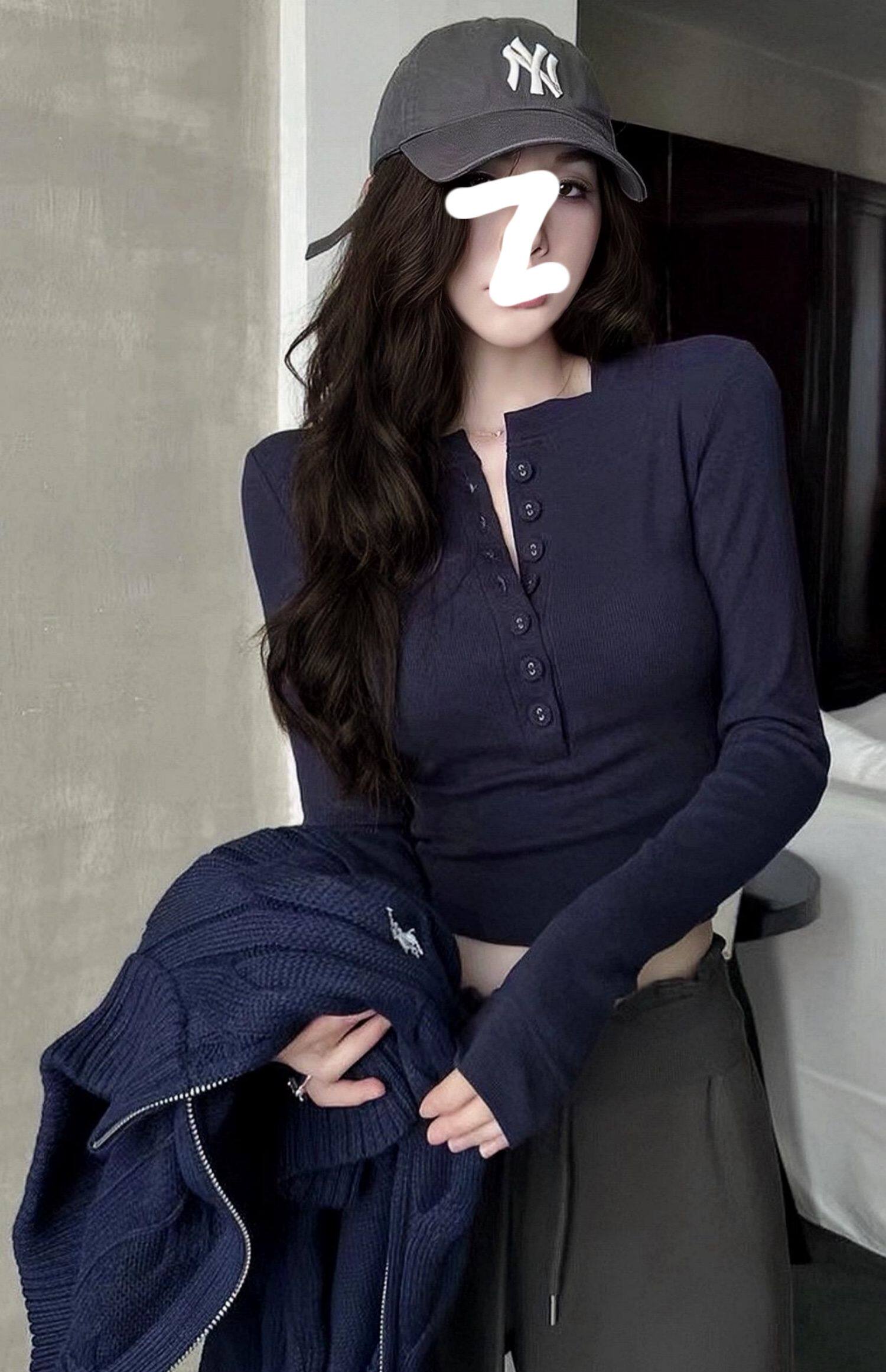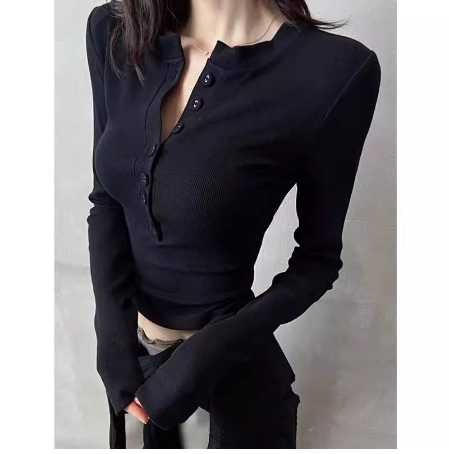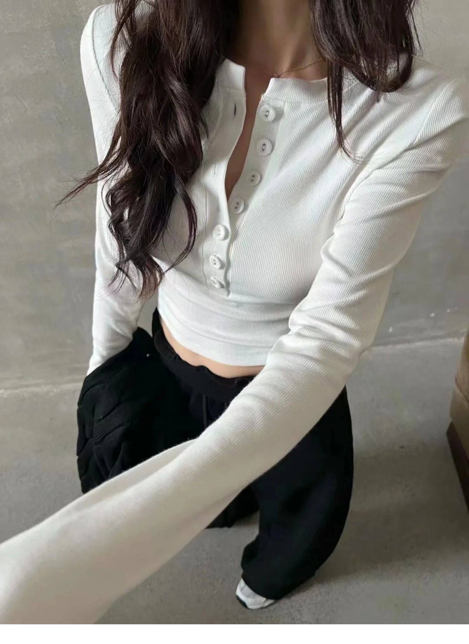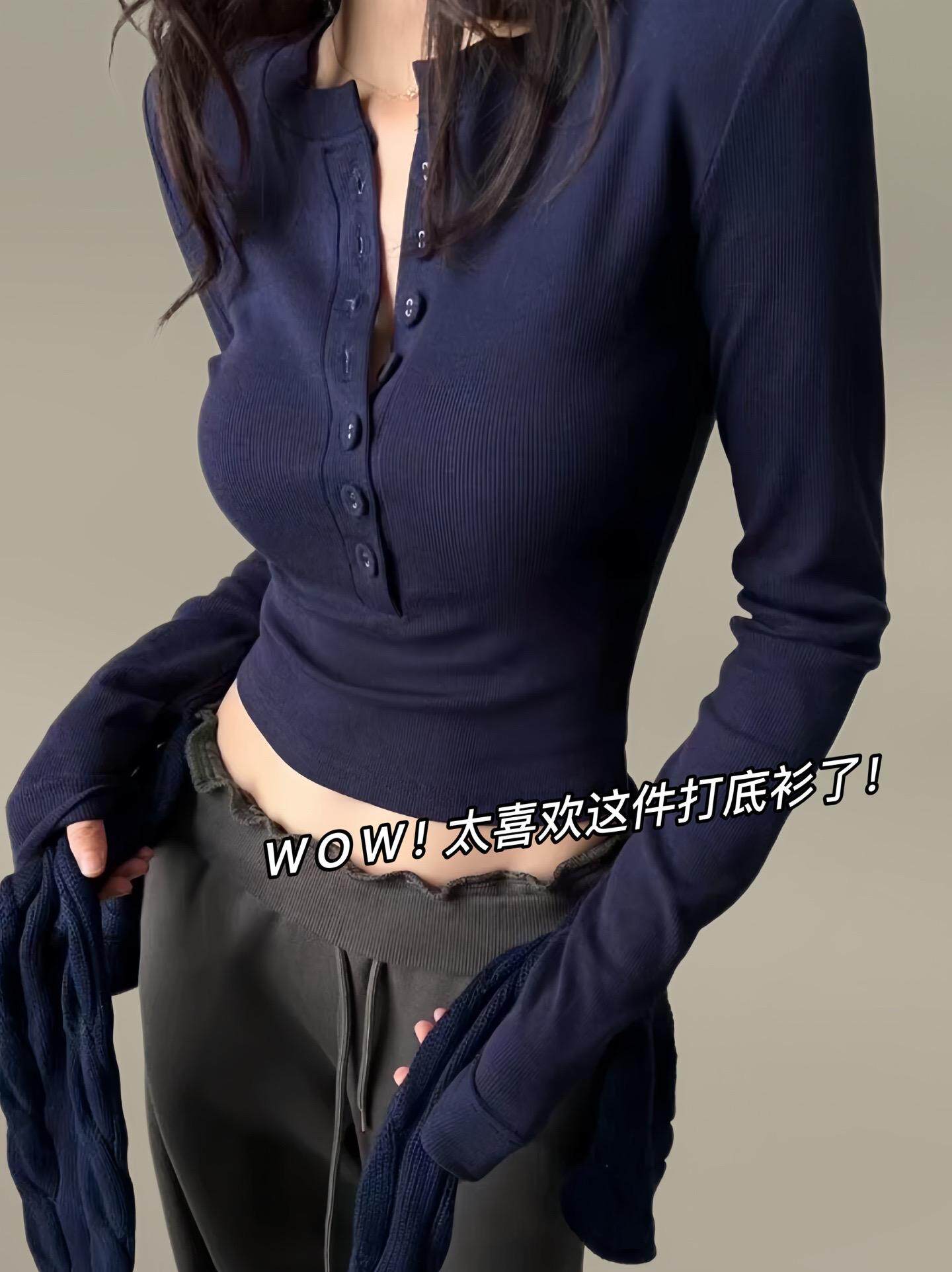 American-Style Spicy Girl Single-Breasted Long-Sleeve T-Shirt for Women, Early Autumn, Slim Fit, Inner Layer, Unique Shoulder Design Top