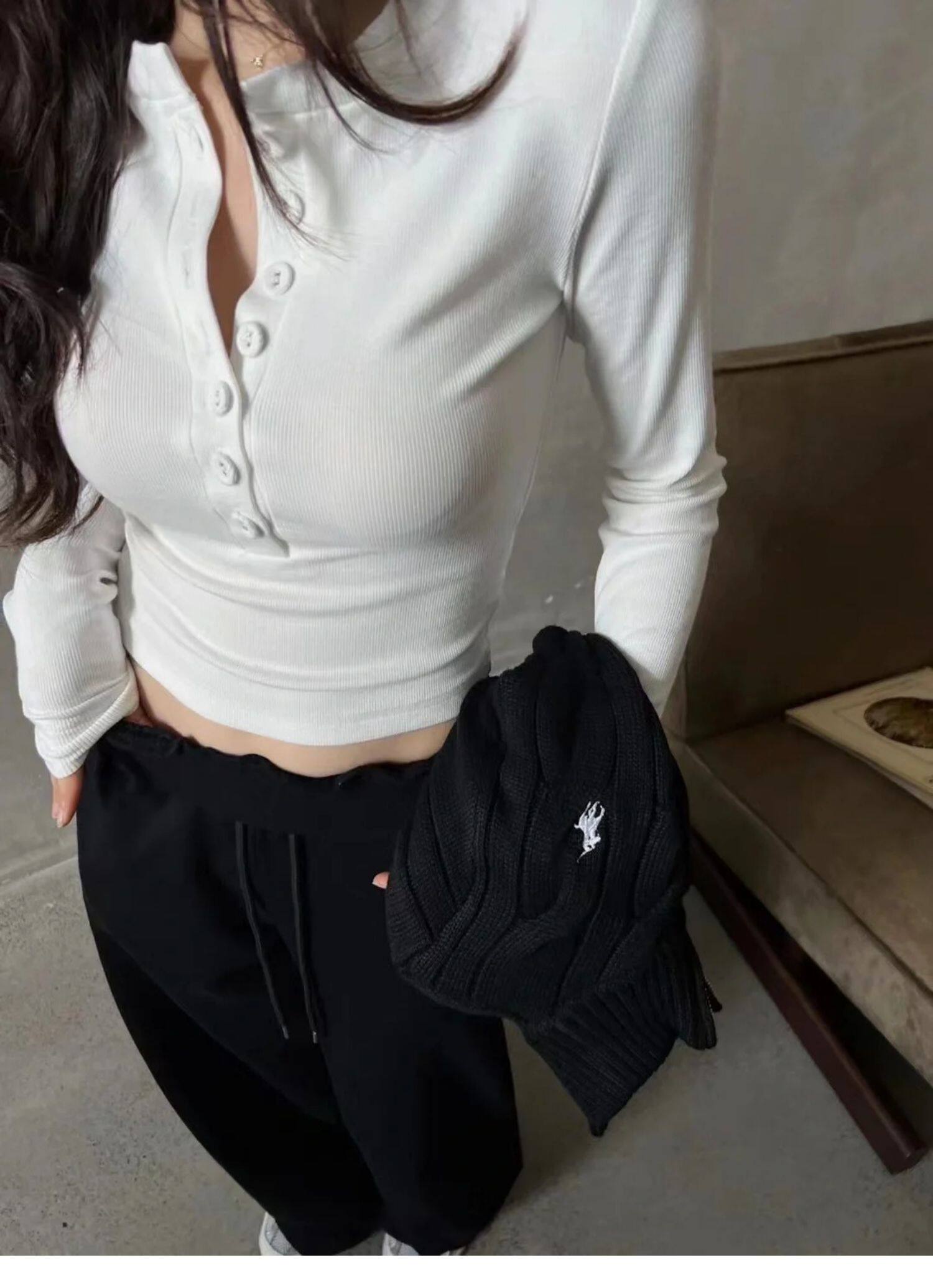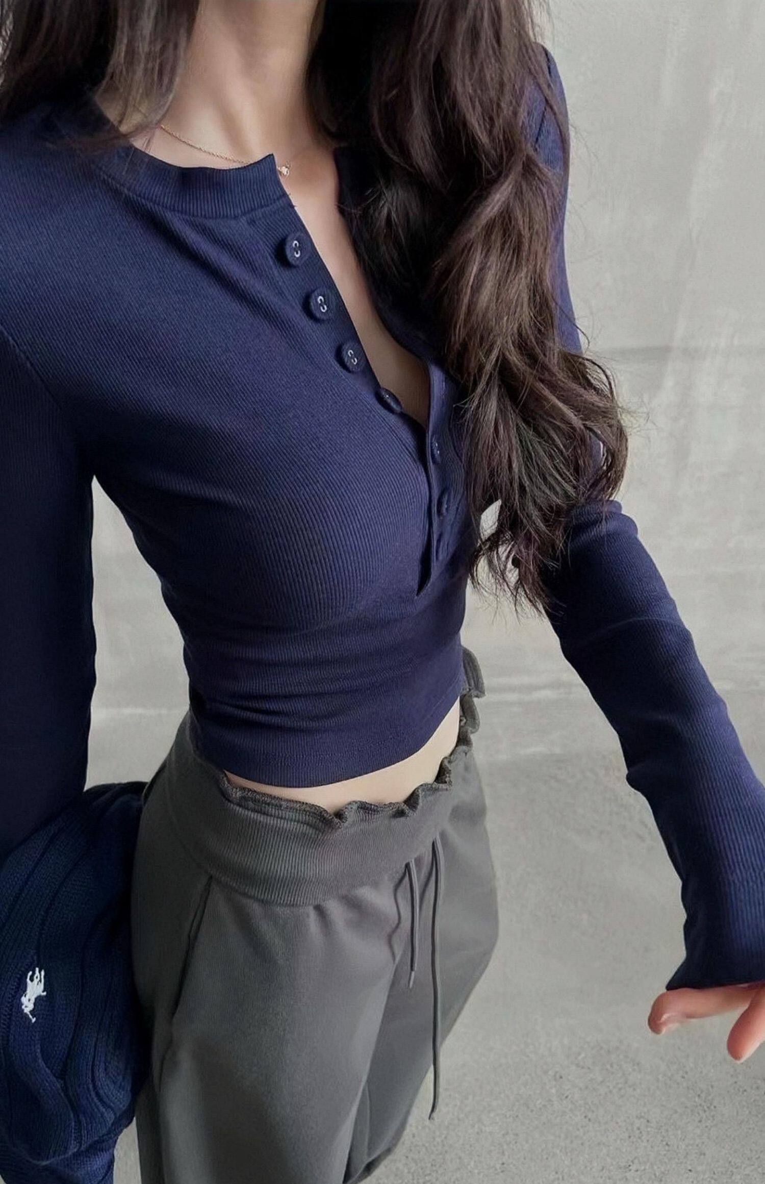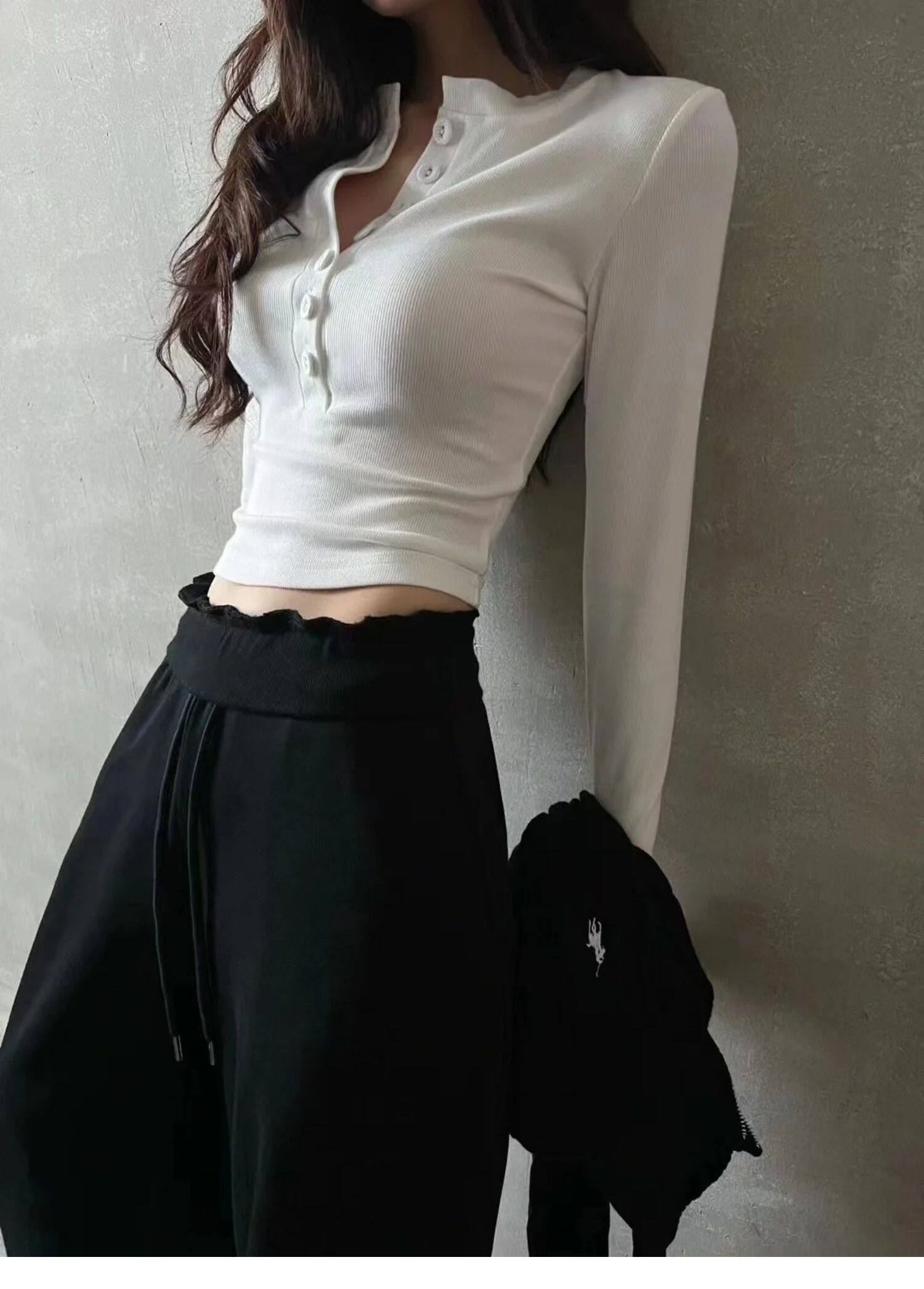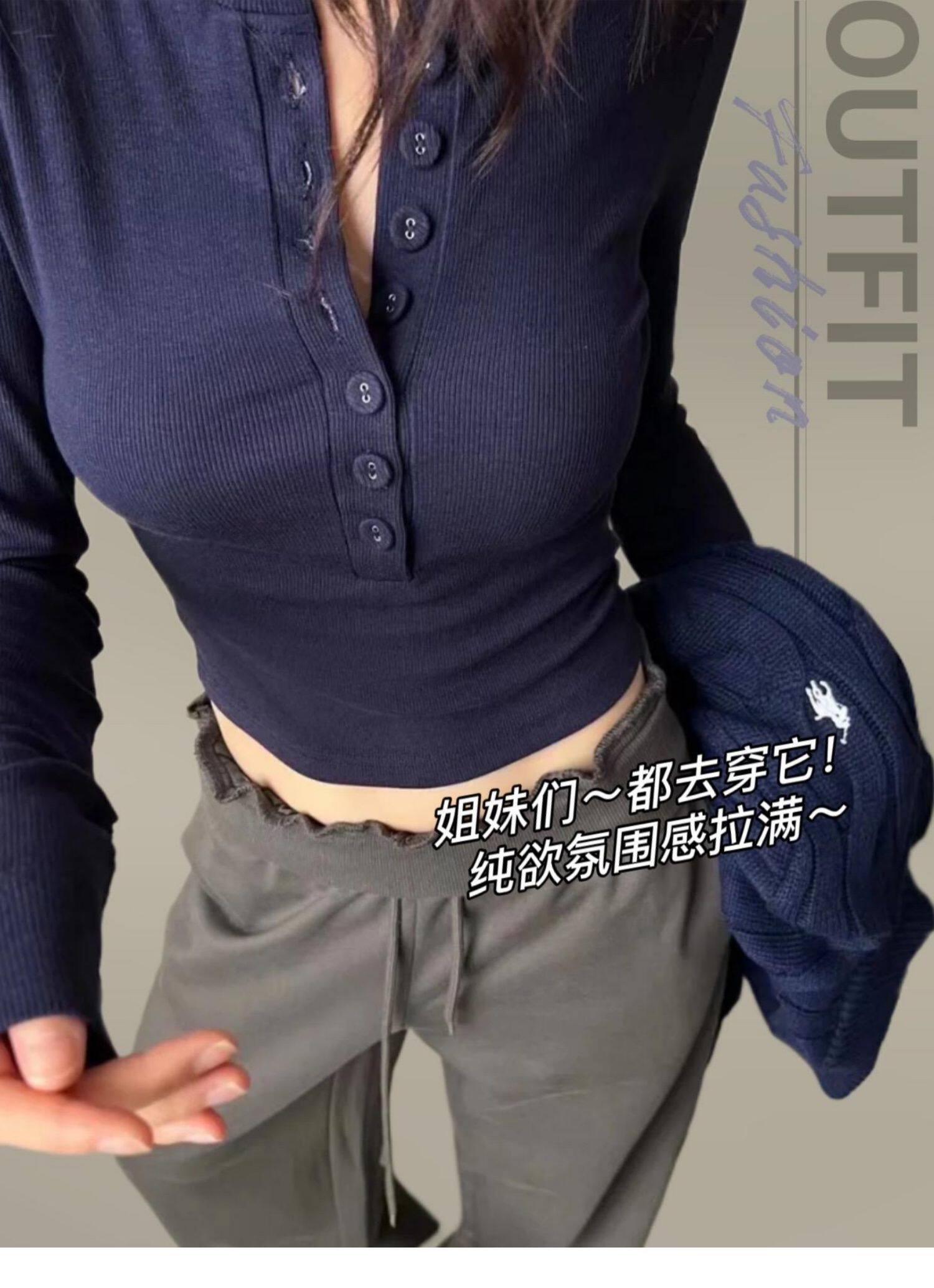 American-Style Spicy Girl Single-Breasted Long-Sleeve T-Shirt for Women, Early Autumn, Slim Fit, Inner Layer, Unique Shoulder Design Top