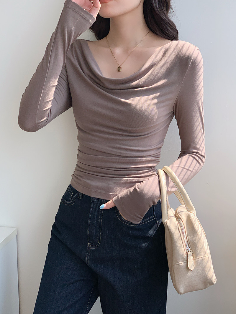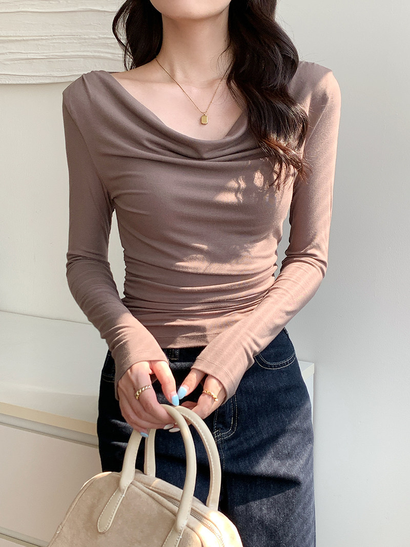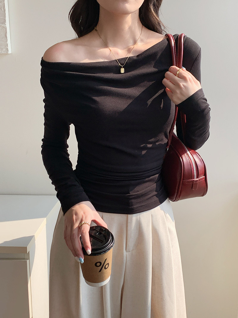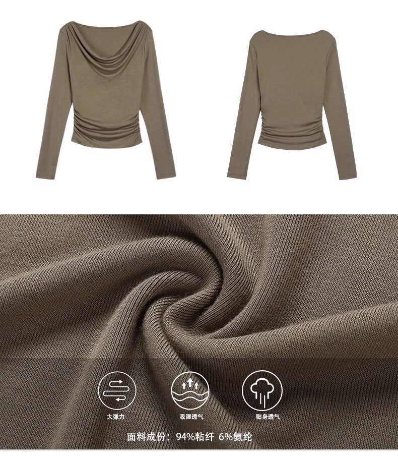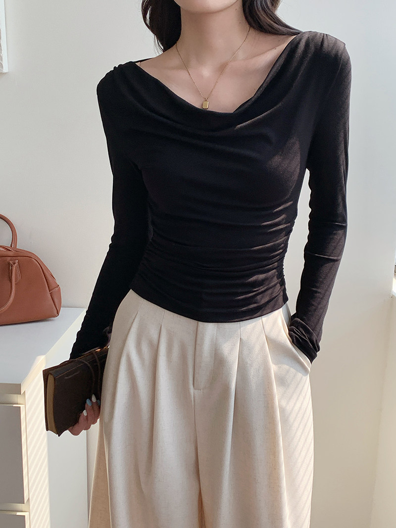 One-Shoulder, Draped Collar, Long-Sleeve T-Shirt for Women, 2025 Autumn/Winter Collection, Unique Design with Pleated Waist, Elegant Off-Shoulder Top