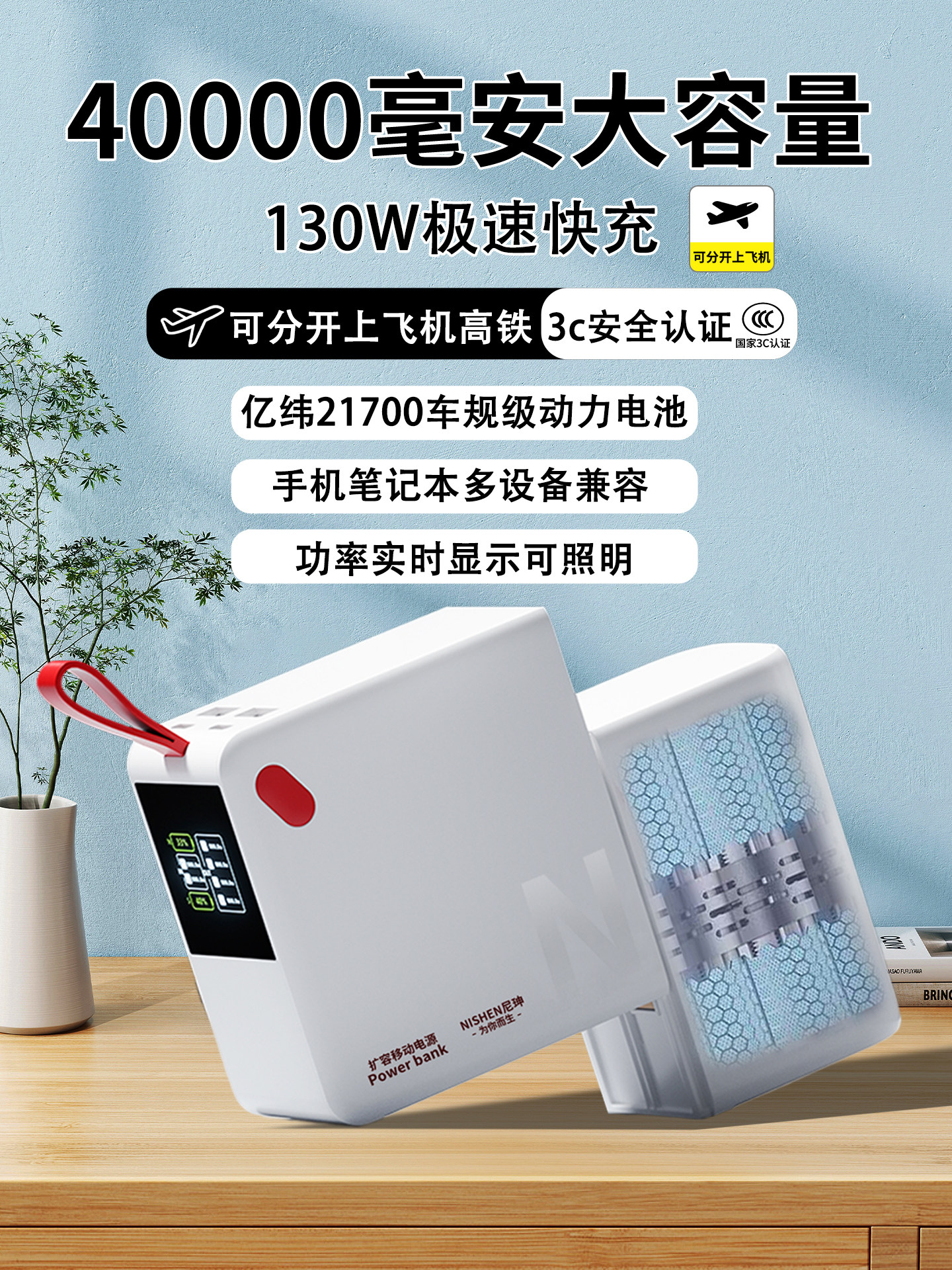 3c certified, can be used on airplanes and high-speed trains. Nishen power bank 40000 mAh large capacity 130W super fast charge can carry 2025 new mobile power supply 20000 for Xiaomi, Apple and Android.