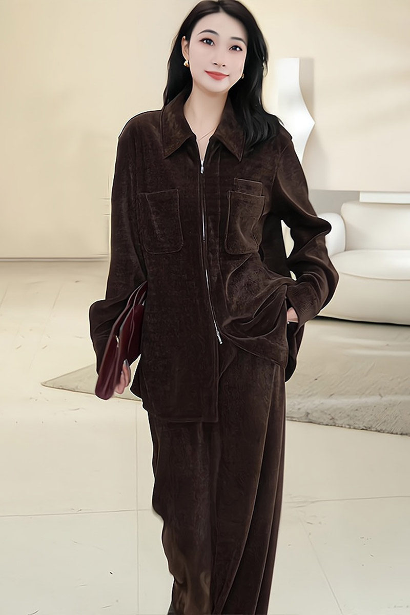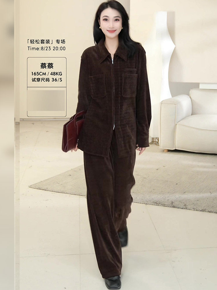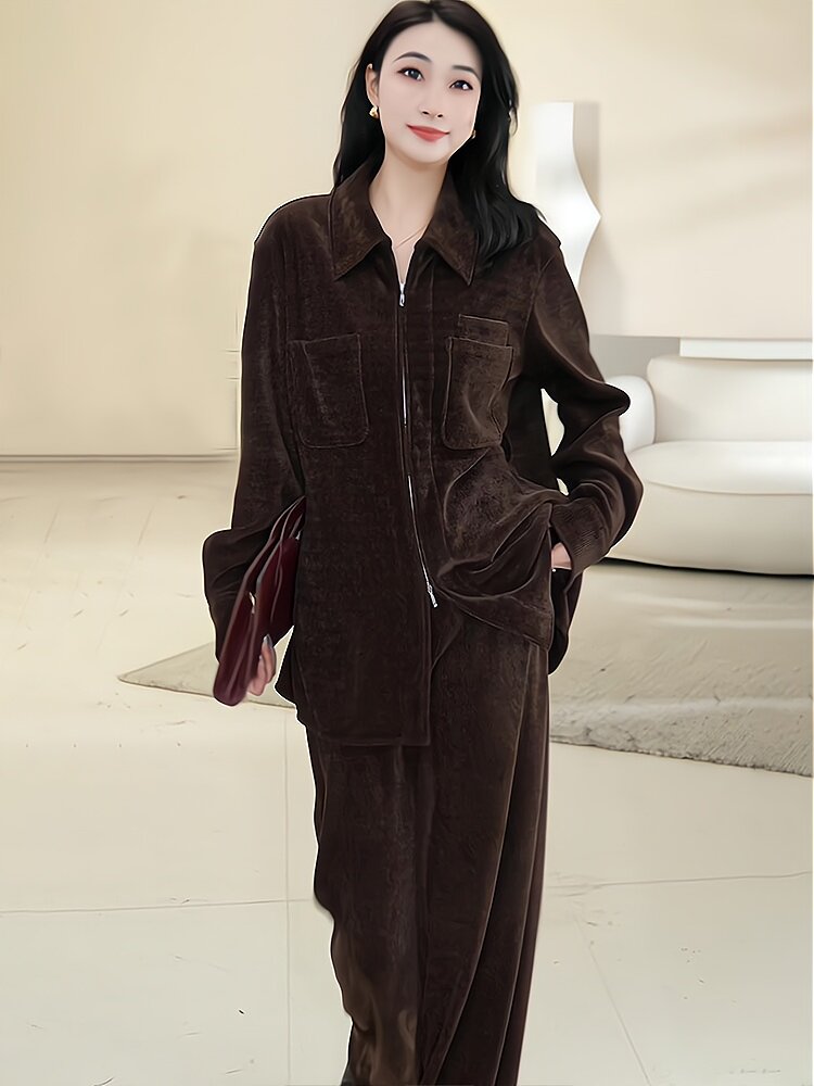 Mijie 2025 New Stylish and Age-Reducing Coffee-Colored Fashion Suit for Women, Elegant and Good-Looking, Long-Sleeved, Loose-Fitting, Slimming Two-Piece Set