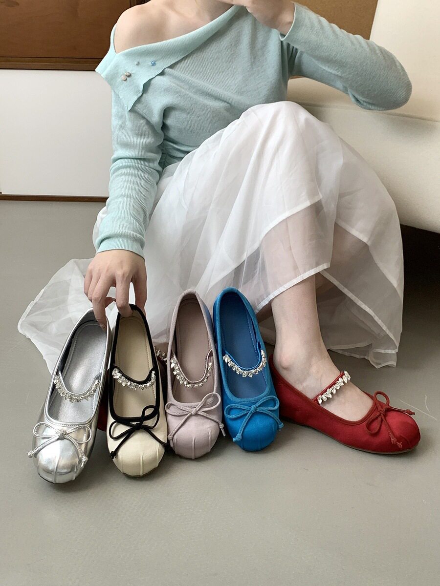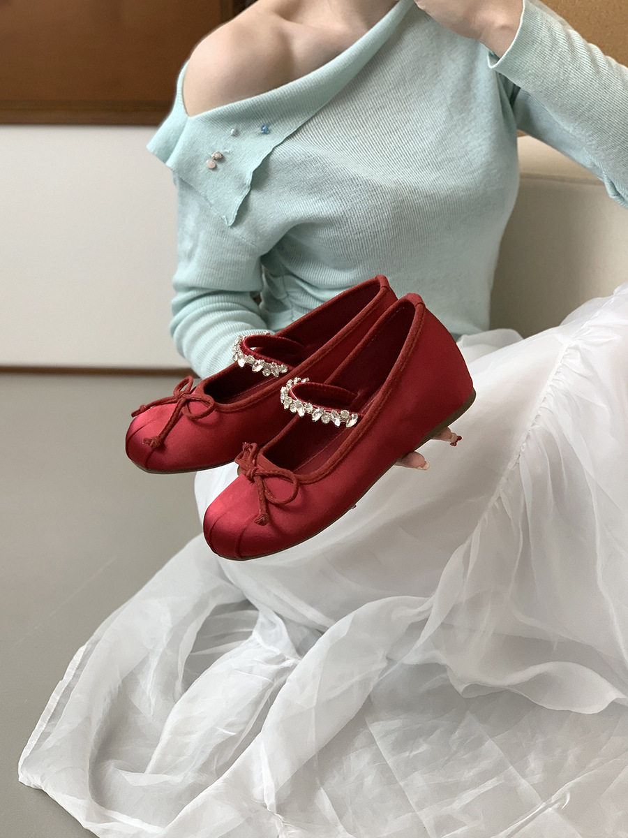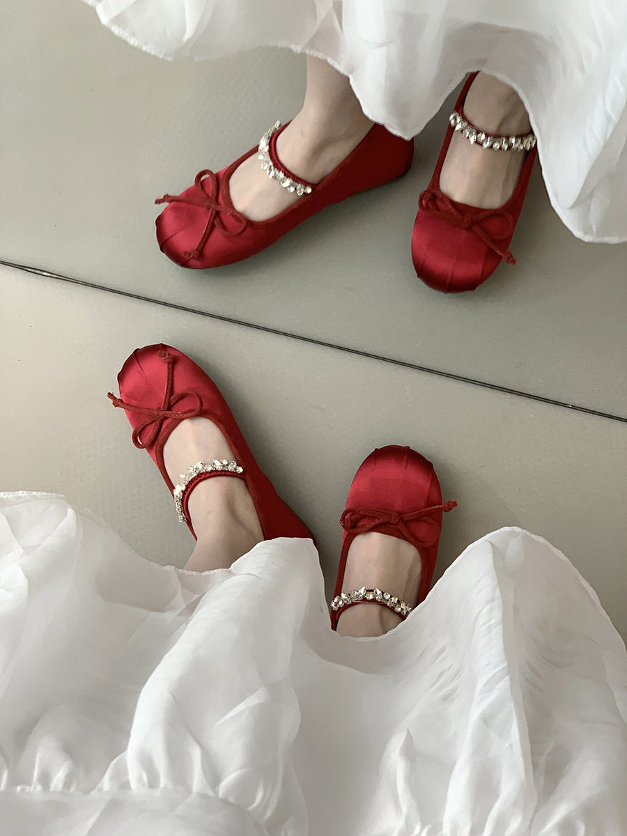 Women's French-Style Mary Jane Shoes with 4cm Hidden Height Increase, Red Rhinestone Ballet Shoes for Spring/Summer 2025