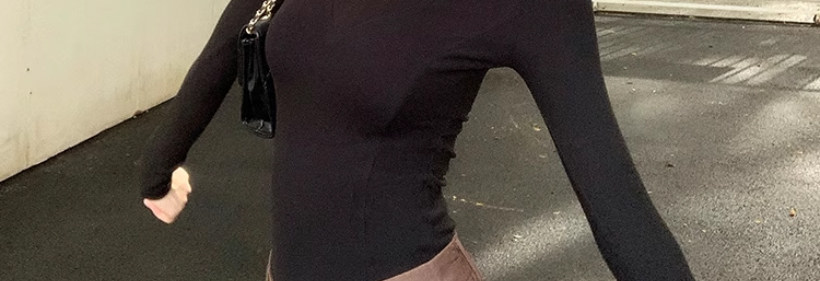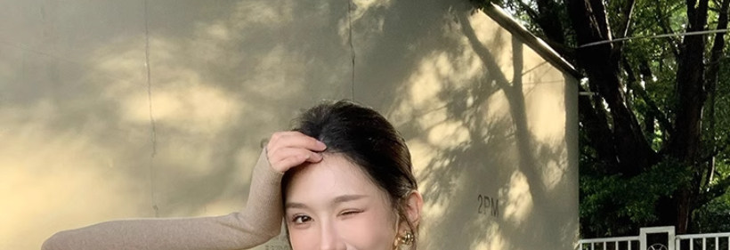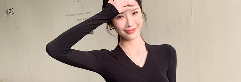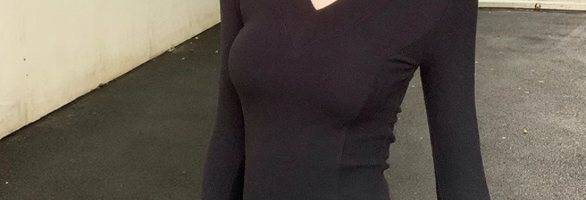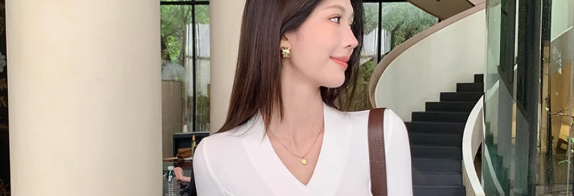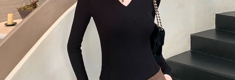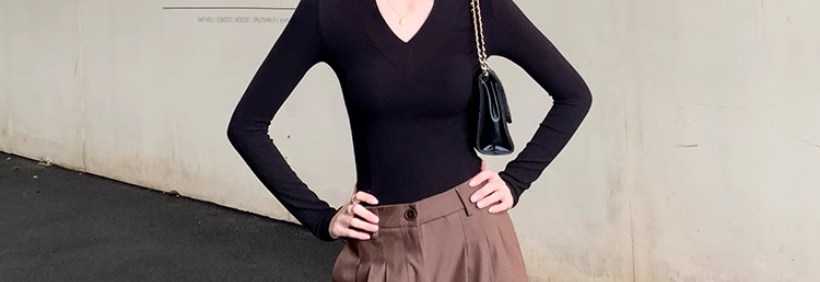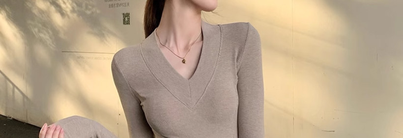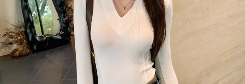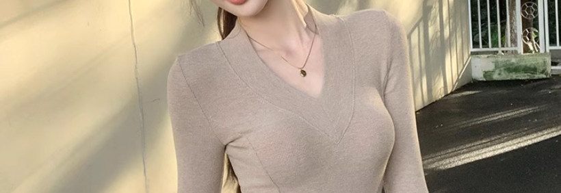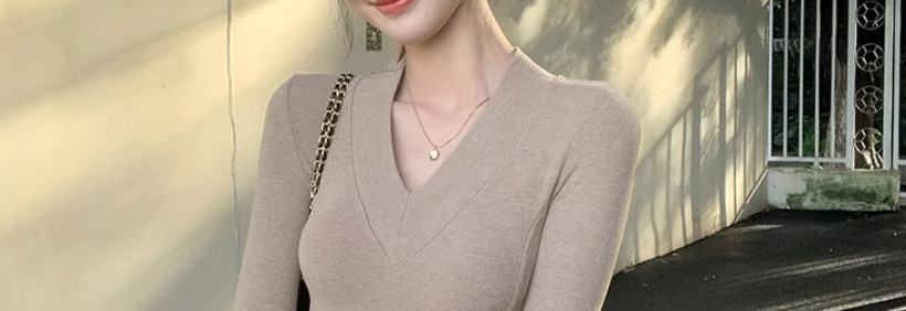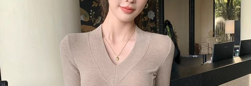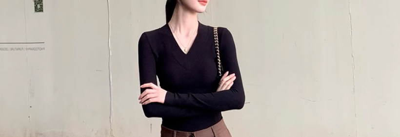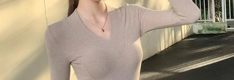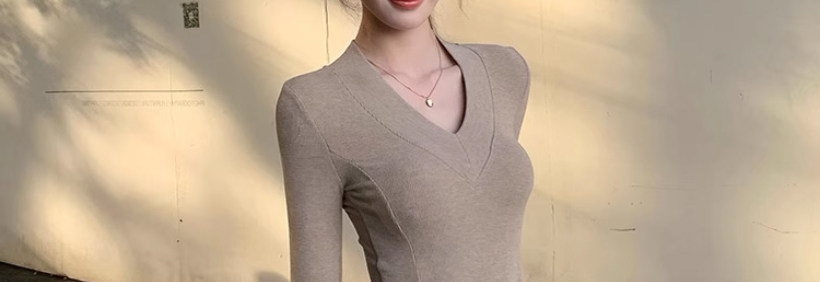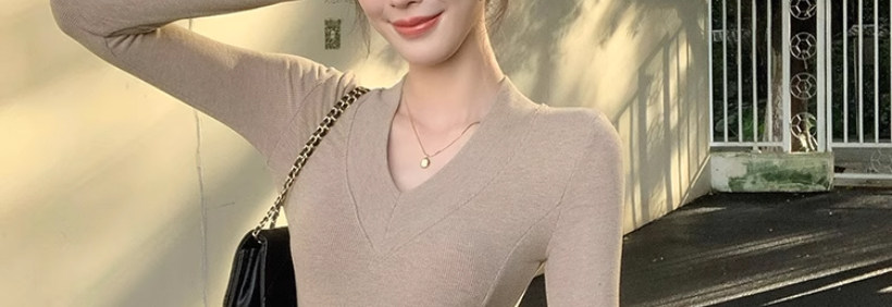 Solid Color V-Neck Inner Layering Shirt for Women, Autumn and Winter, High-End Elegant Style, Bell Sleeve Design, Fishbone Long-Sleeve T-Shirt Top