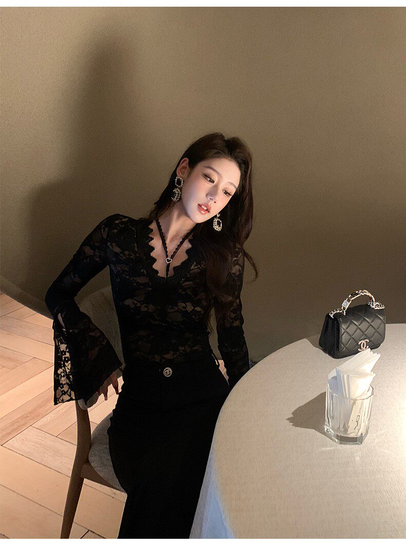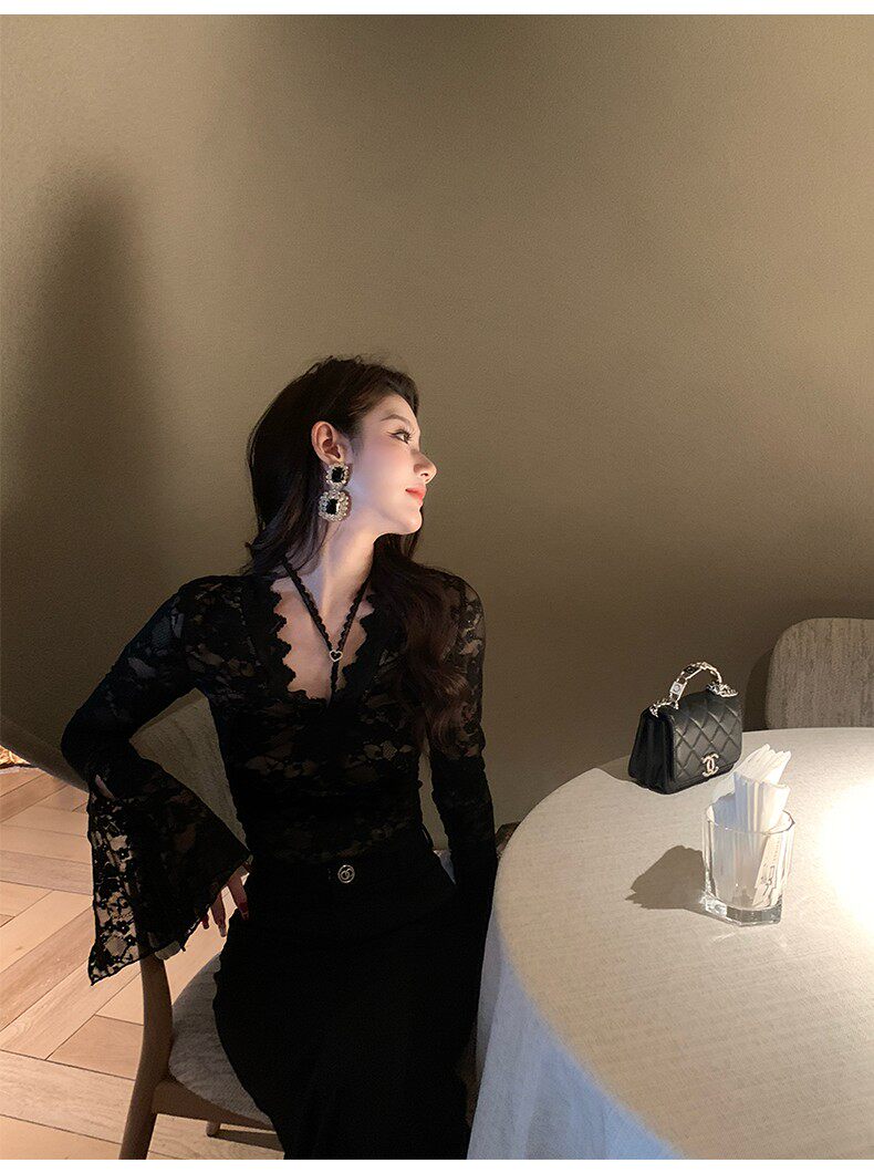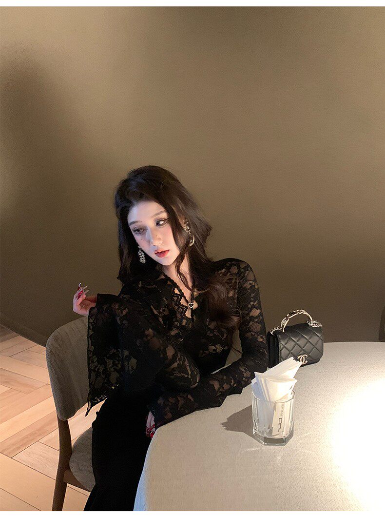 Hollin Hollow Lace Blouse for Women Spring and Autumn 2025 New V-Neck Socialite Style Sexy Girl Slightly See-Through Slimming Top