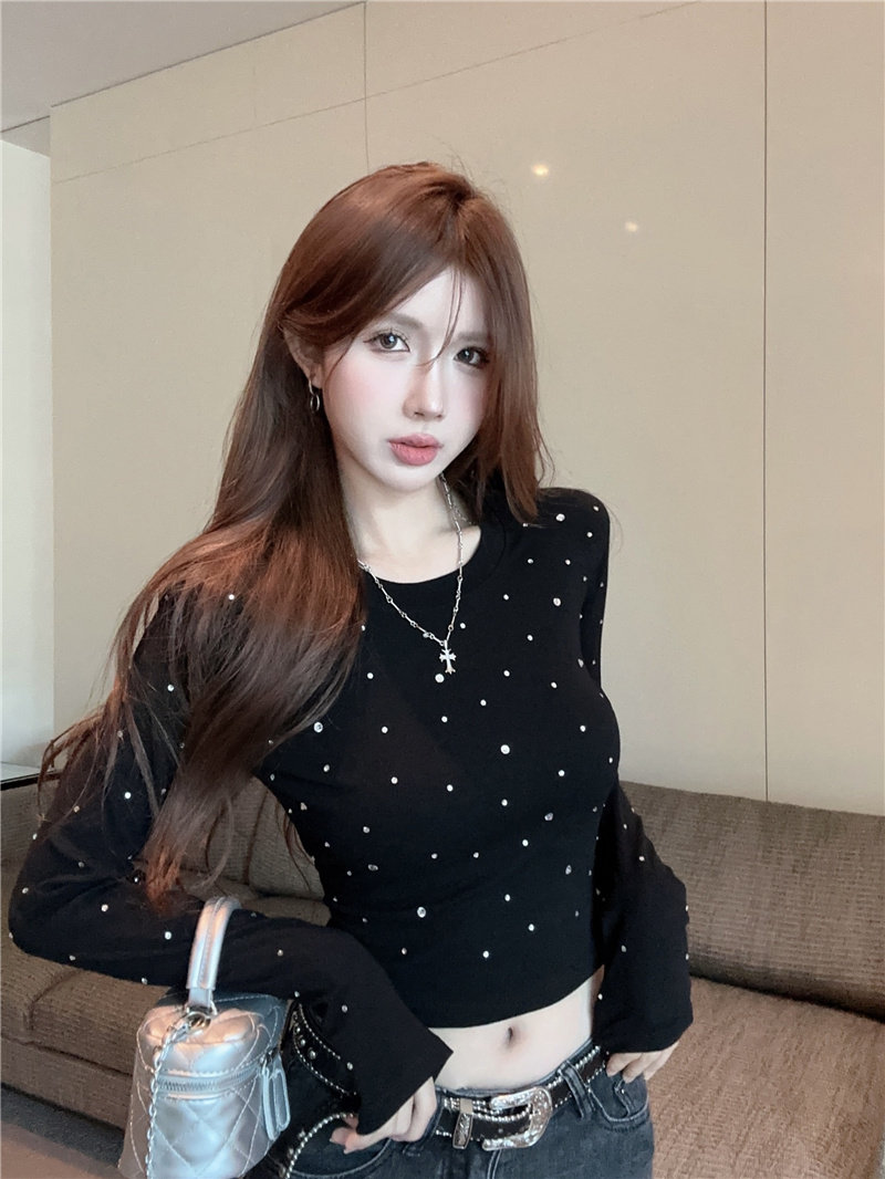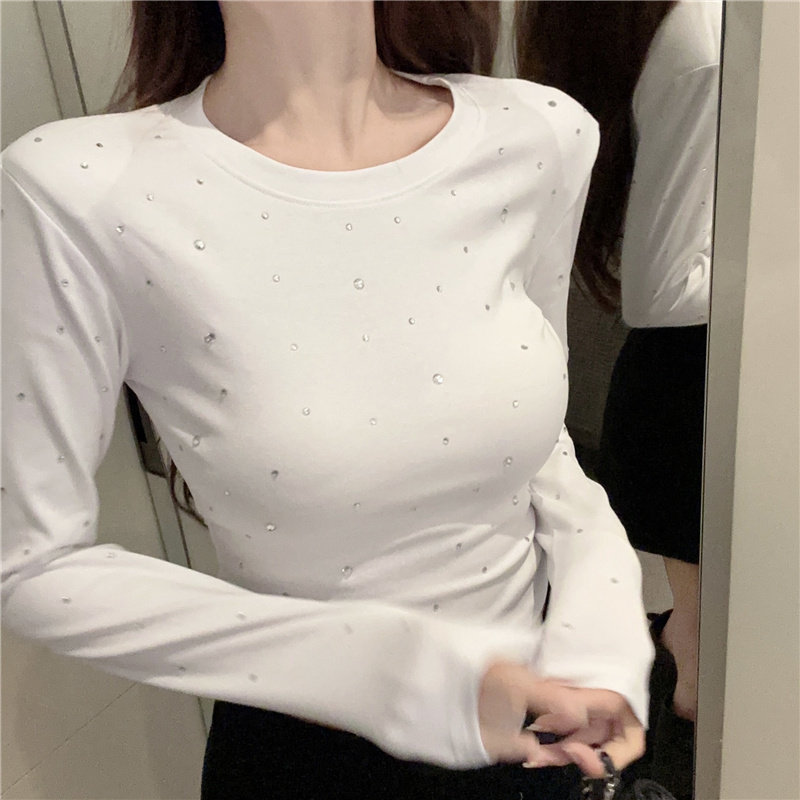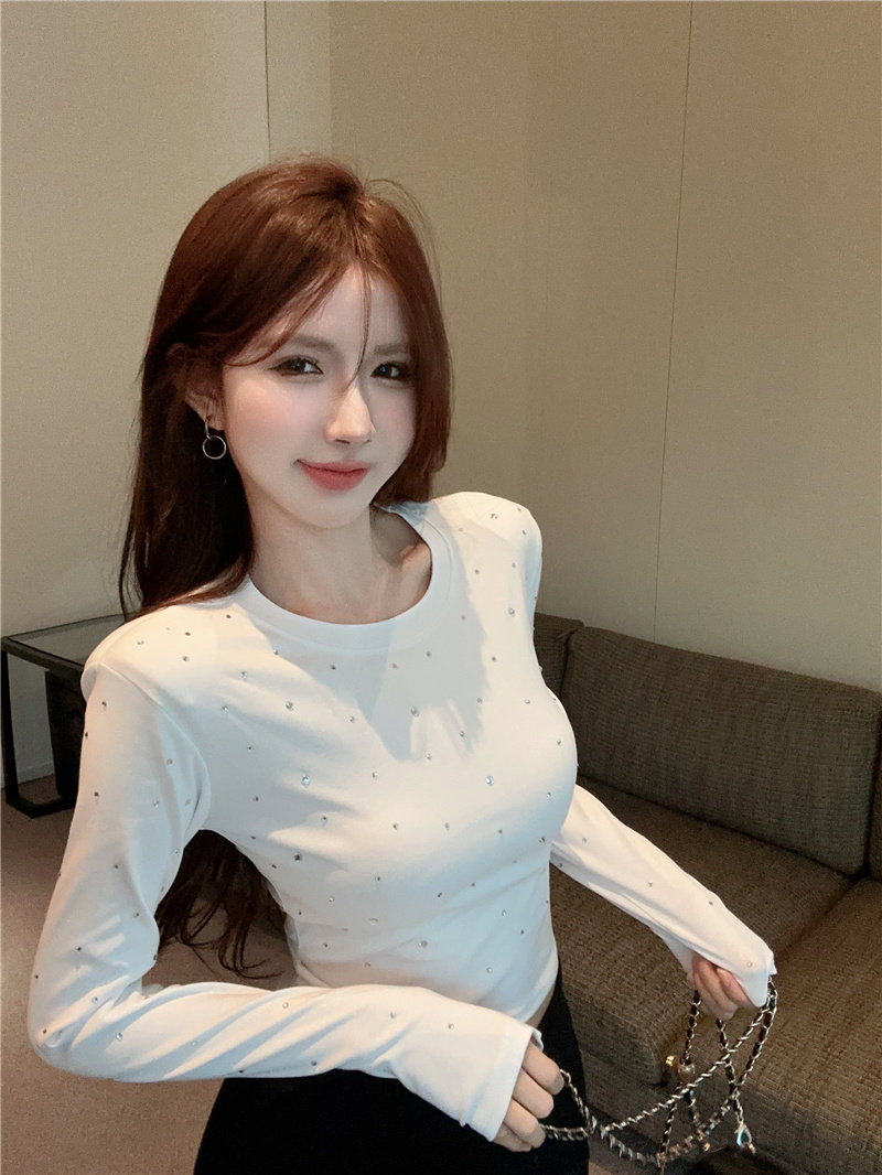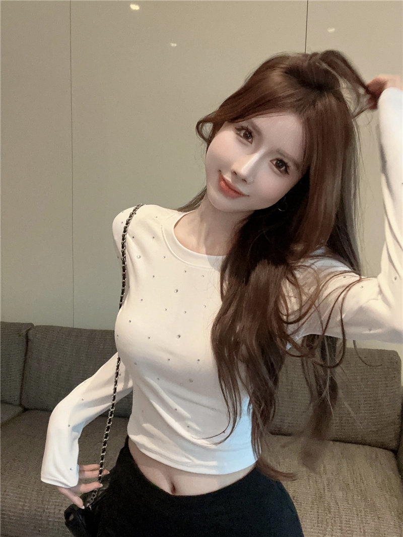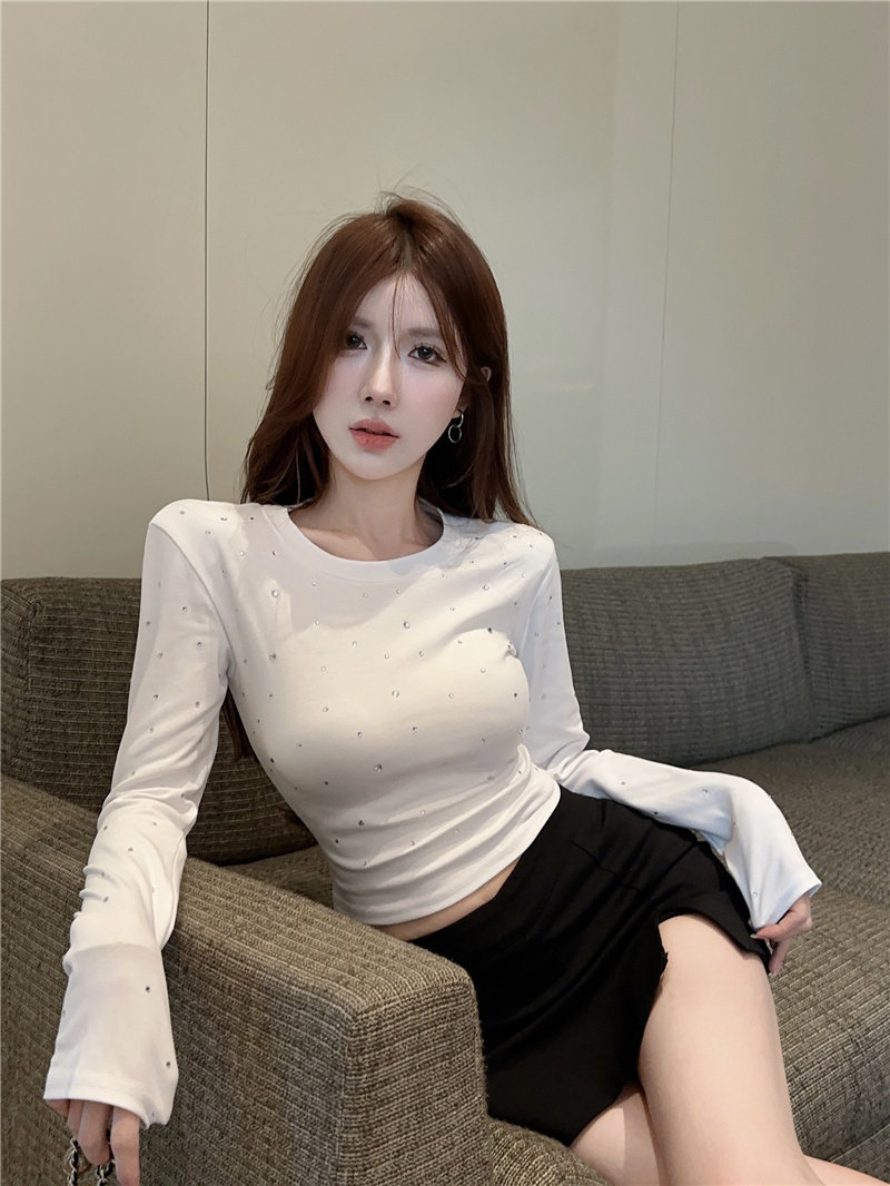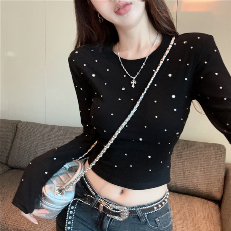 Trendy Hot Girl Rhinestone Round Neck Long-Sleeve T-Shirt for Women, New Spring Style, Petite Slim-Fit Short Base Shirt ins