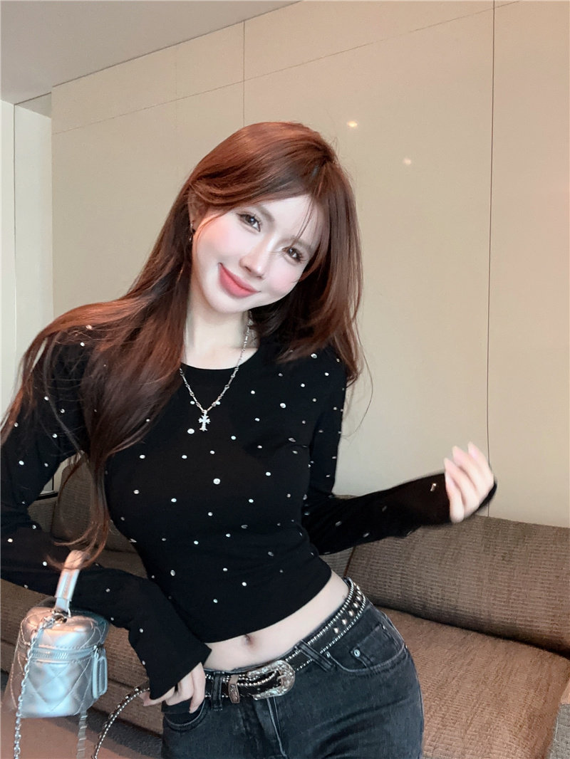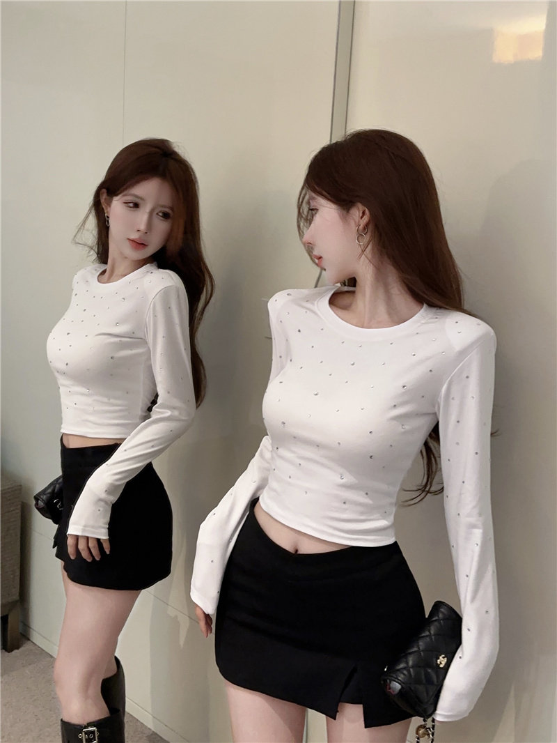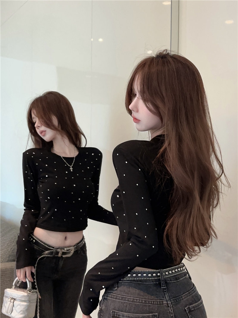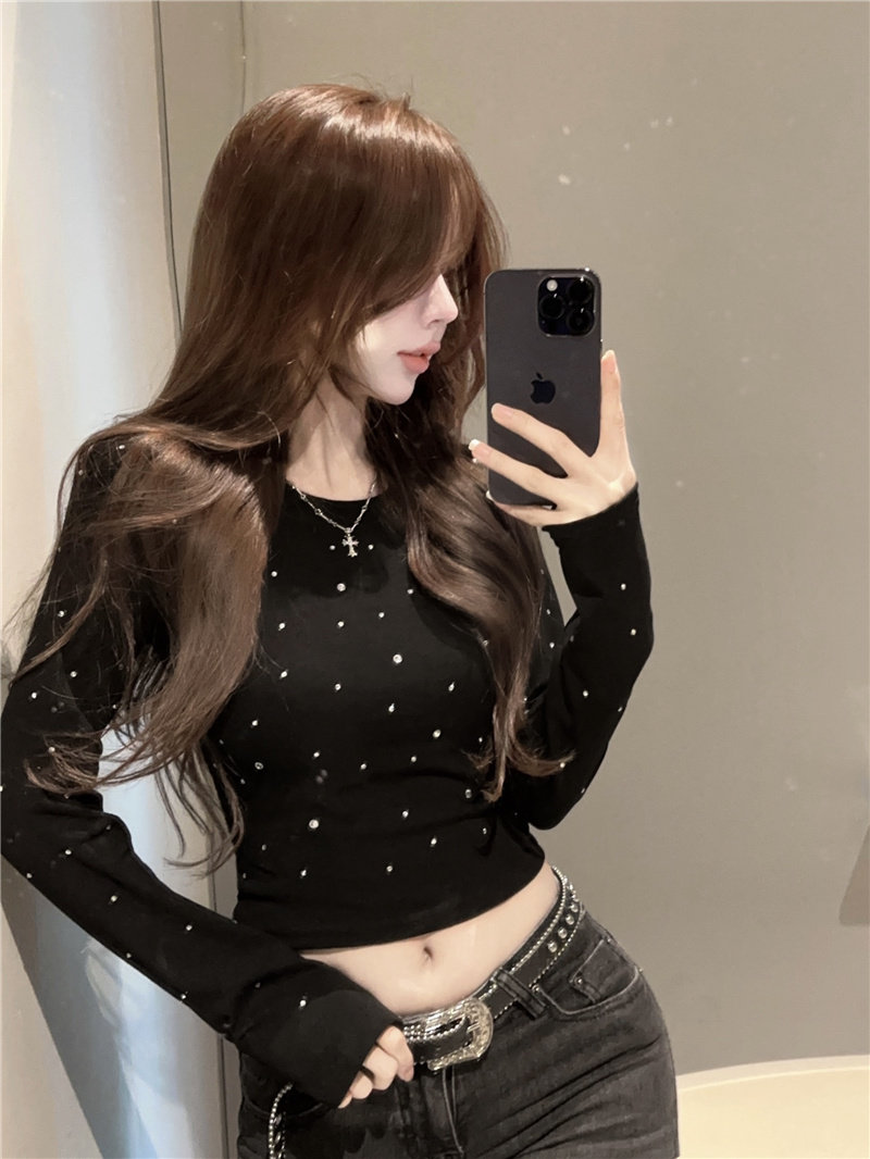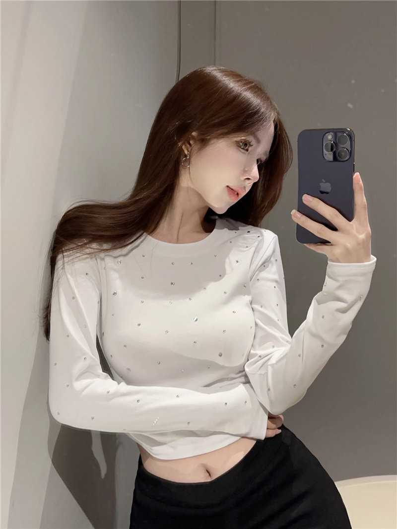 Trendy Hot Girl Rhinestone Round Neck Long-Sleeve T-Shirt for Women, New Spring Style, Petite Slim-Fit Short Base Shirt ins