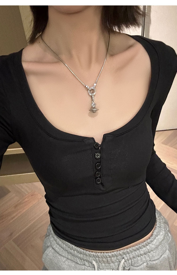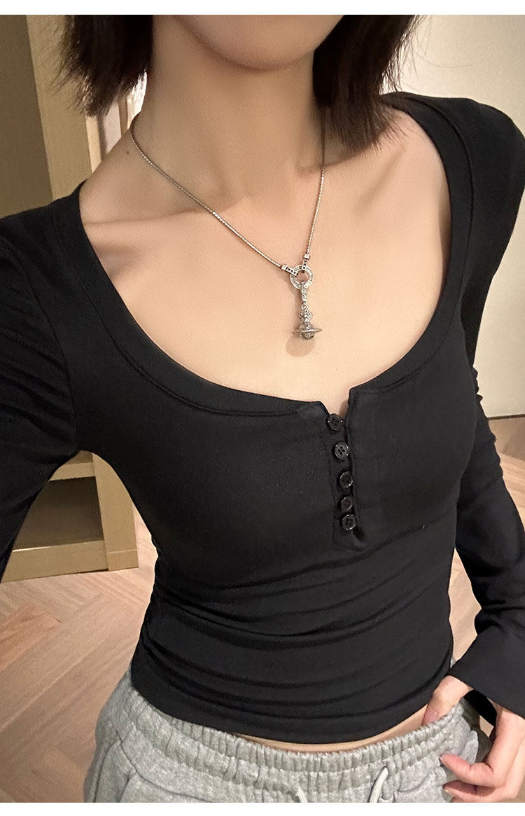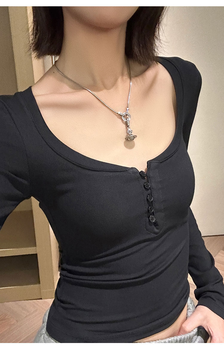 Trendy Tight-Fitting U-Neck Base Layer Top for Women, Autumn and Winter Unique Button Design, Niche Long-Sleeve Slim-Fit T-Shirt Top