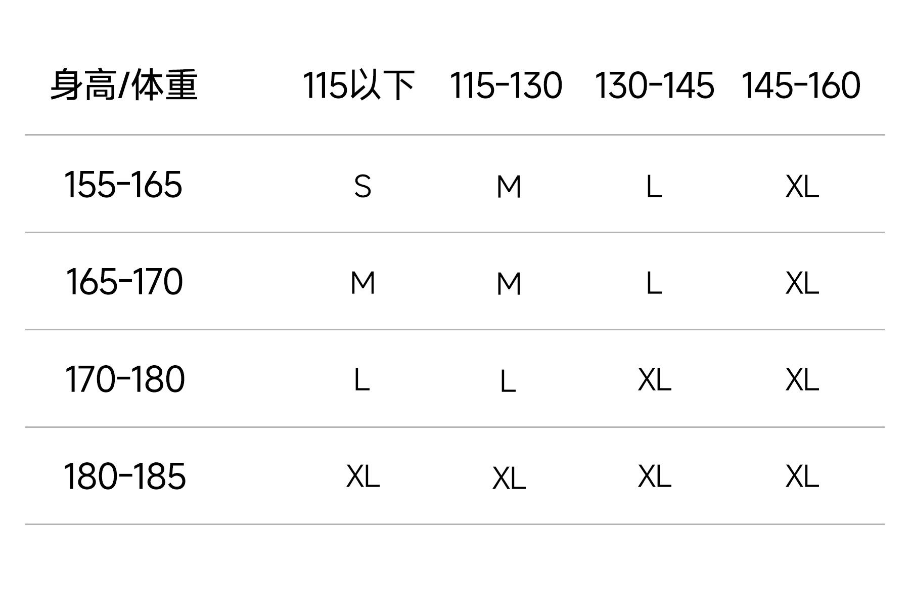 China (cm) 160-165/84-86 165-170 / 88-90 167-172 / 92-96 168-173 / 98-102 170-176 / 106-110