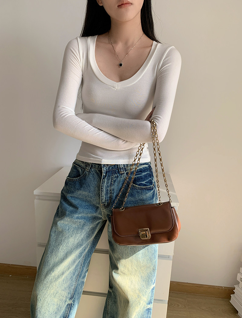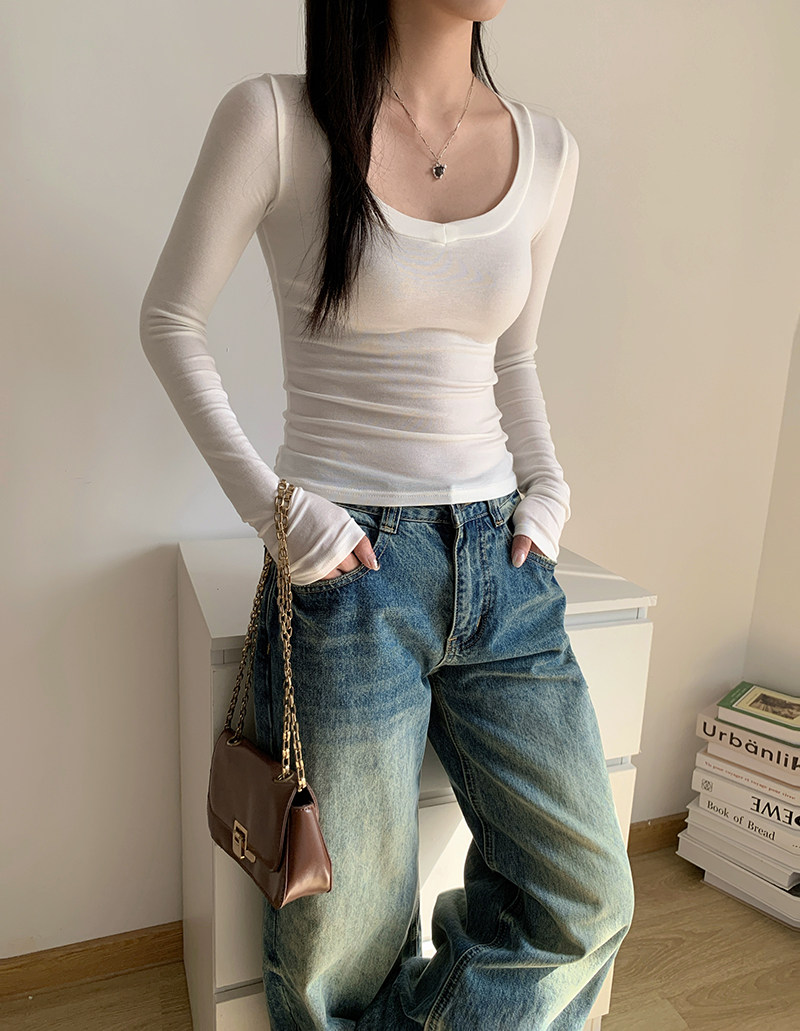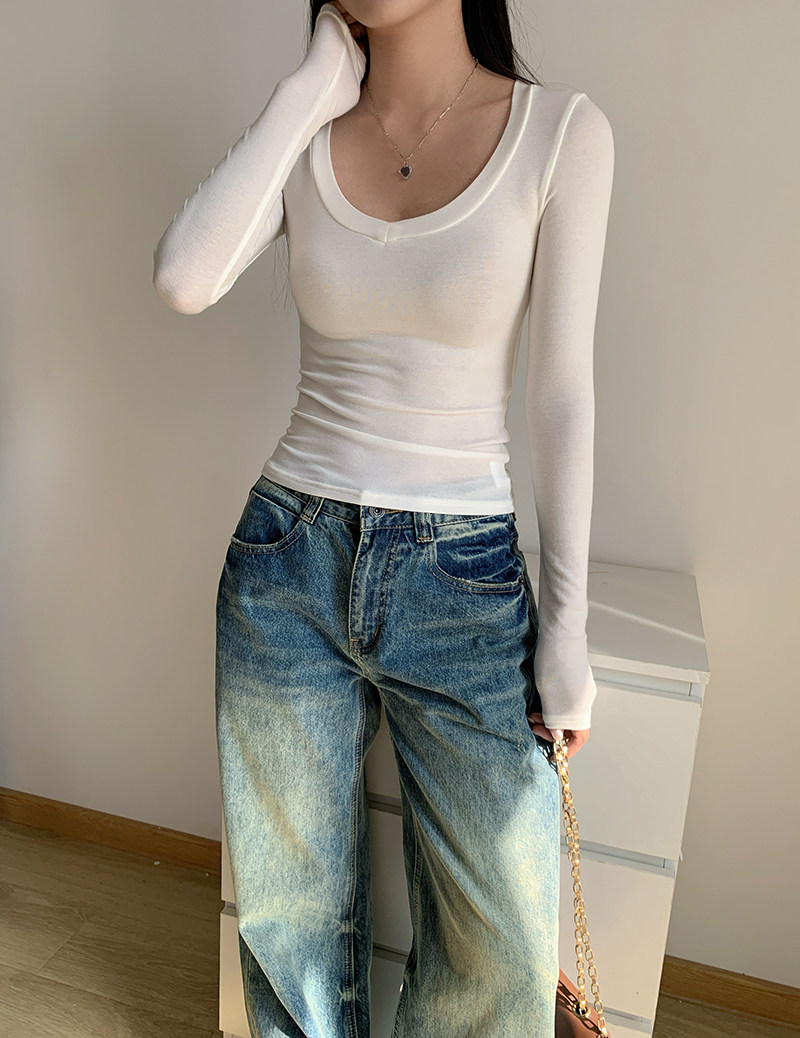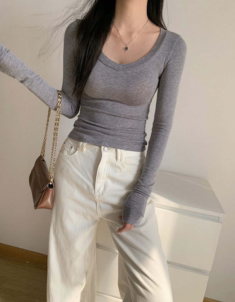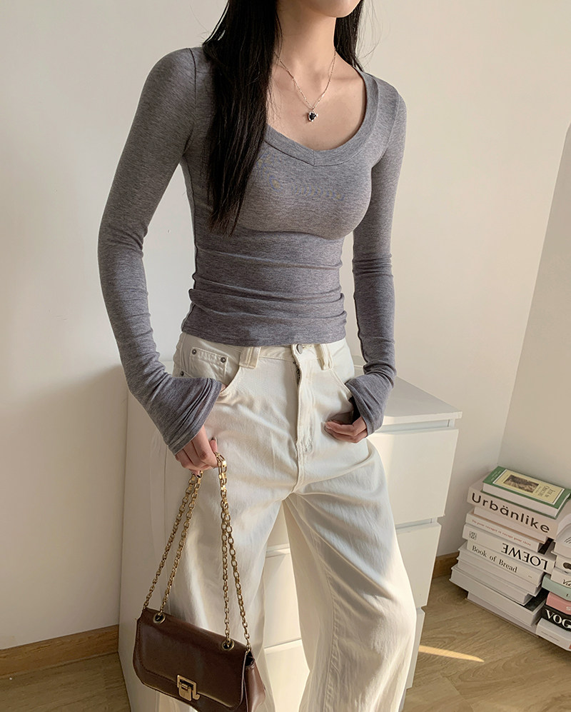 V-Neck Long-Sleeve Top for Autumn and Winter, Pure Desire Style, Lyocell Tencel Slightly Sheer, Elegant Slim-Fit T-Shirt for Women