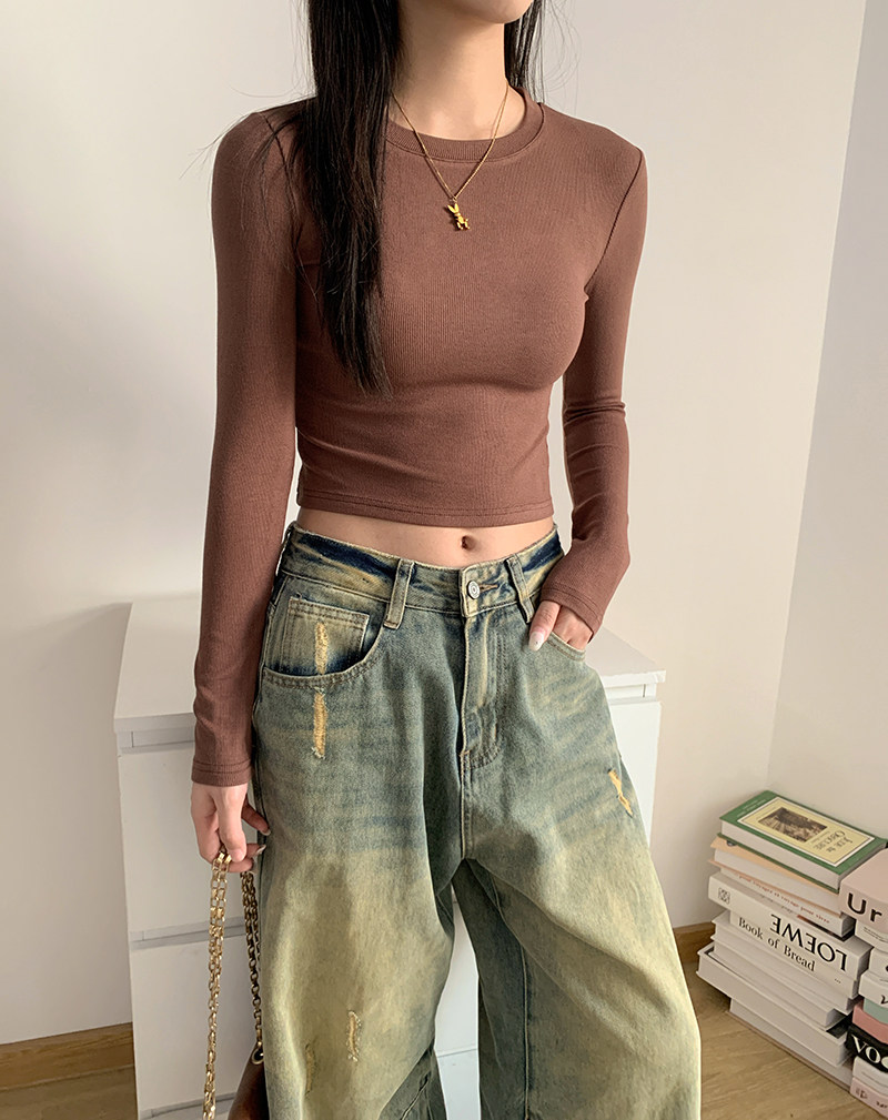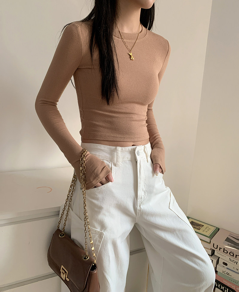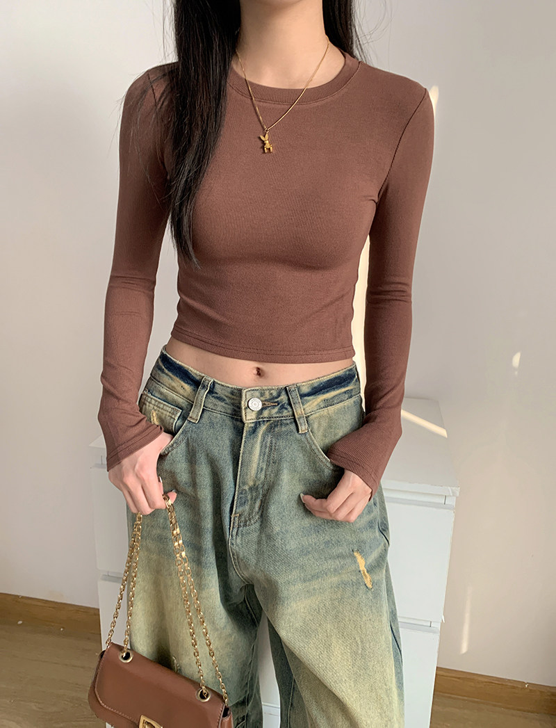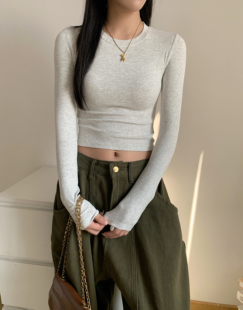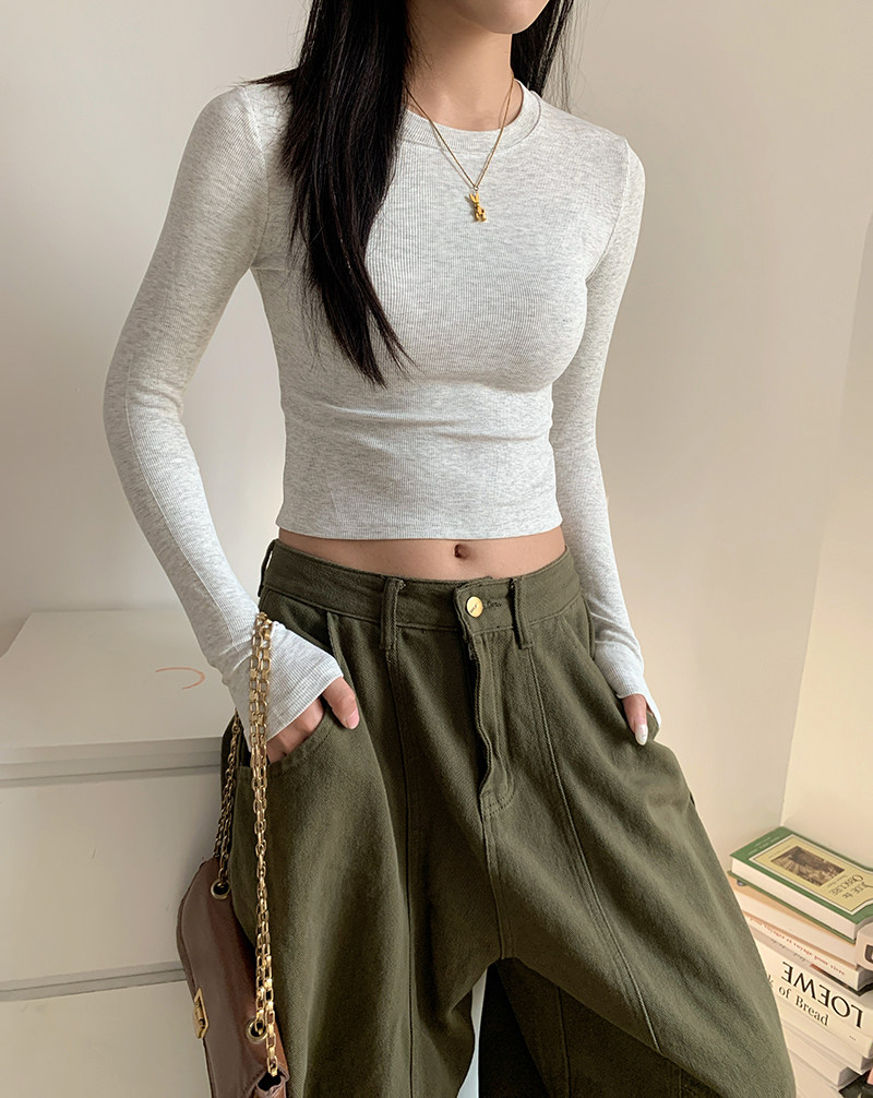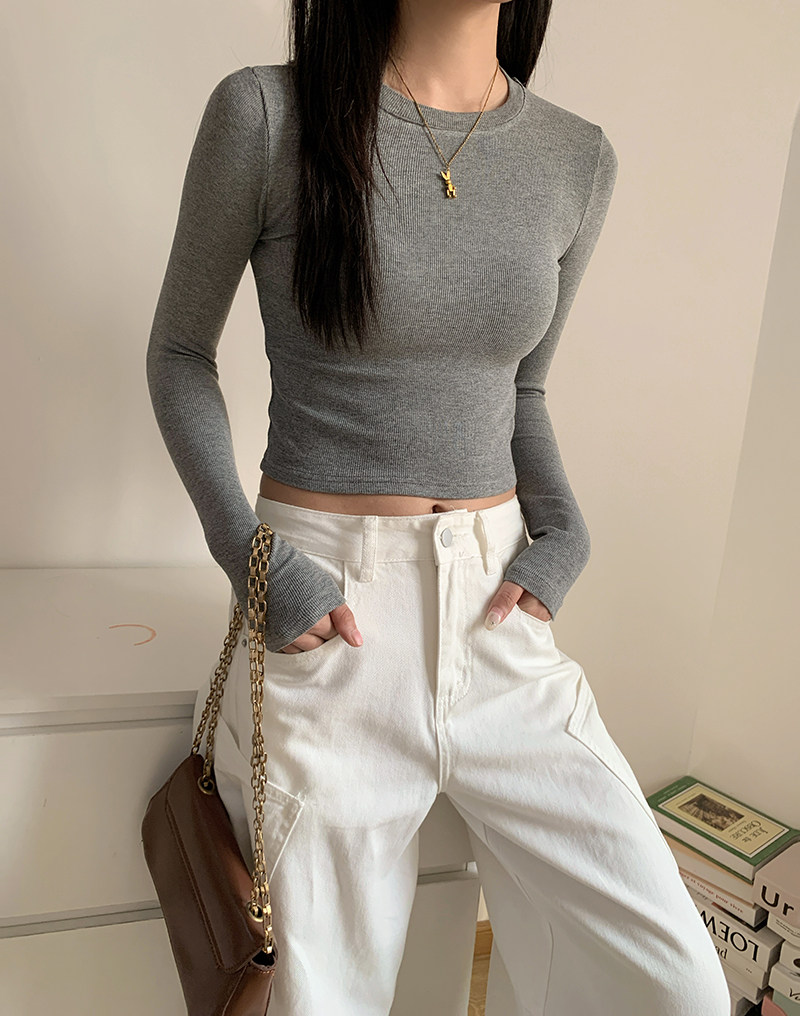 Ribbed Slim-Fit Long-Sleeve T-Shirt for Women, Autumn and Winter Tight-Fitting Base Layer, Basic Short Top