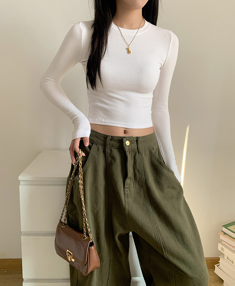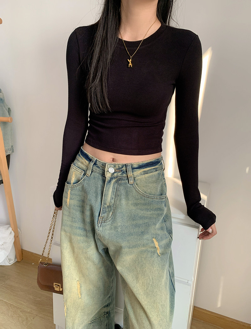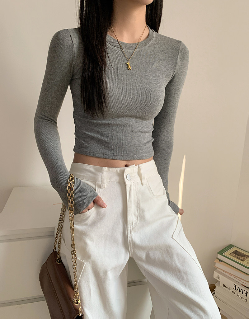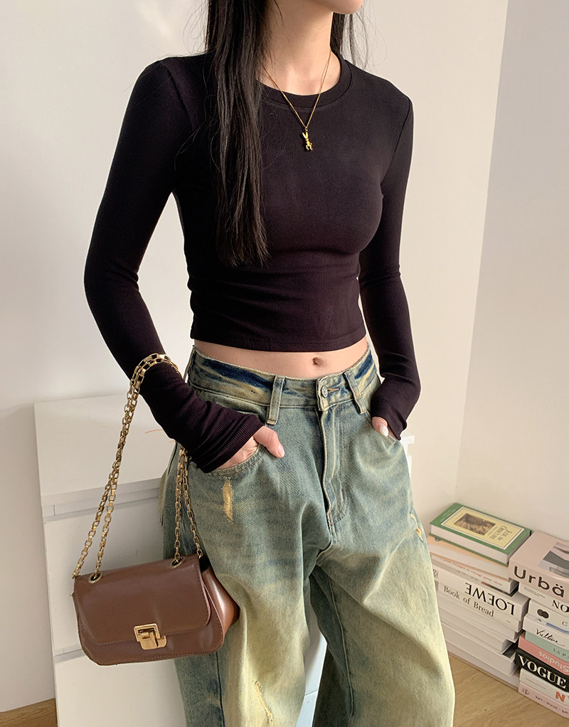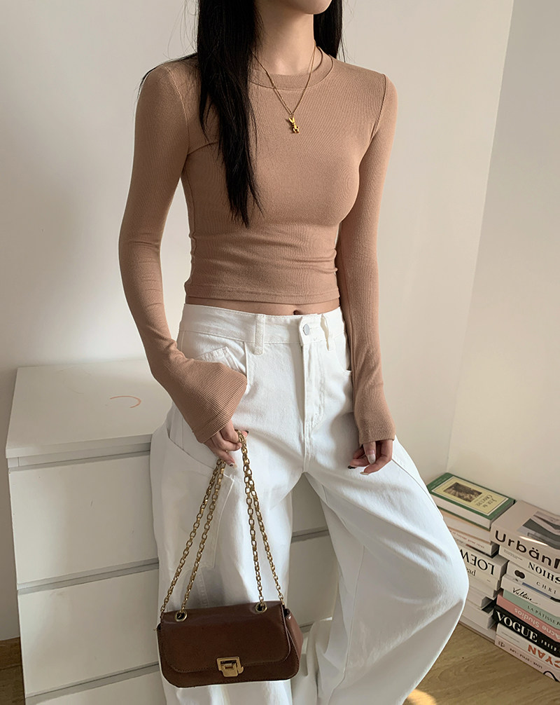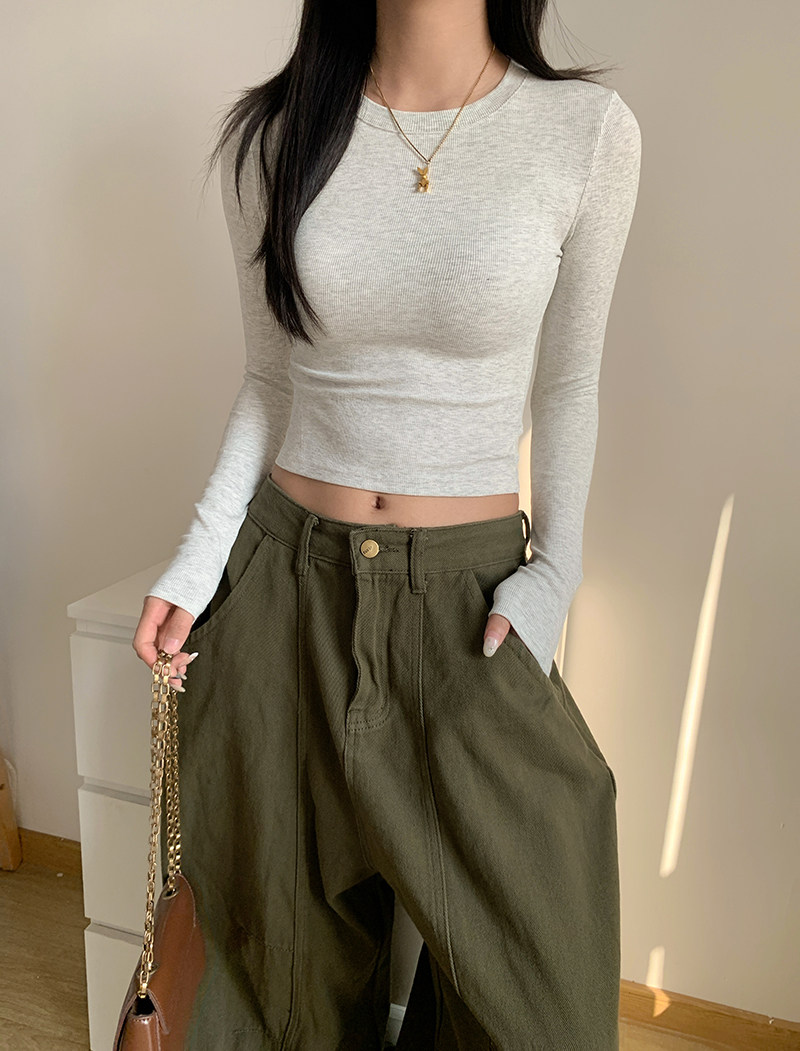 Ribbed Slim-Fit Long-Sleeve T-Shirt for Women, Autumn and Winter Tight-Fitting Base Layer, Basic Short Top