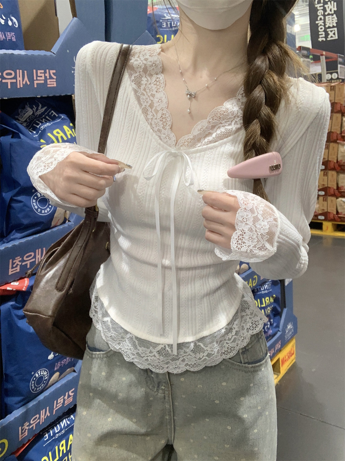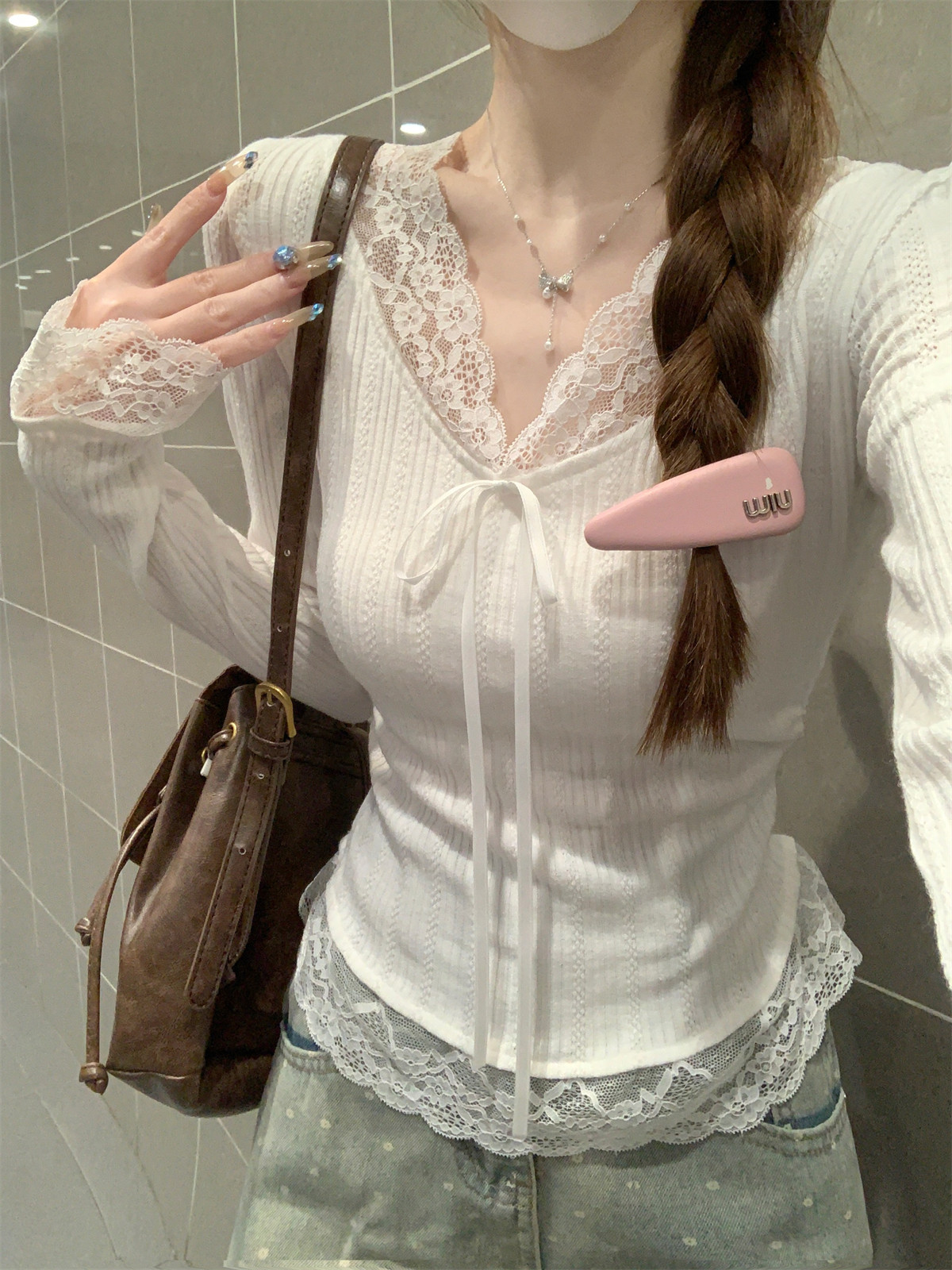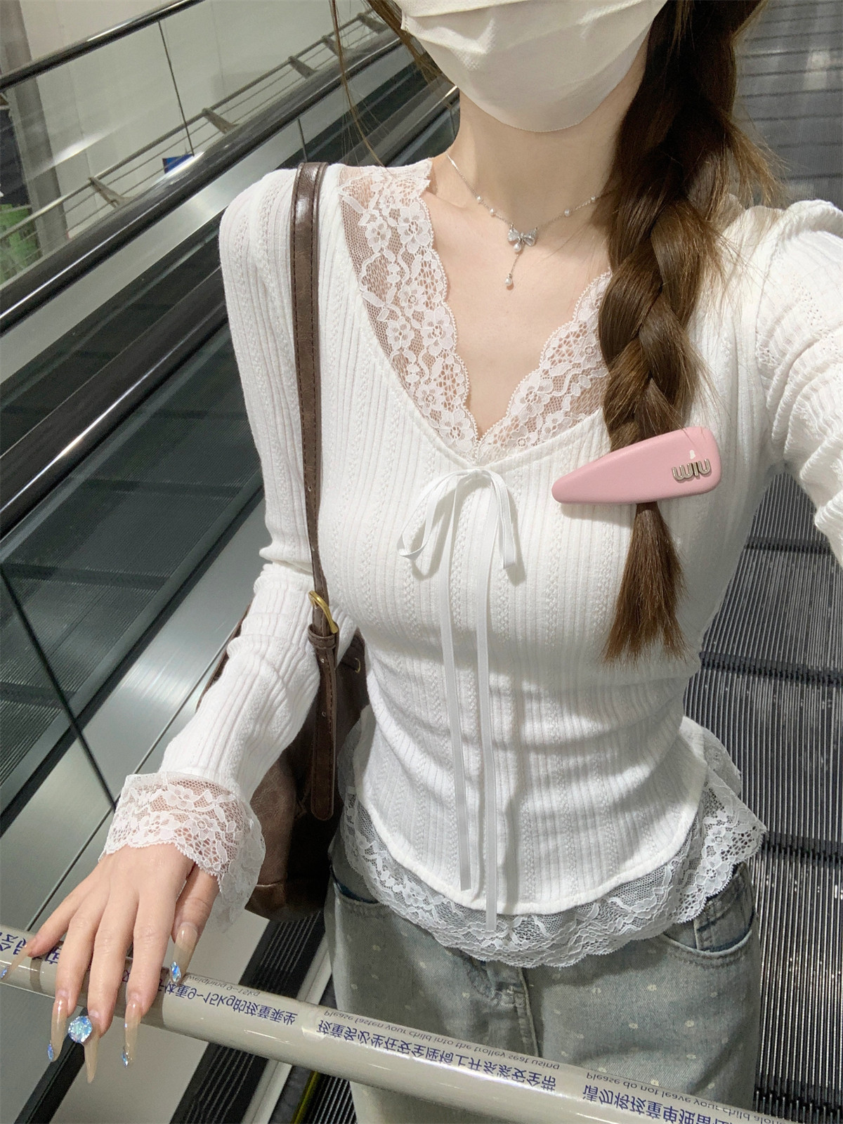 Korean Style Elegant V-Neck Lace Trim Slim Long-Sleeve T-Shirt for Women, White, New Autumn Style, Gentle Ballet Style, Waist-Cinching Top