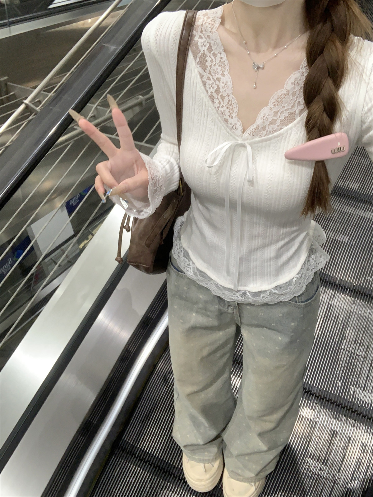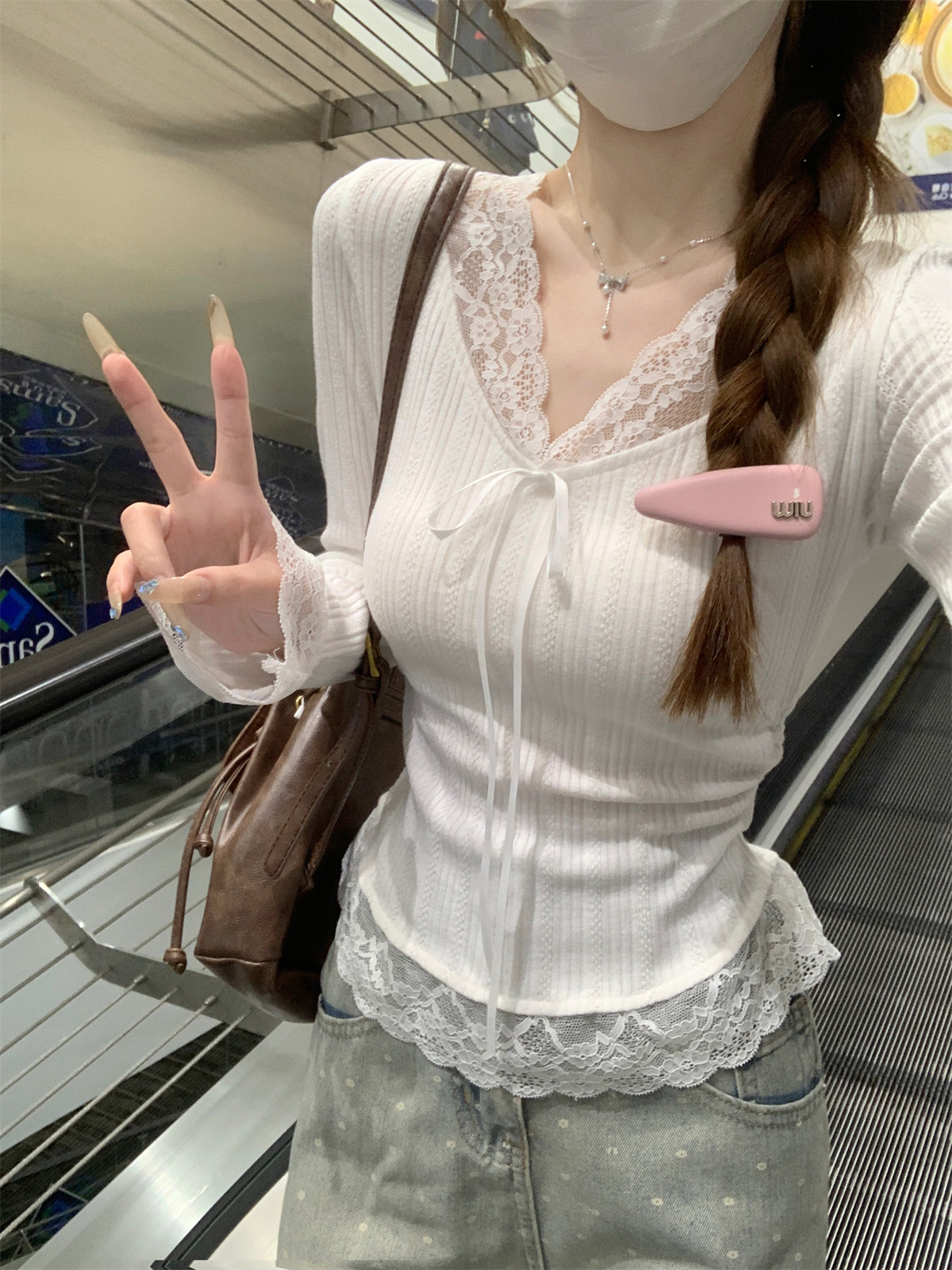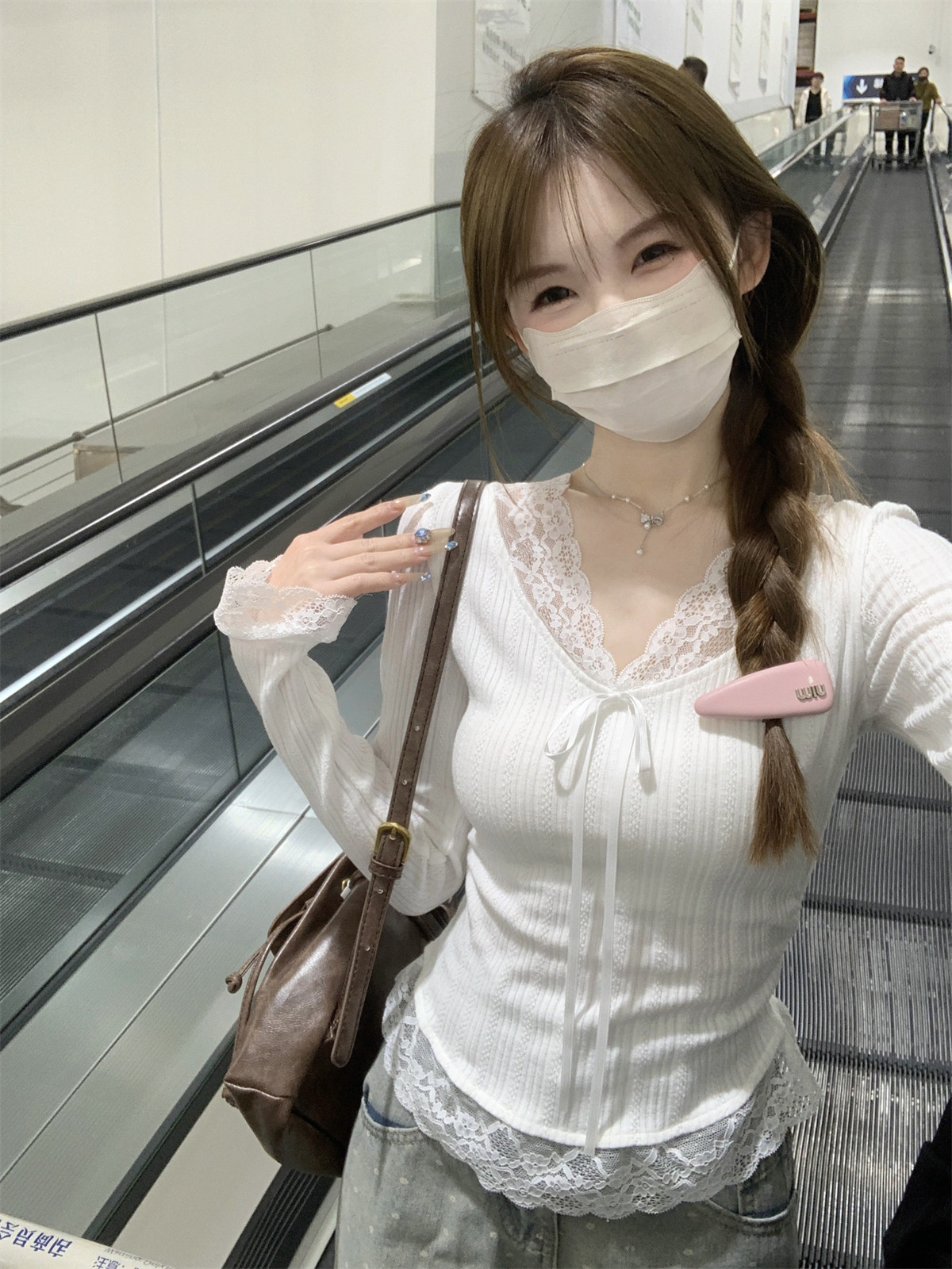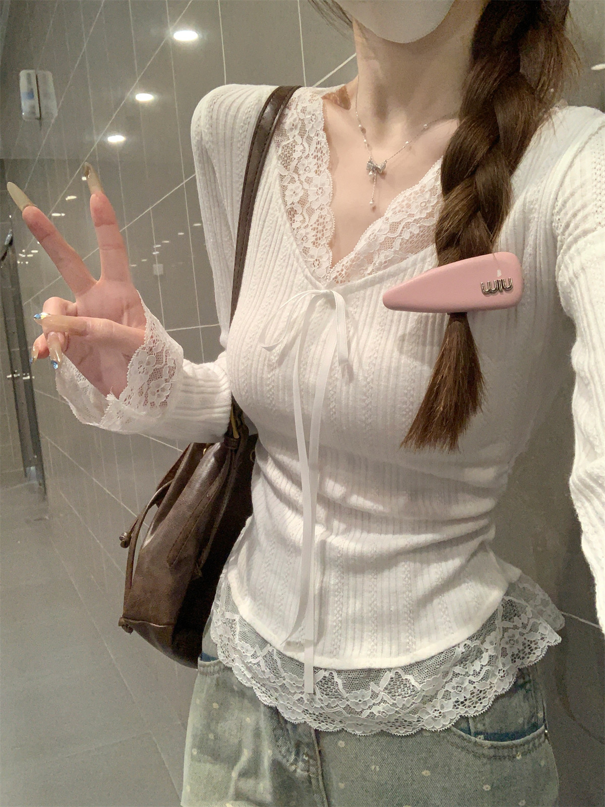 Korean Style Elegant V-Neck Lace Trim Slim Long-Sleeve T-Shirt for Women, White, New Autumn Style, Gentle Ballet Style, Waist-Cinching Top
