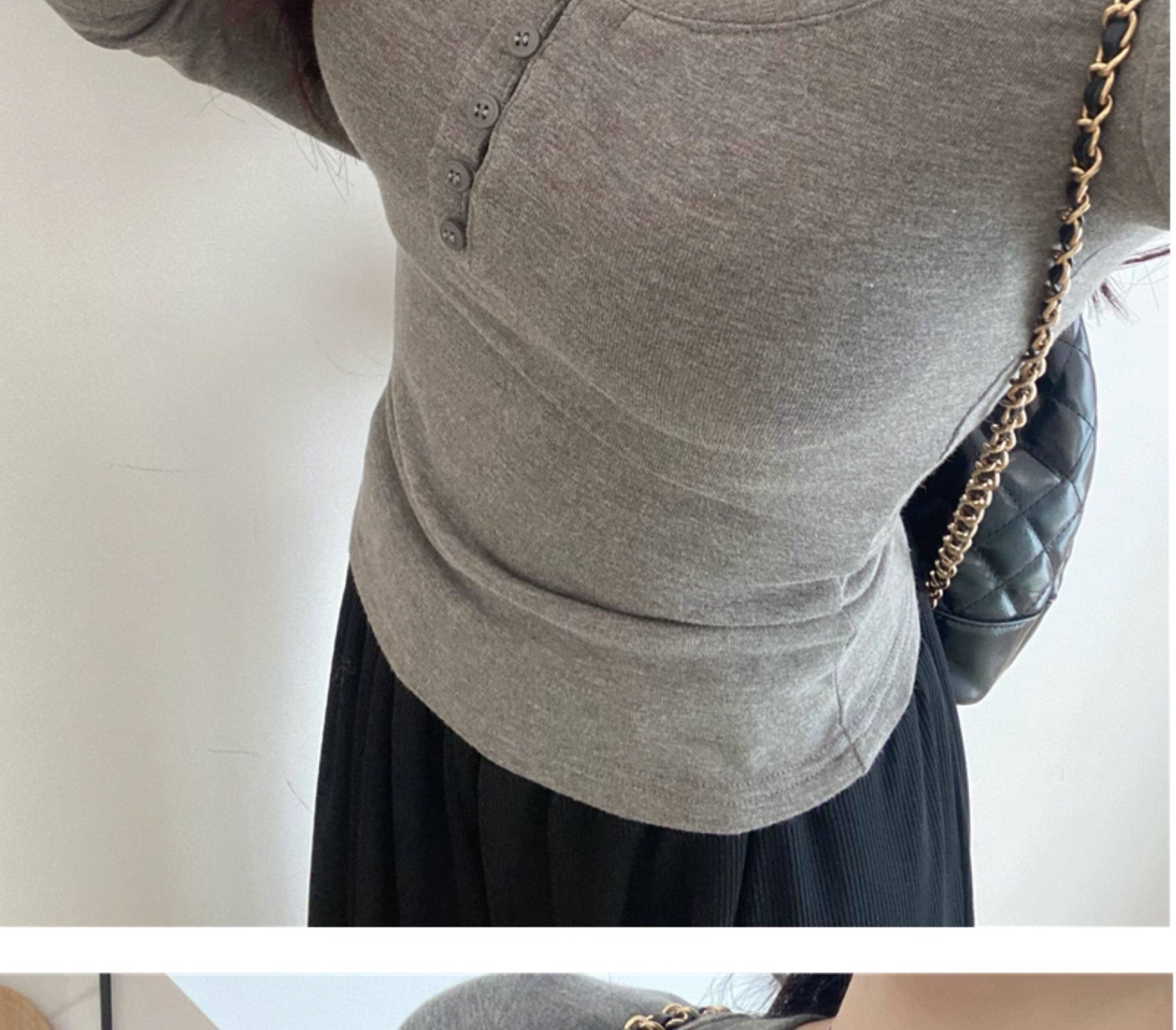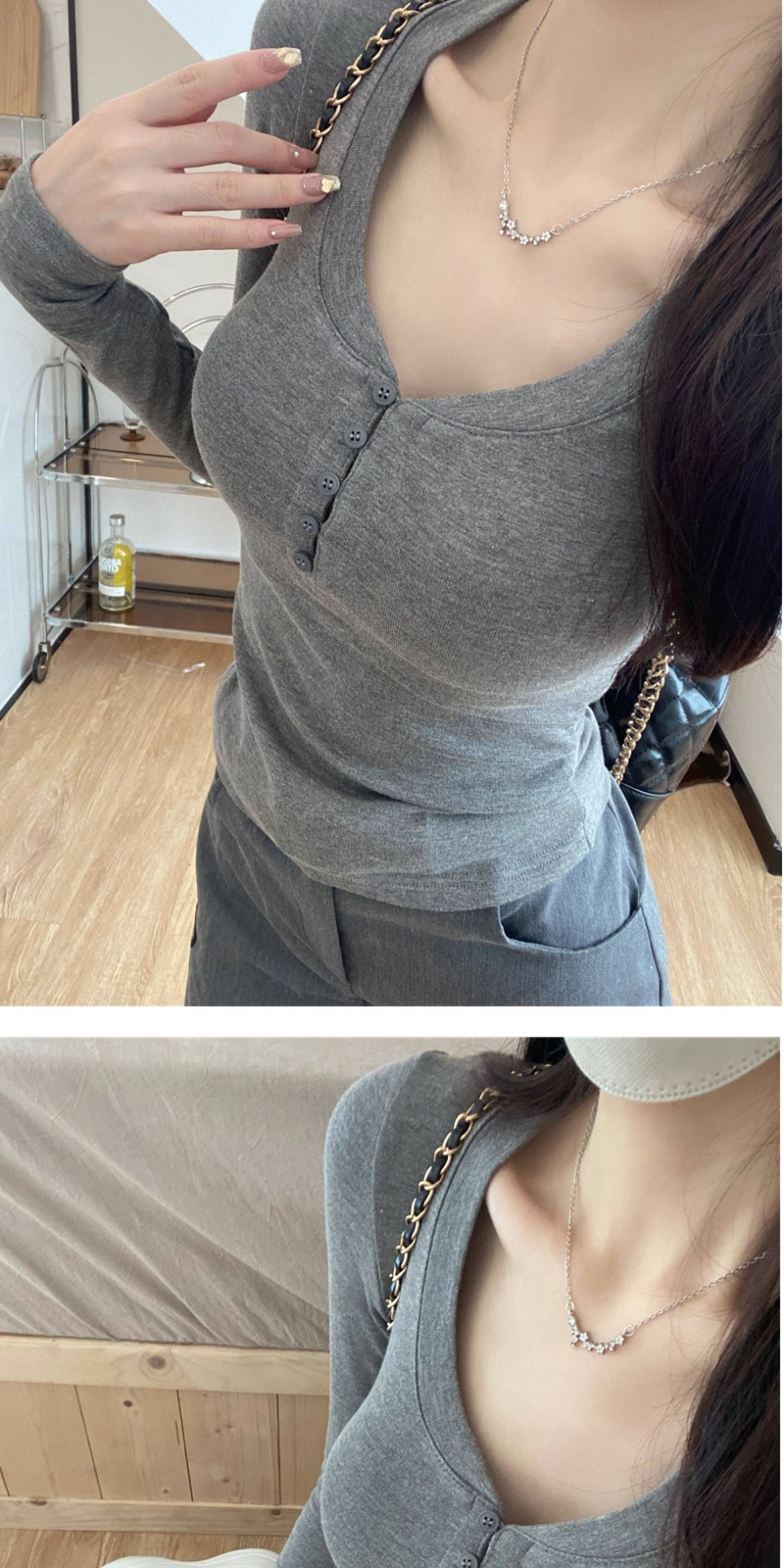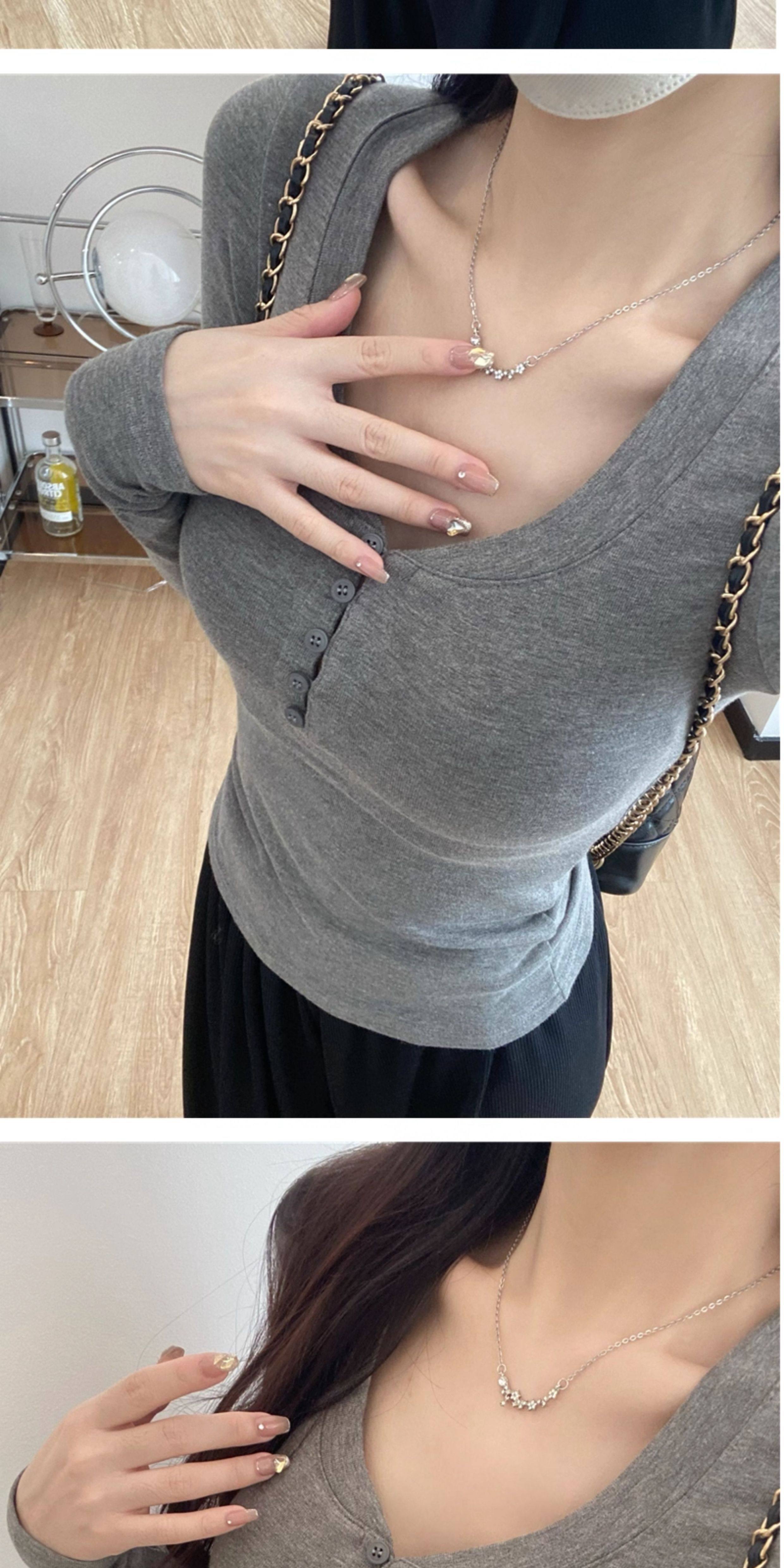 Large U-Neck Gray Long-Sleeve Base Shirt T-Shirt for Women, Autumn and Winter Slim Fit, Flattering and Stylish Inner Top