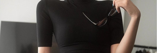 American-Style Black Half-High Collar Mid-Sleeve T-Shirt for Women, Autumn Sexy Tight-Fitting Slim-Fit Inner Layer Short Top
