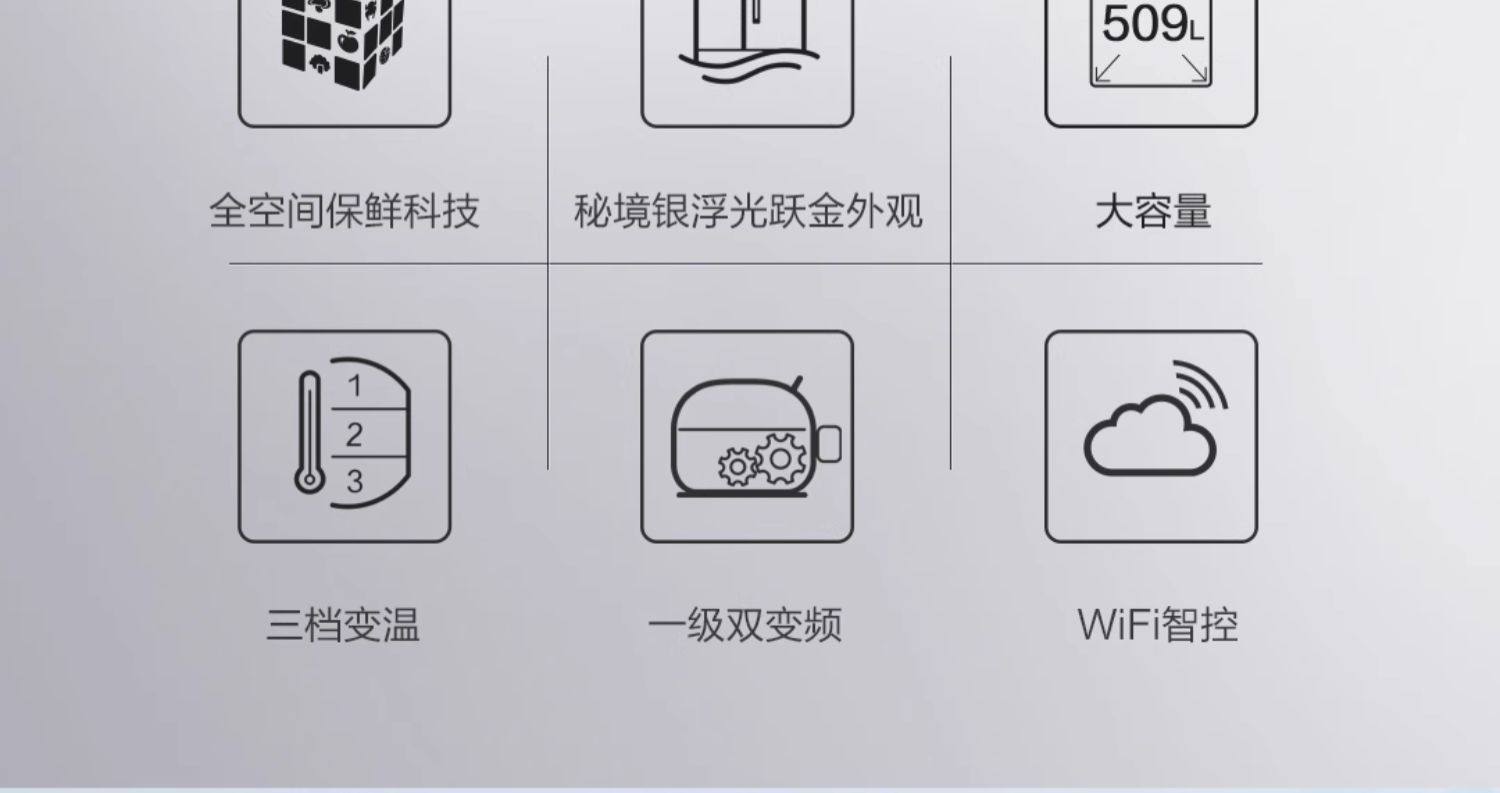 Color Classification Mysterious Silver 509L,Mysterious Silver 509L [Compressor Ten-Year Warranty],Mysterious Silver 509L [Ten-Year Warranty on the Entire Machine],Xingyun Silver 510L,Xingyun Silver 510L [Compressor Ten-Year Warranty],Xingyun Silver 510 Liters [Ten-Year Warranty on the Entire Machine],Ice White 510 Liters,Ice White 510 Liters [Ten-Year Warranty on Compressor],Ice White 510L [10-Year Warranty on the Entire Unit]