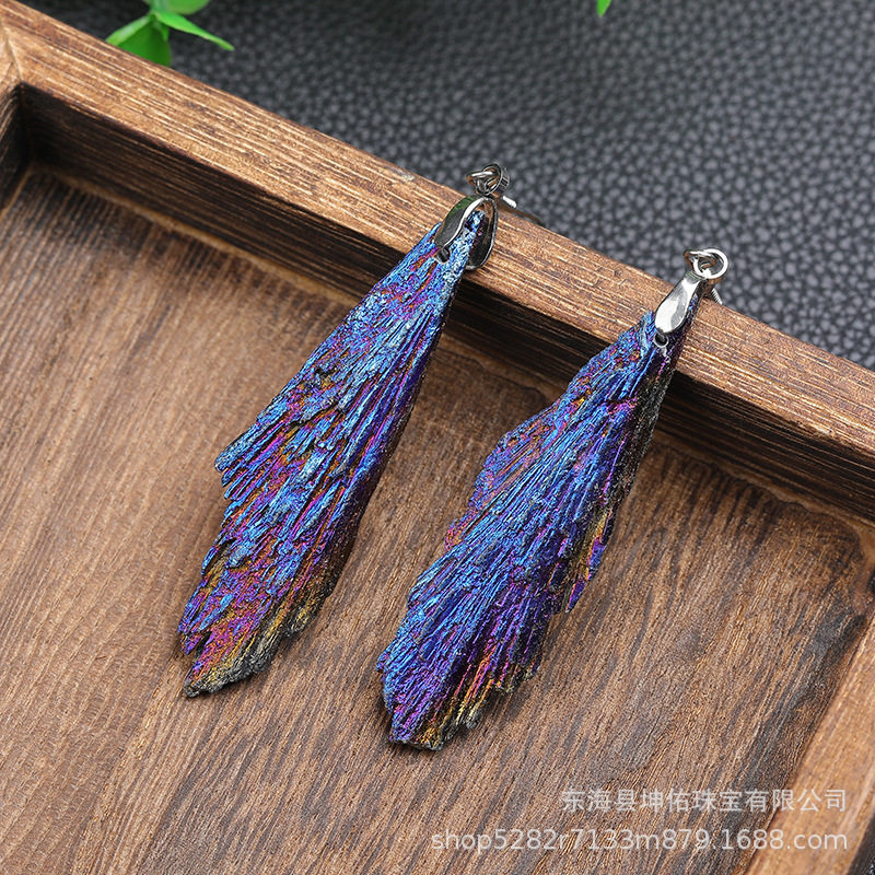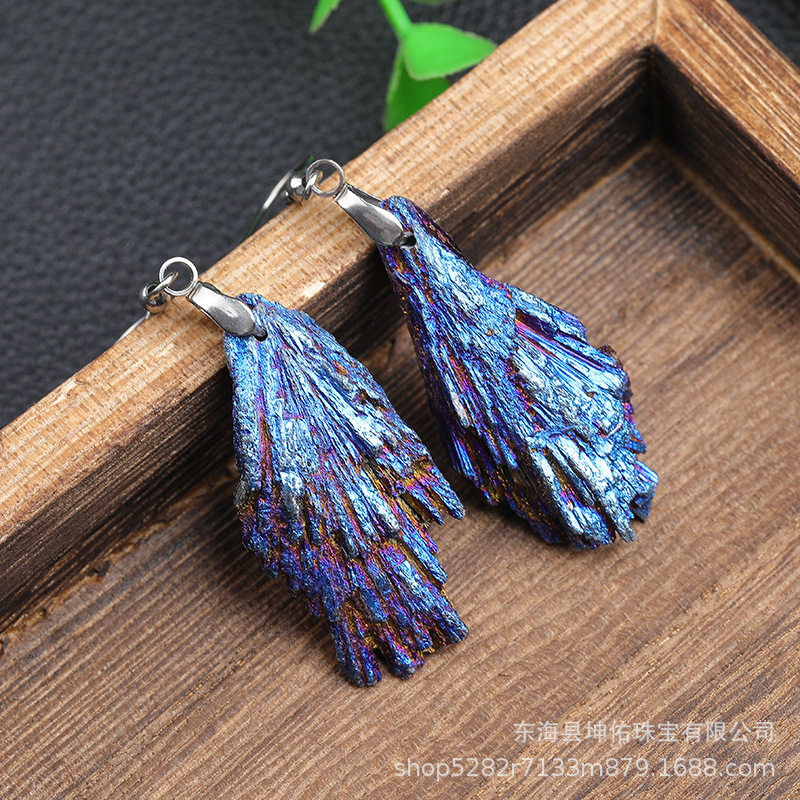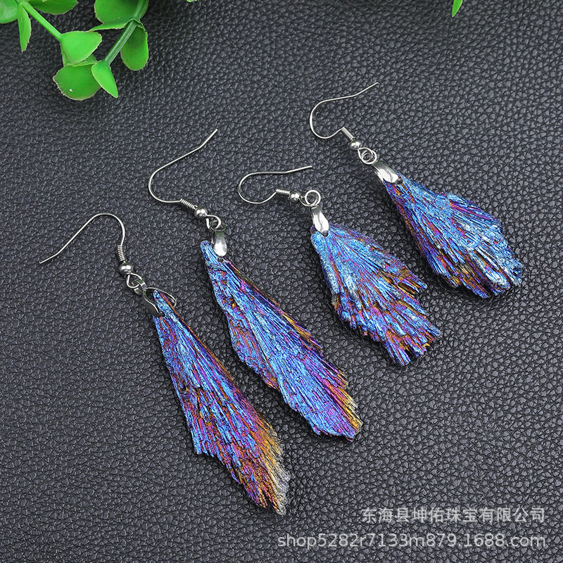 Natural Black Tourmaline Electroplated Blue Peacock Blue Flame Feather Crystal Cluster Earrings Jewelry in Stock