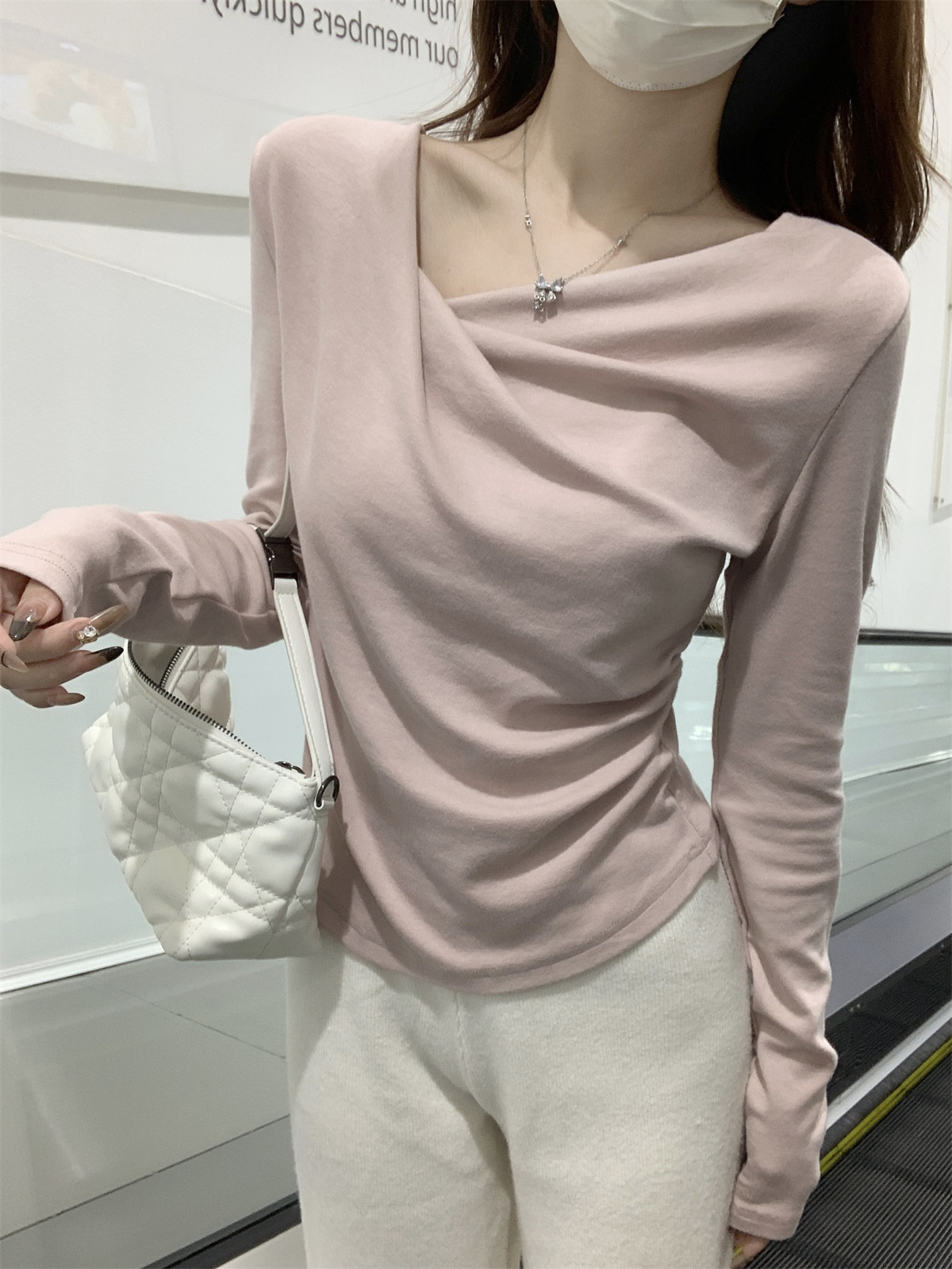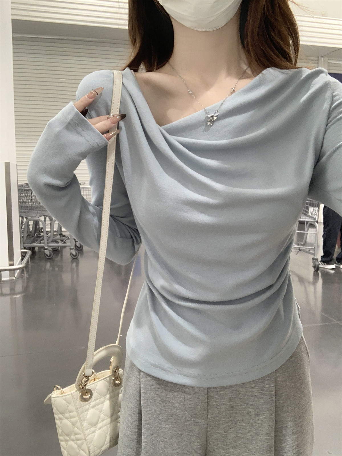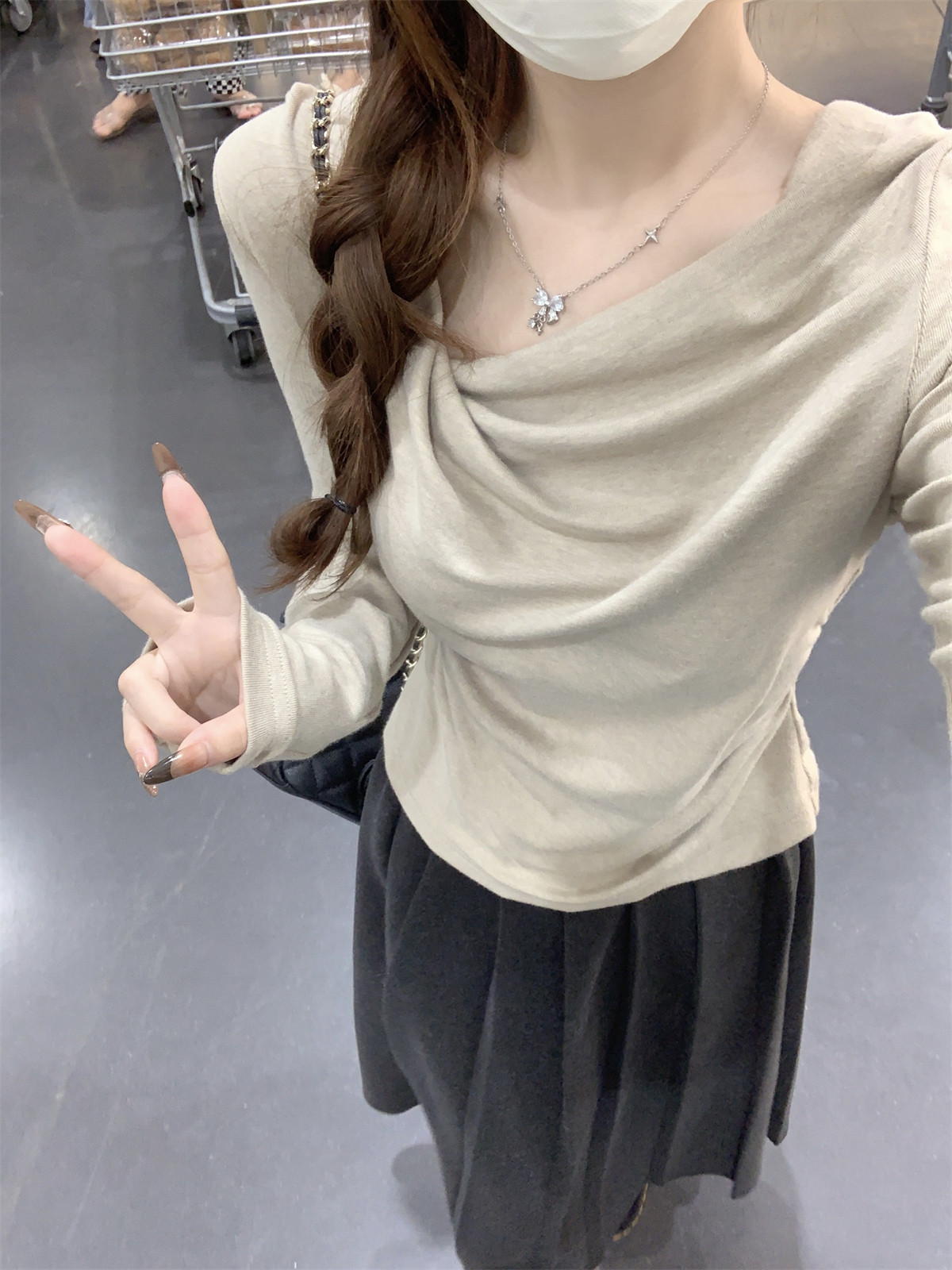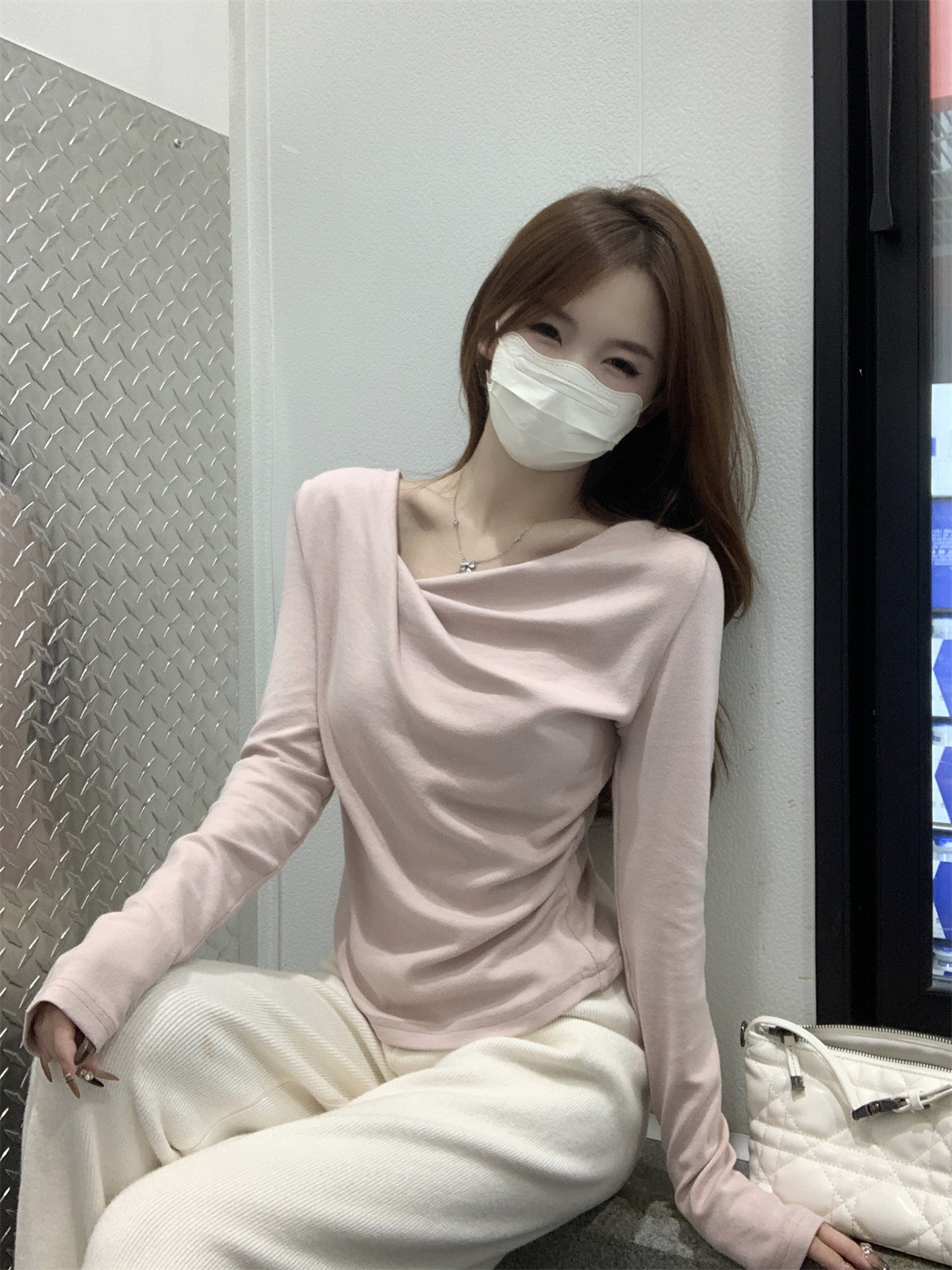 Gentle and Elegant Pleated Scoop-Neck Long-Sleeve T-Shirt for Women, Spring New Korean Style Slim-Fit Base Shirt