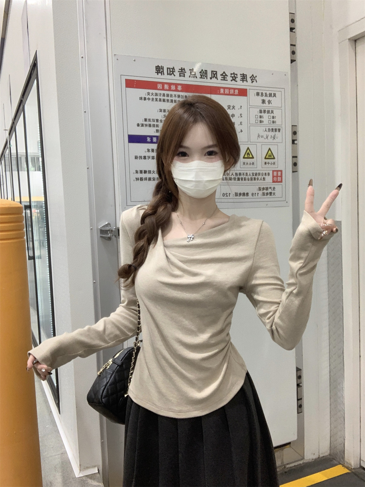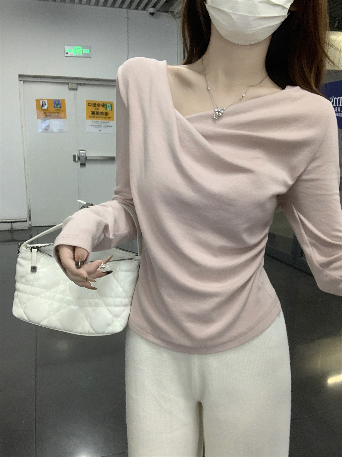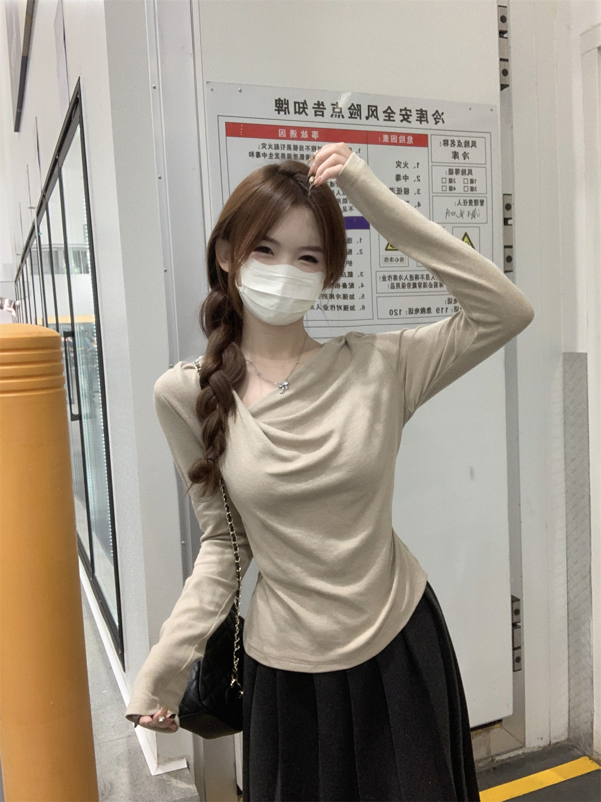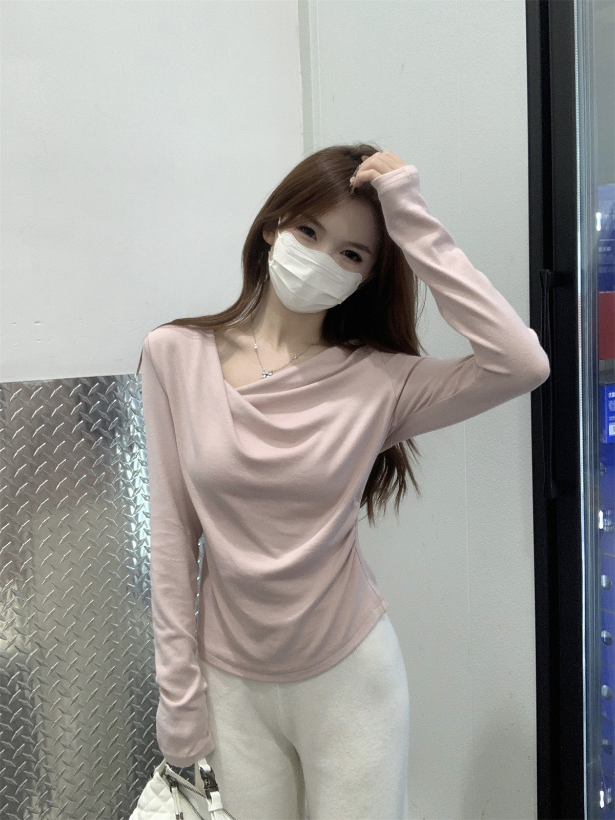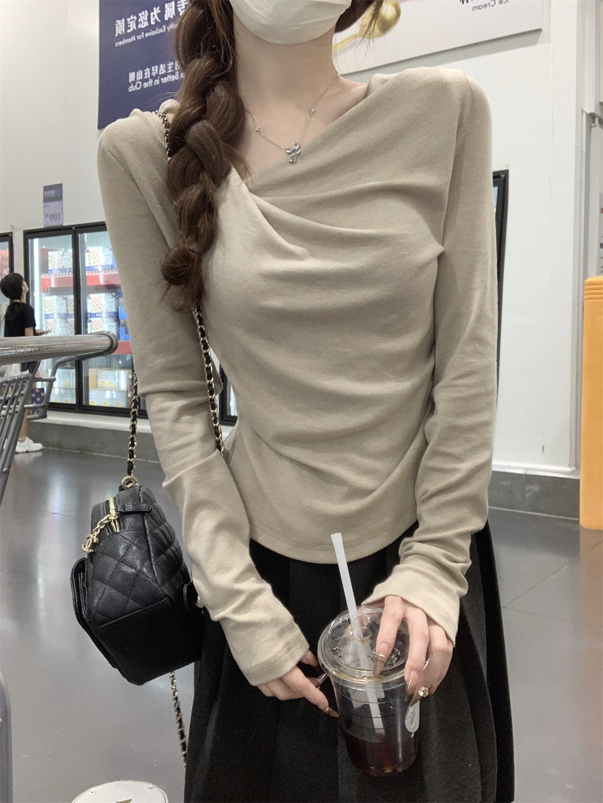 Gentle and Elegant Pleated Scoop-Neck Long-Sleeve T-Shirt for Women, Spring New Korean Style Slim-Fit Base Shirt