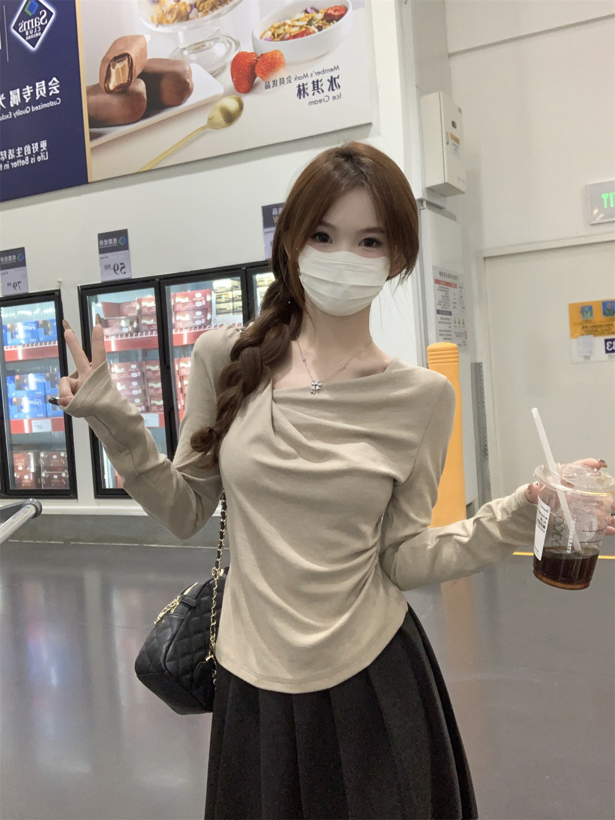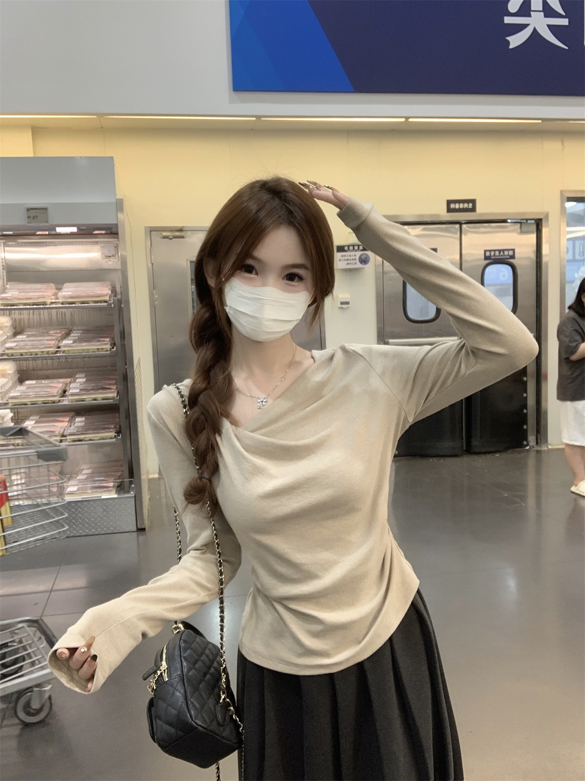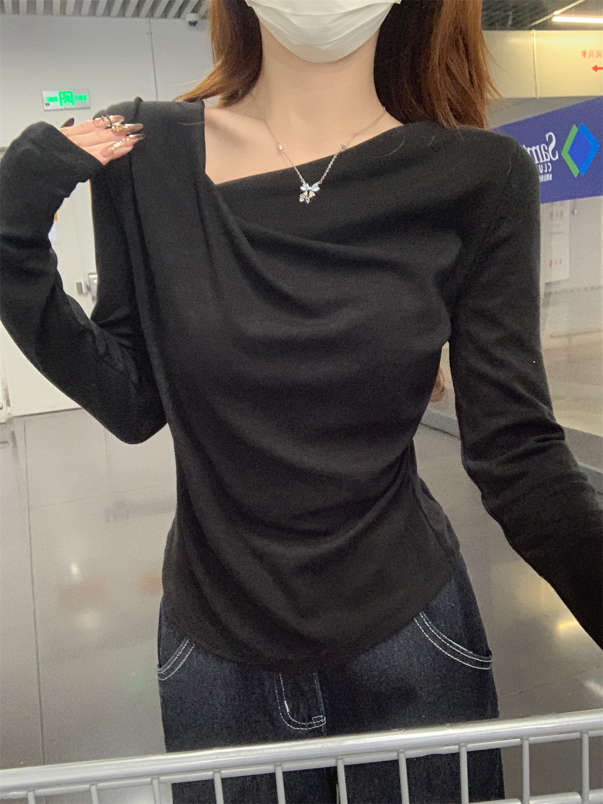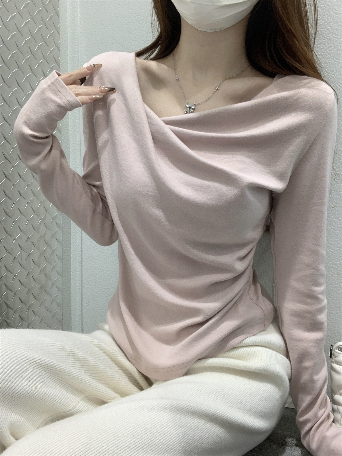 Gentle and Elegant Pleated Scoop-Neck Long-Sleeve T-Shirt for Women, Spring New Korean Style Slim-Fit Base Shirt