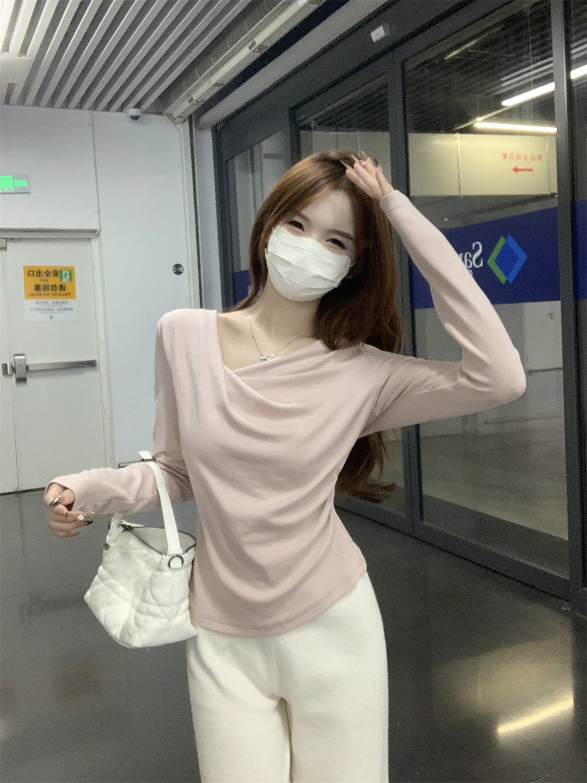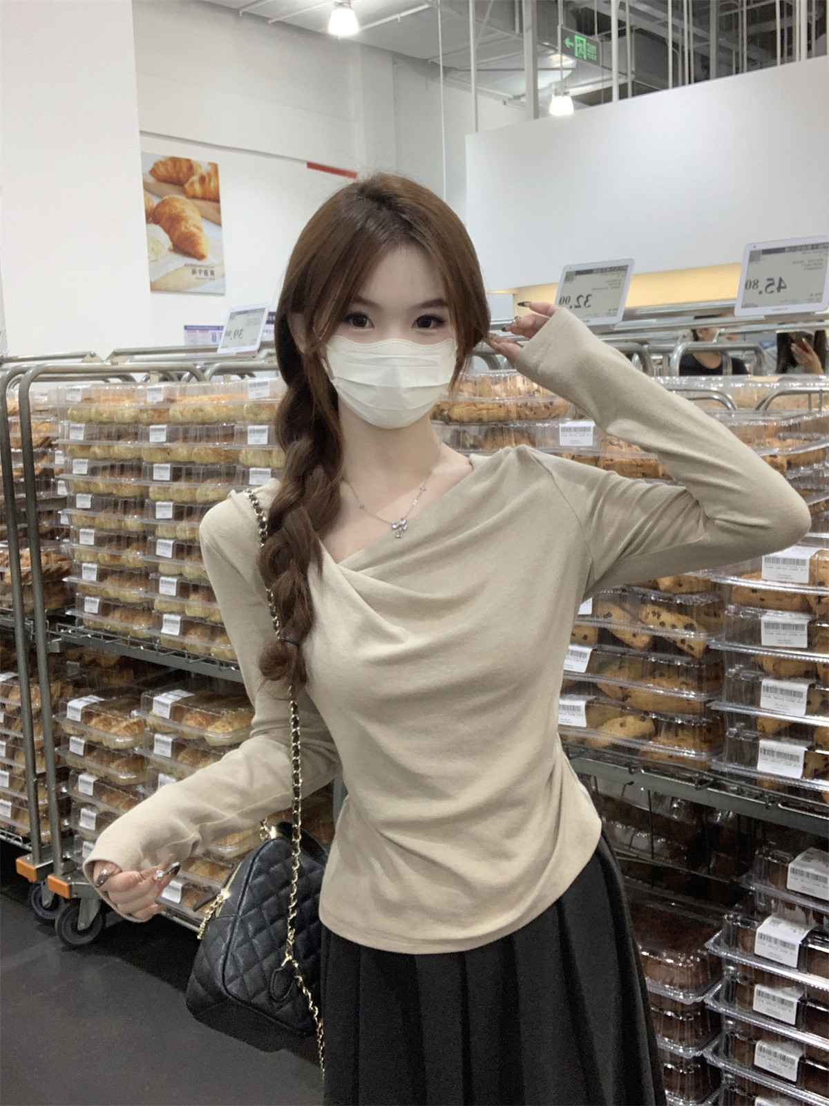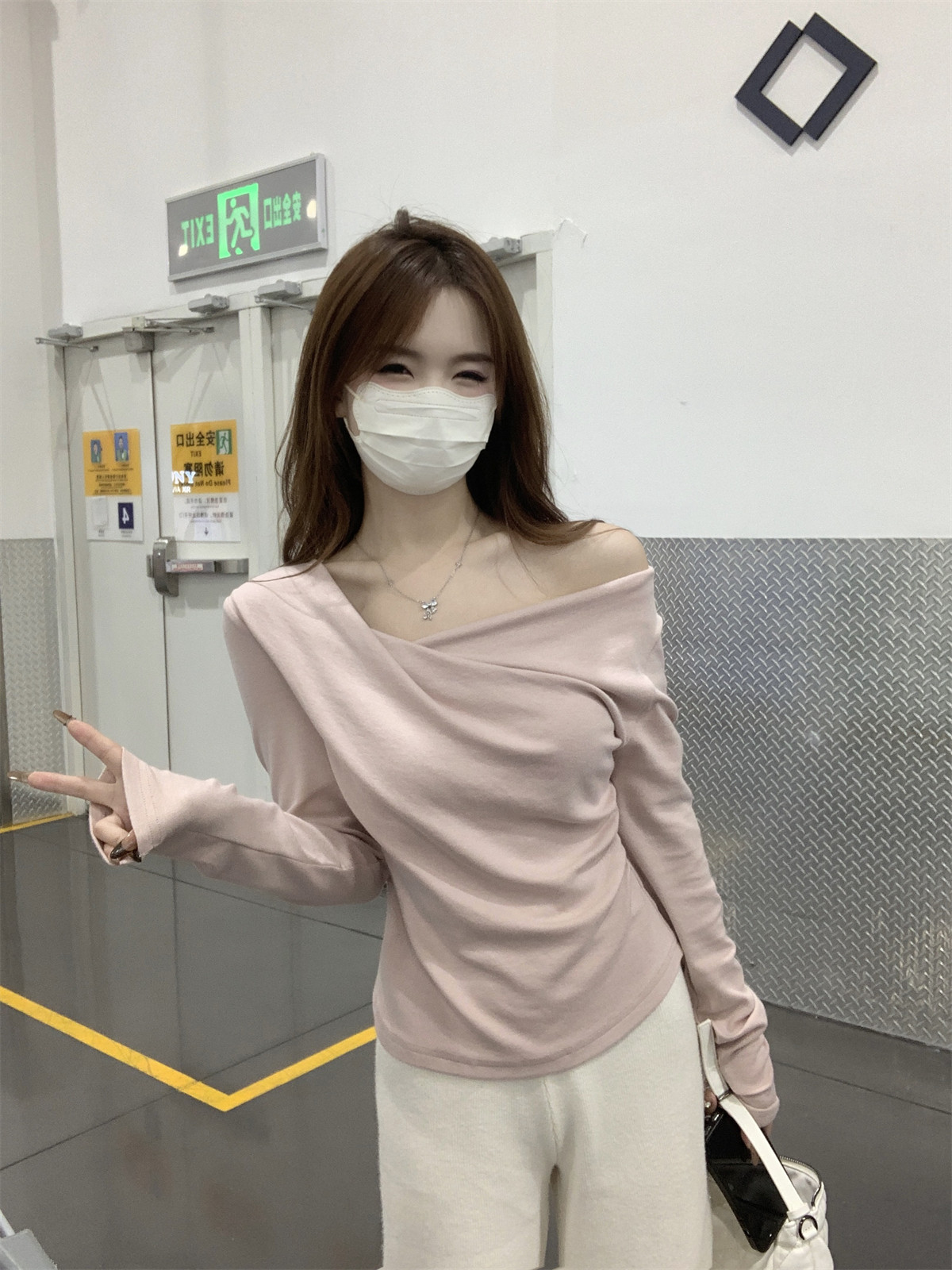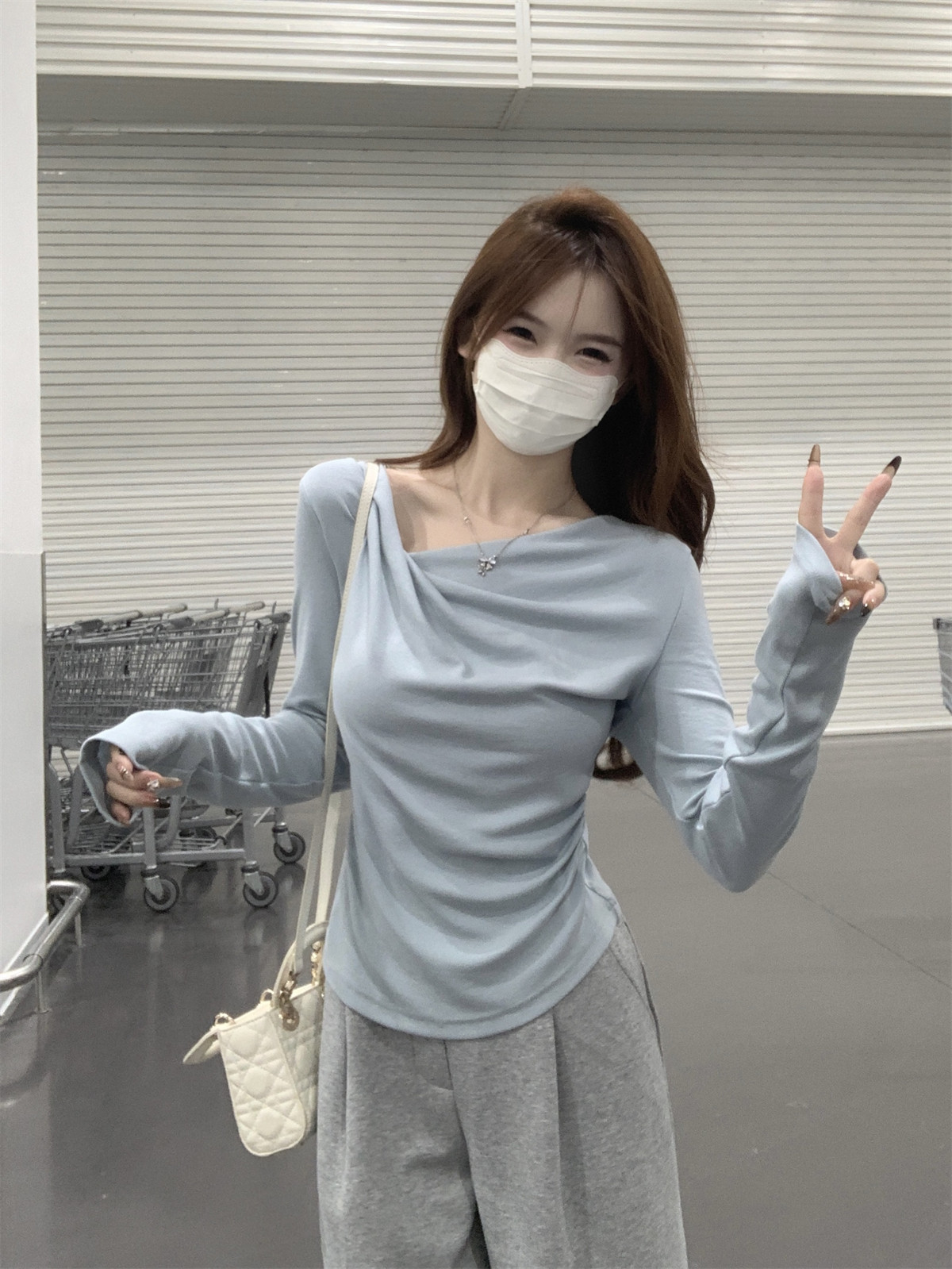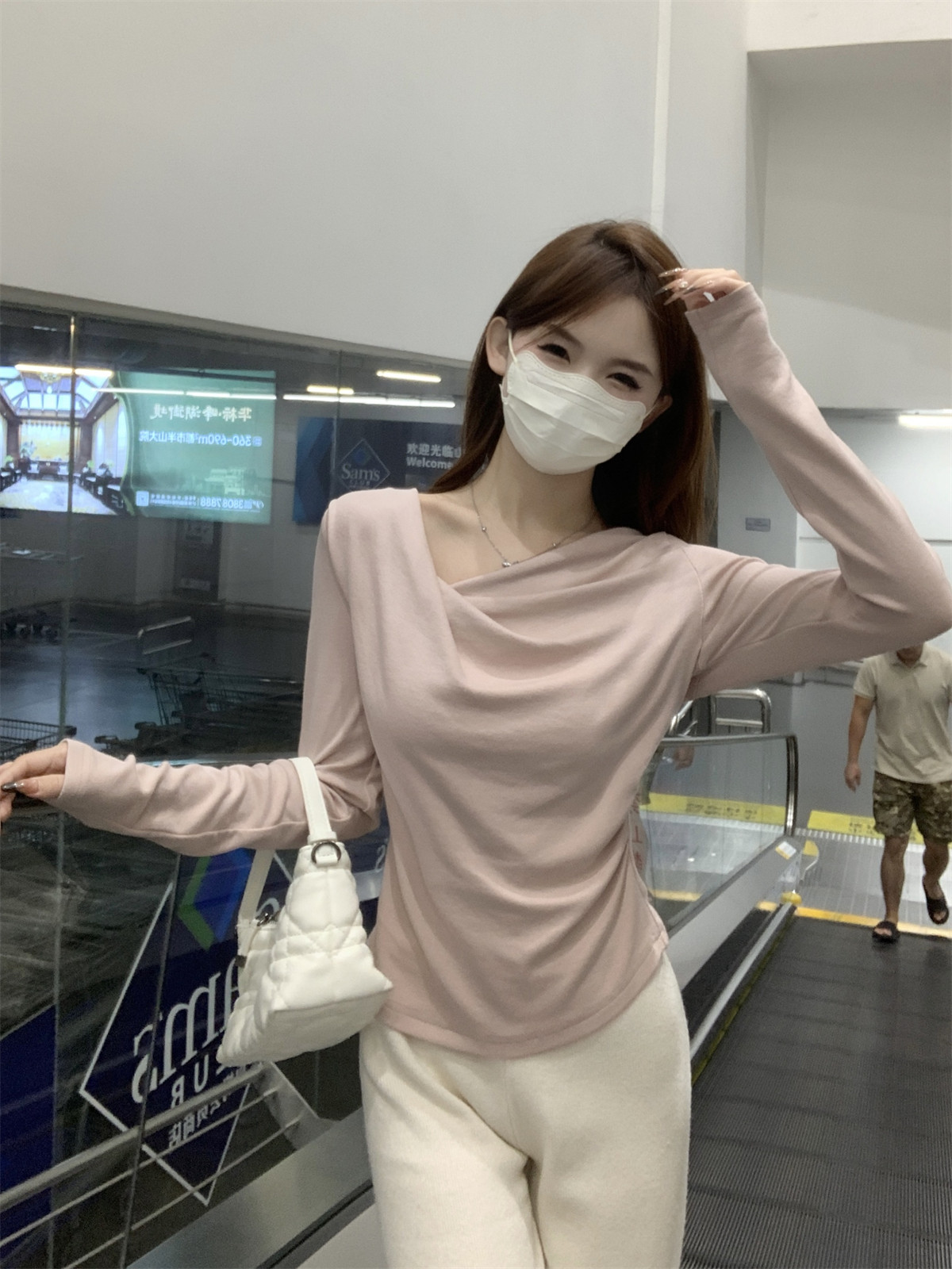Gentle and Elegant Pleated Scoop-Neck Long-Sleeve T-Shirt for Women, Spring New Korean Style Slim-Fit Base Shirt