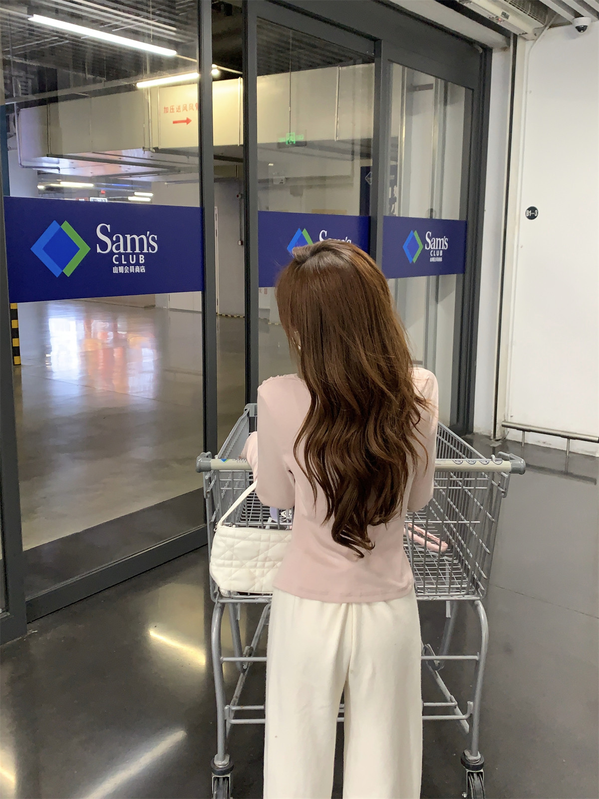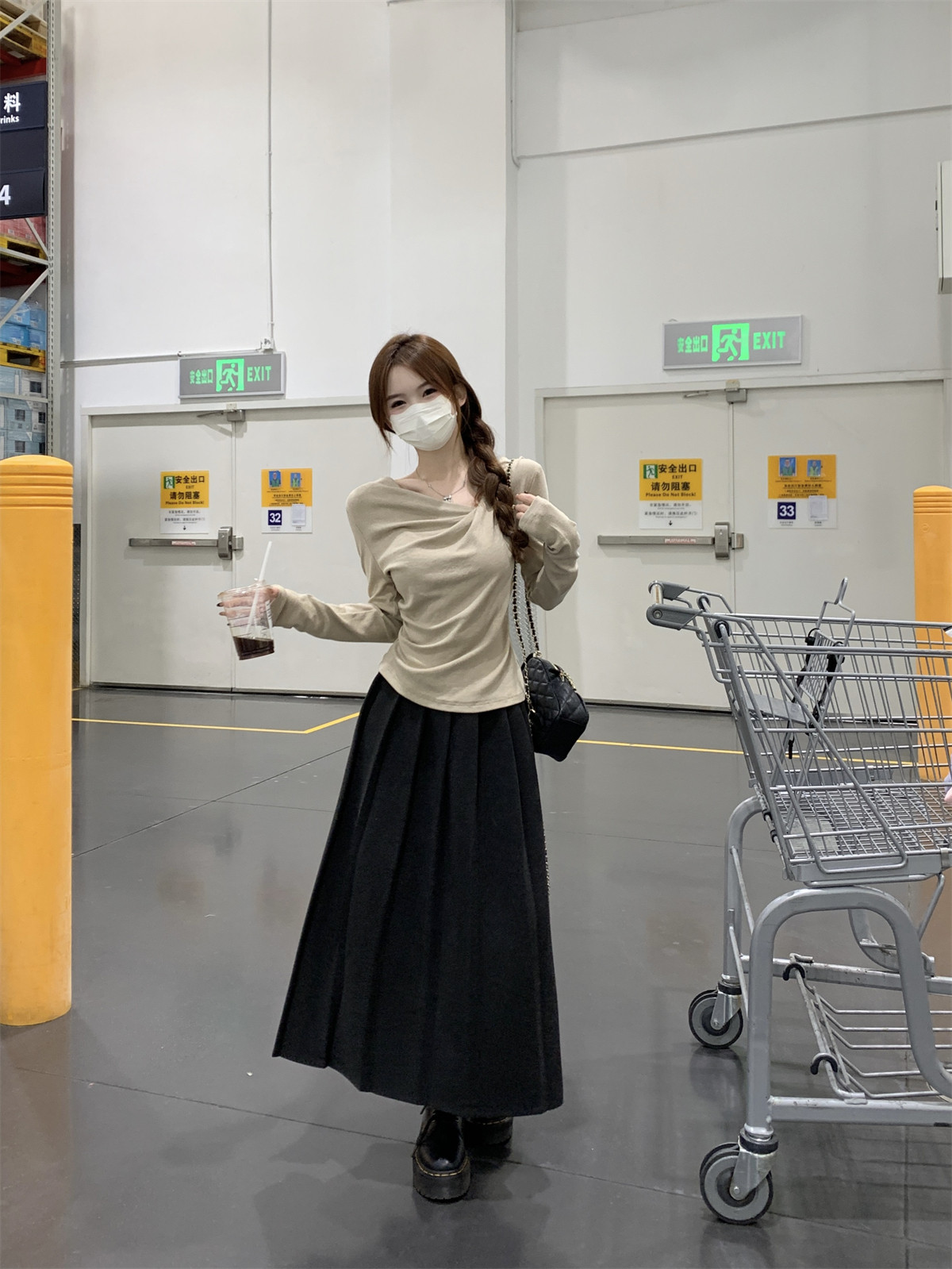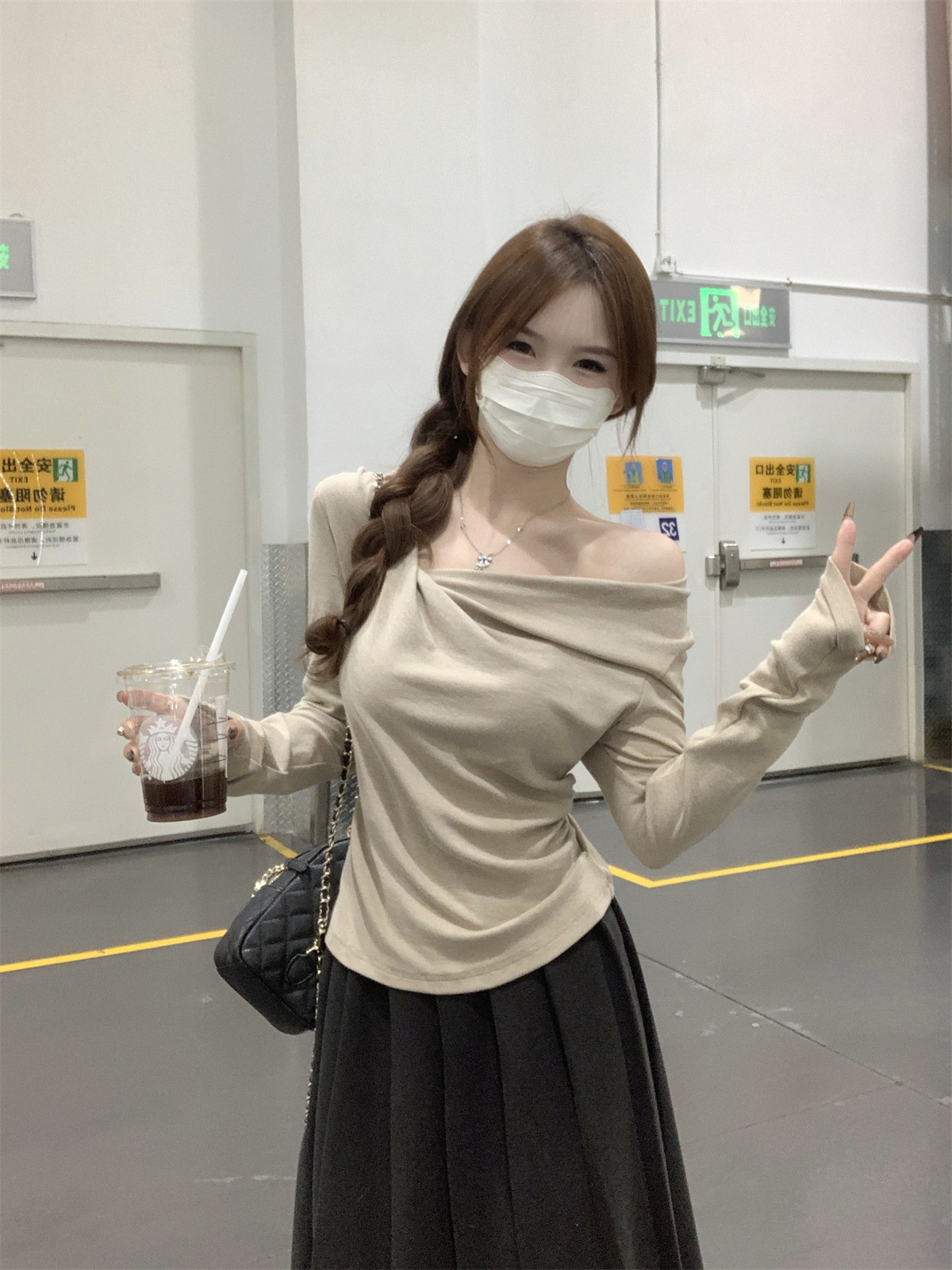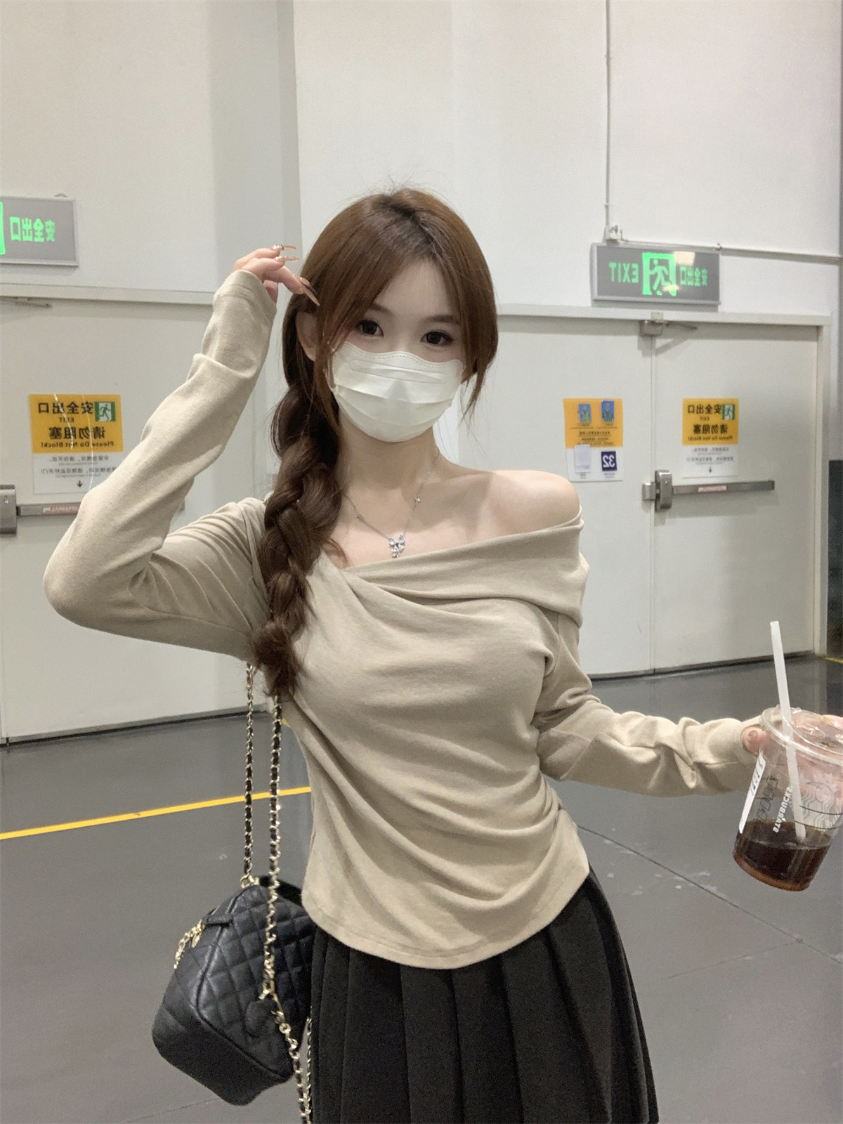 Gentle and Elegant Pleated Scoop-Neck Long-Sleeve T-Shirt for Women, Spring New Korean Style Slim-Fit Base Shirt