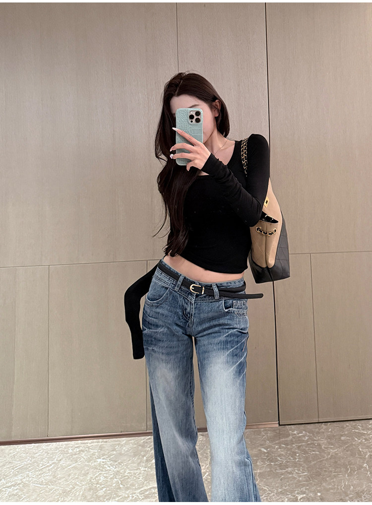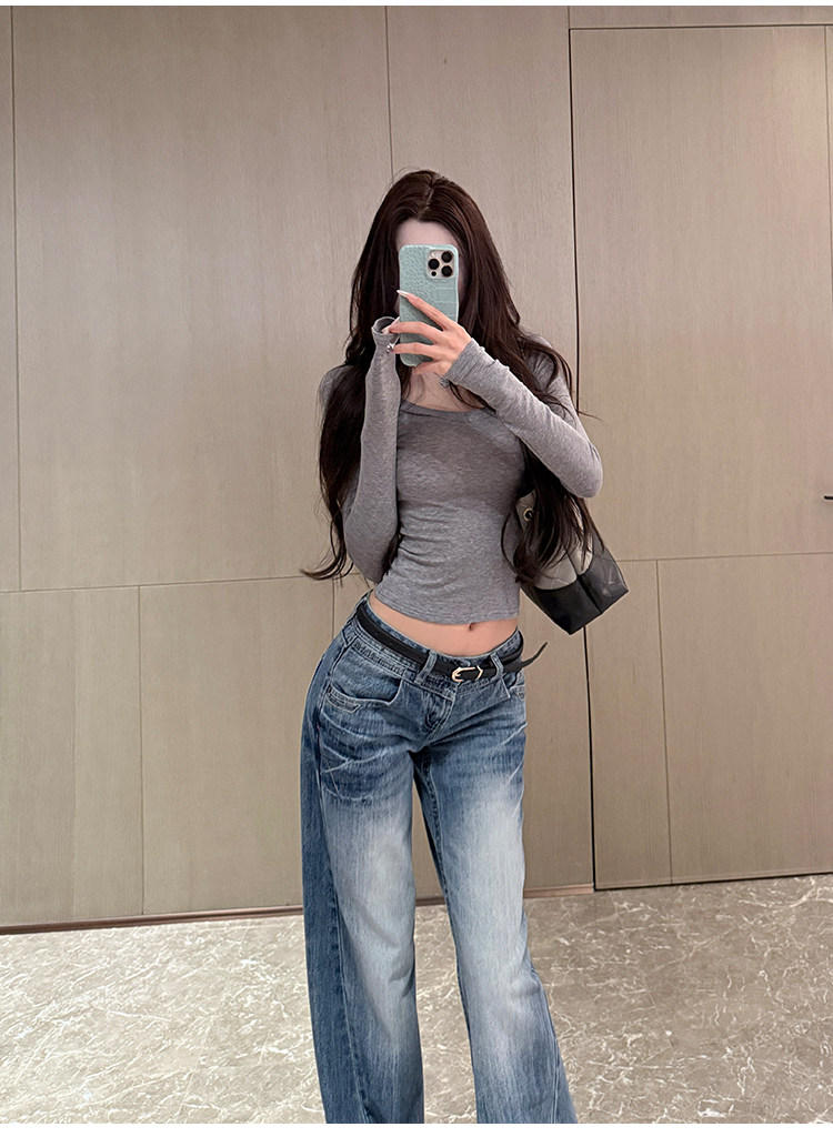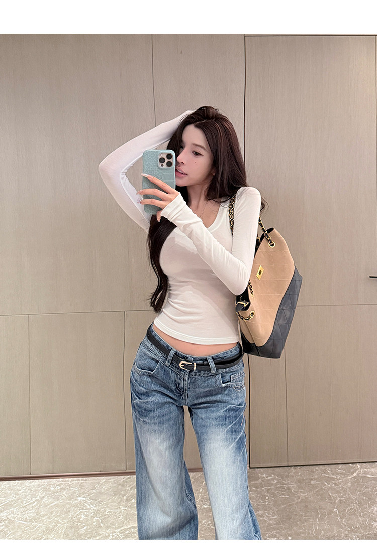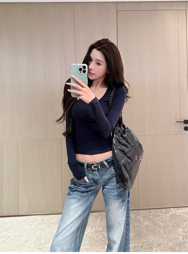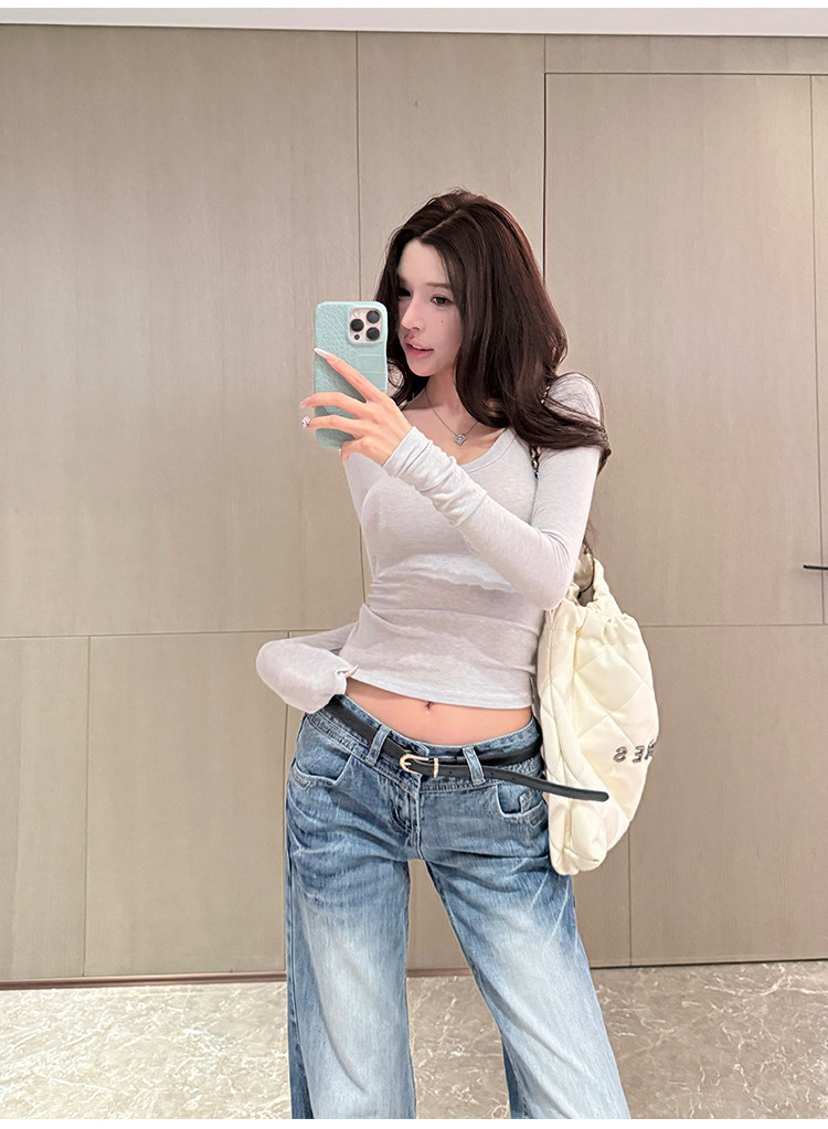 Sweet and Spicy Girl Sexy Low-Cut U-Neck Top for Women, Autumn and Winter American Style Short Slim-Fit Long-Sleeve Stretchy Inner T-Shirt Base Layer