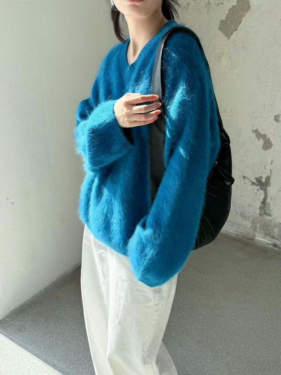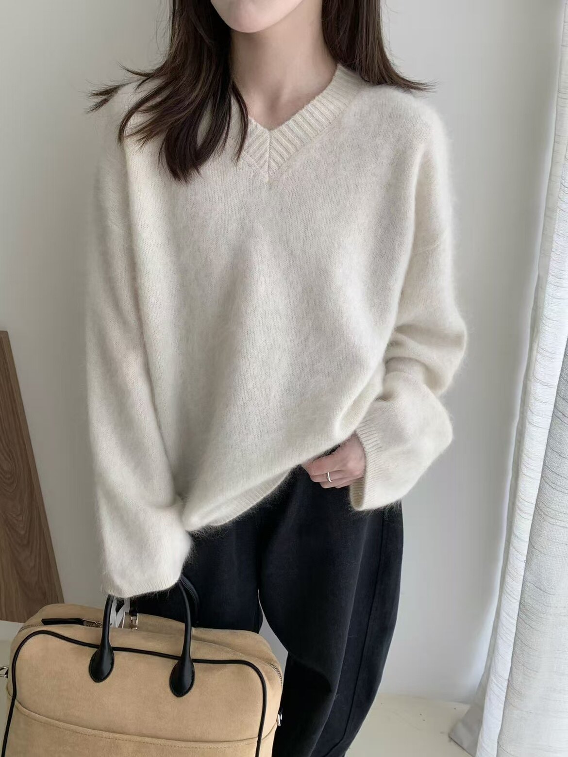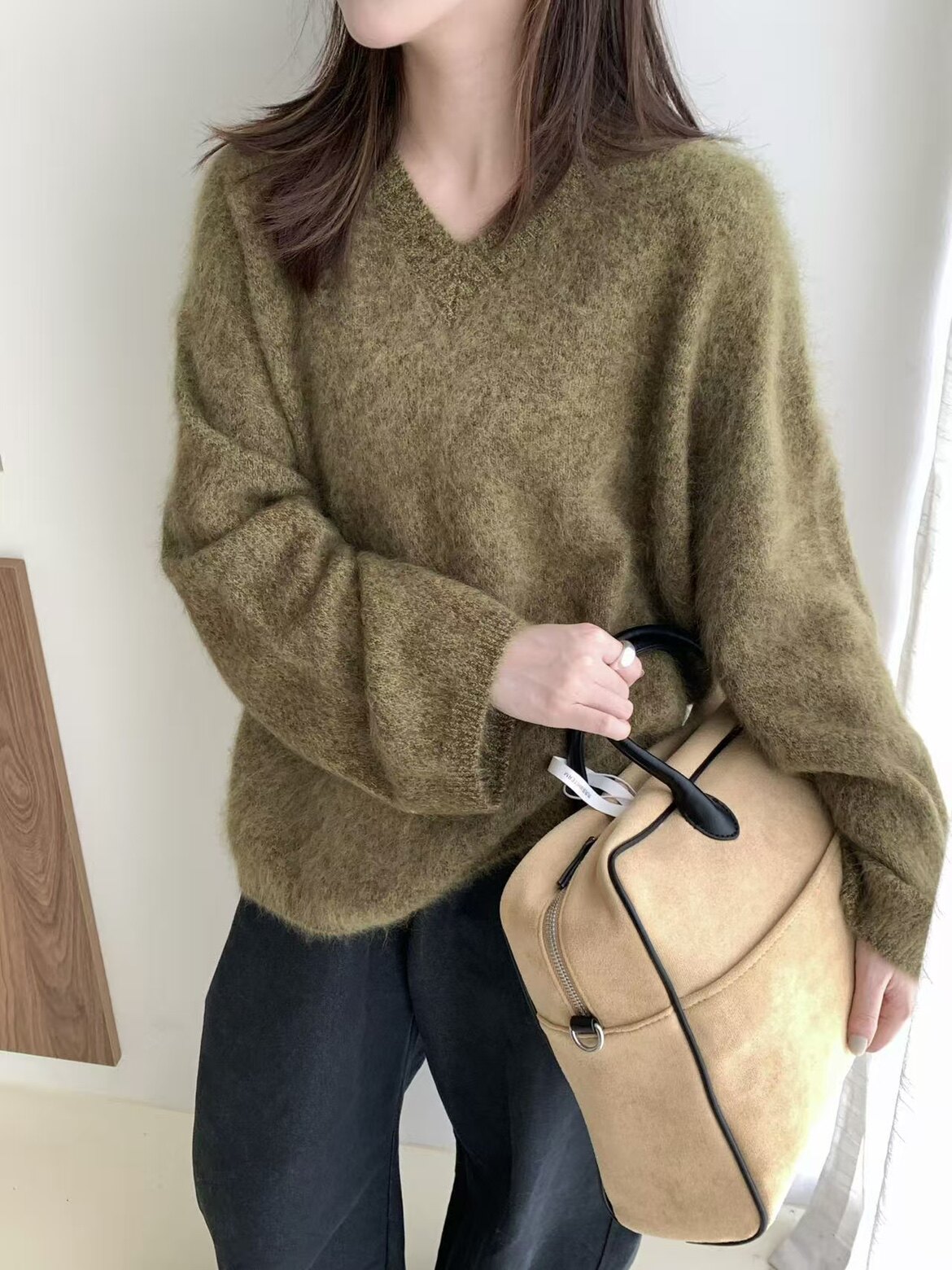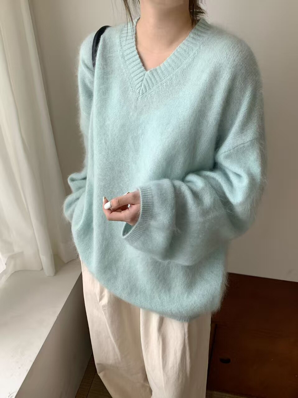 Wool Brushed 79002 New Korean Style V-Neck Long-Sleeved Knitwear for Women, Loose Furry Sweater, Mid-Length Outer Wear