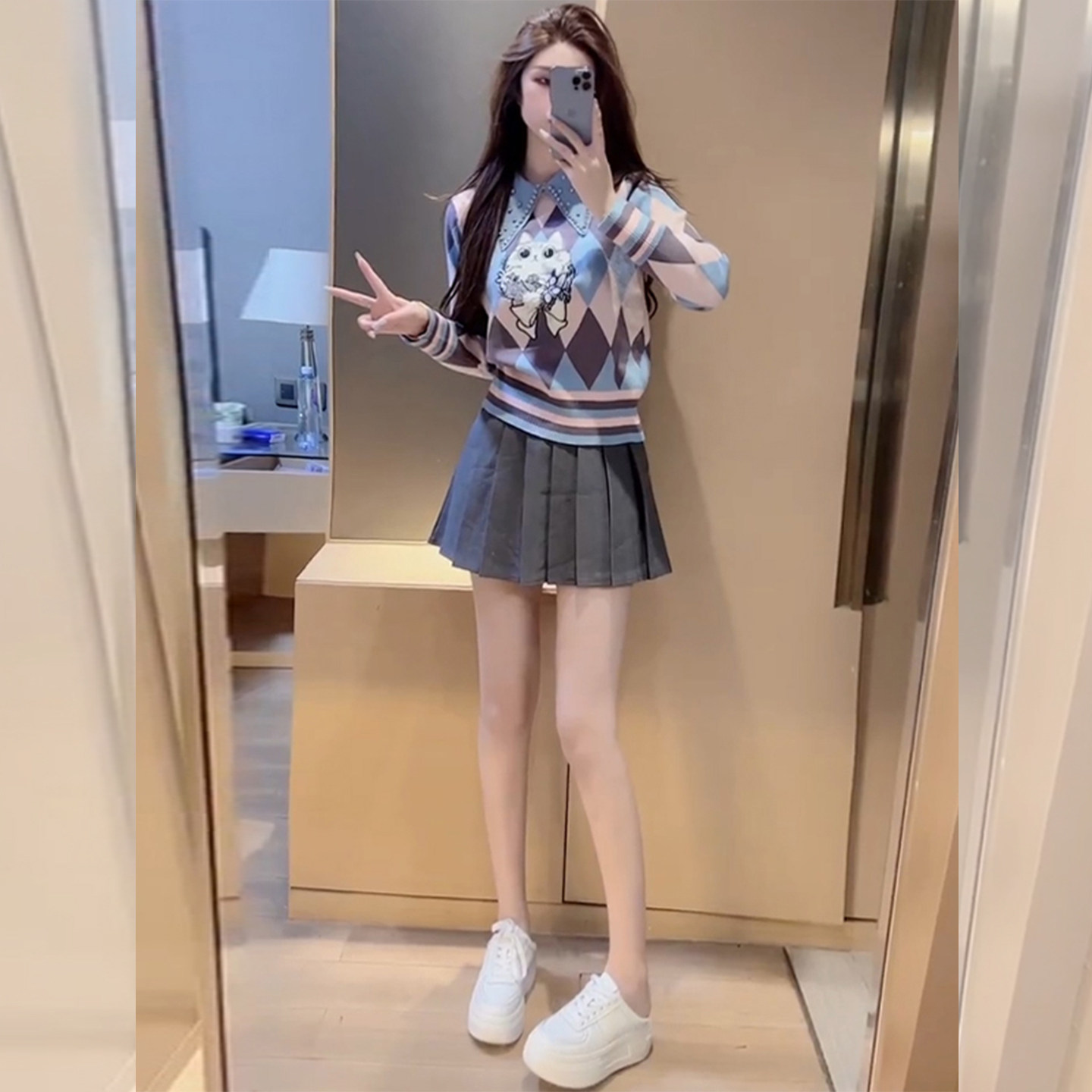 Sort by color Blue top,Dark gray pleated skirt,Blue top + gray pleated skirt