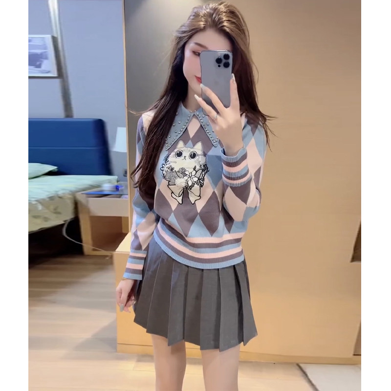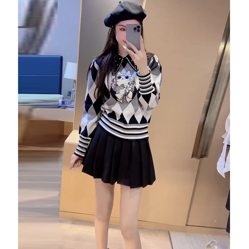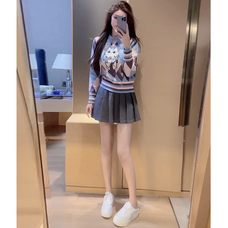 College style fashion suit for women autumn 2025 new versatile age-reducing knitted long-sleeved top pleated skirt two-piece set