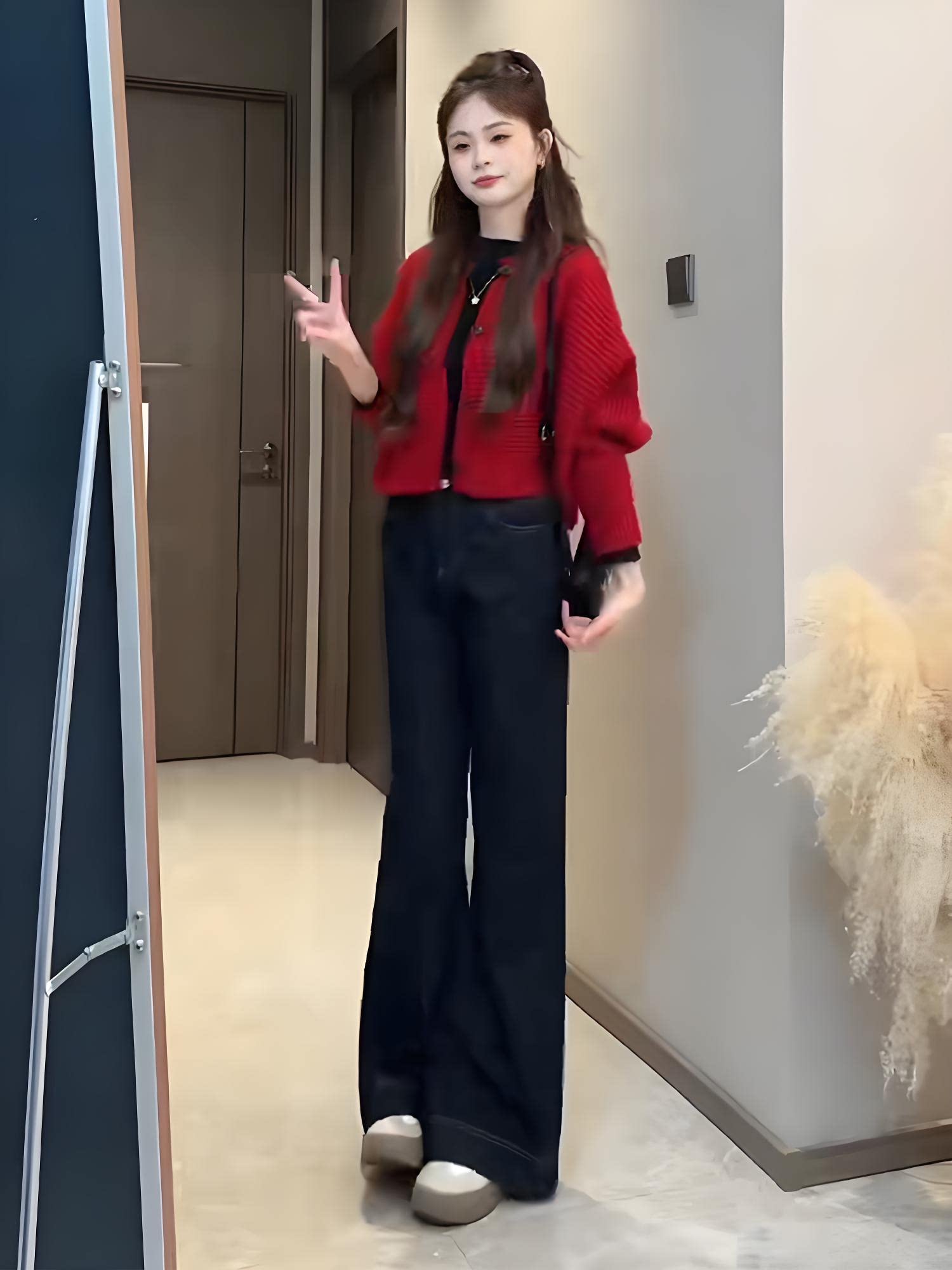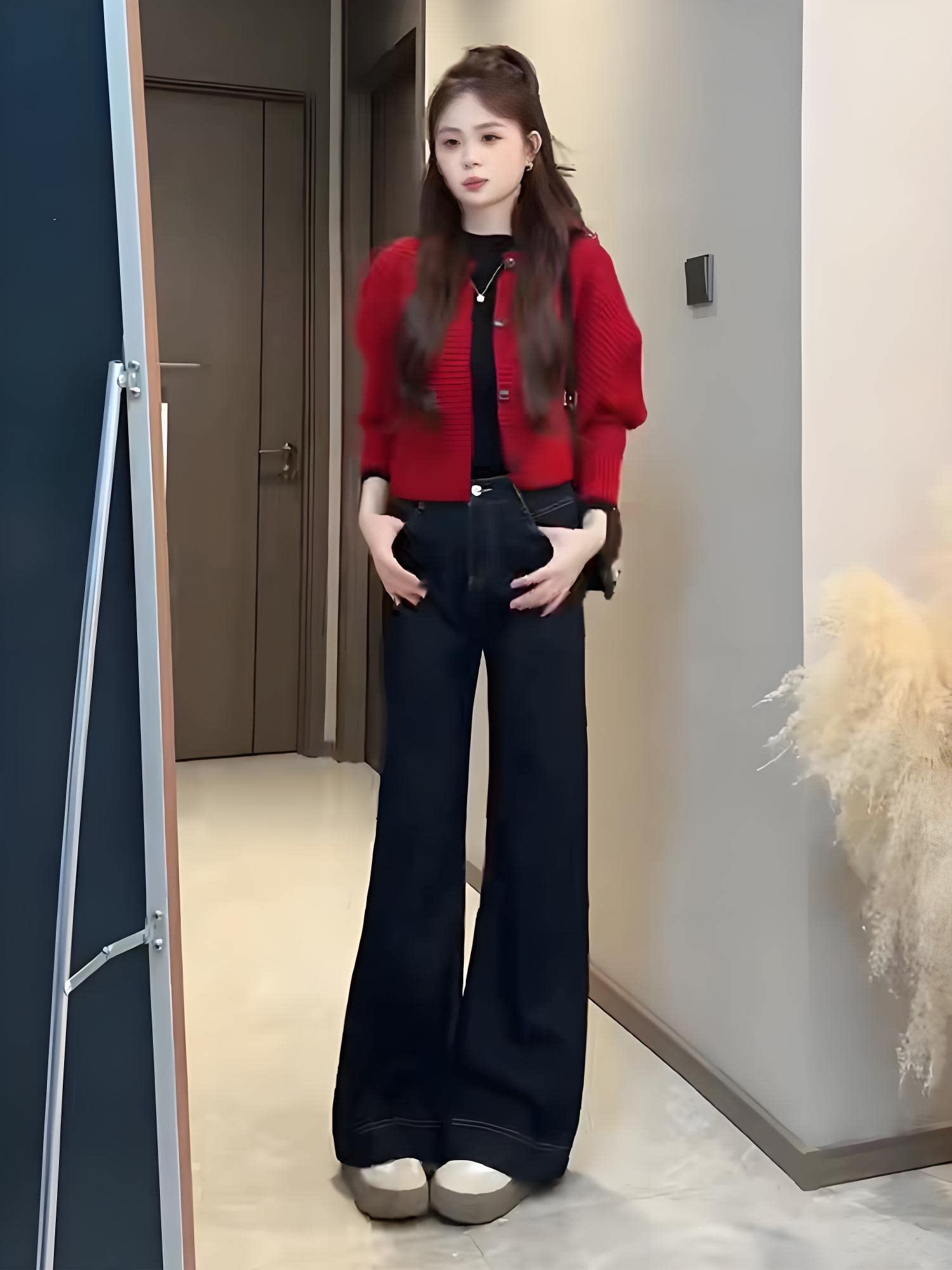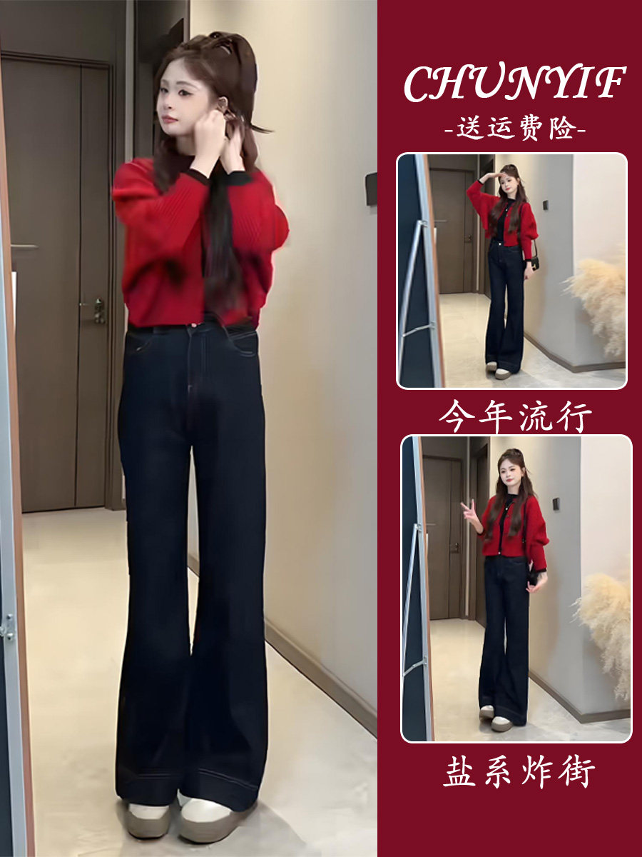 Spring's Stunning Two-Piece Set 2026: a Relaxed and Stylish Outfit with a Red Knit Cardigan and Jeans Set
