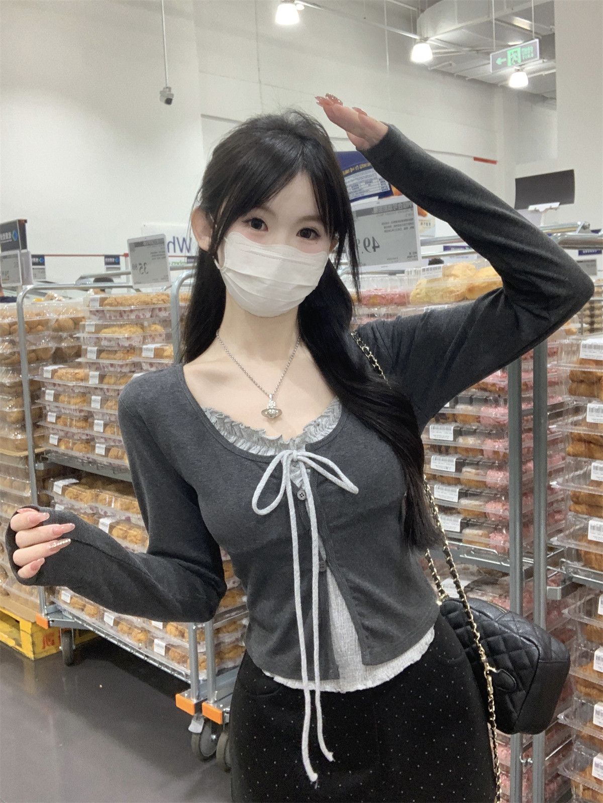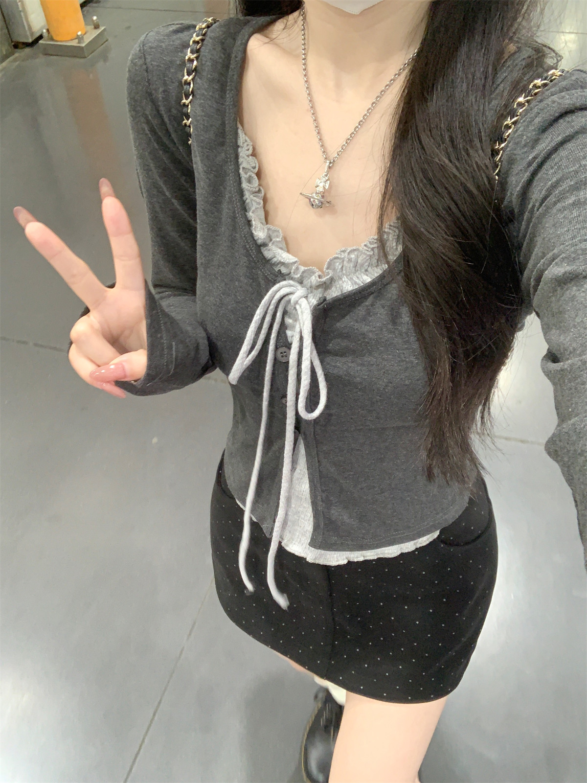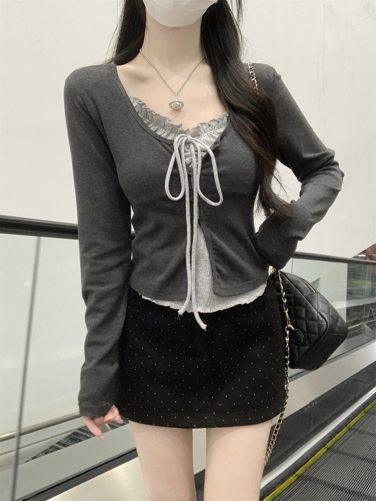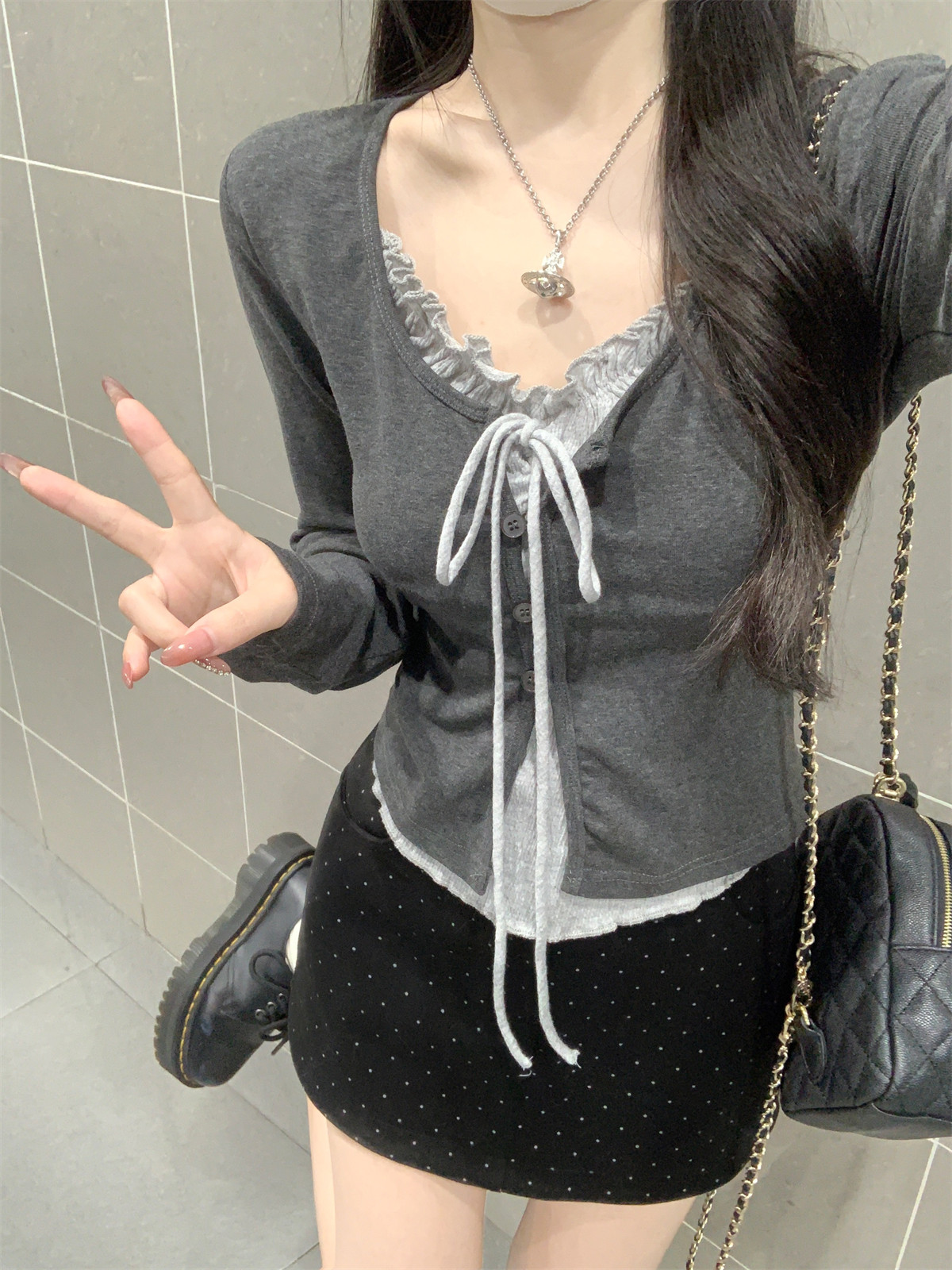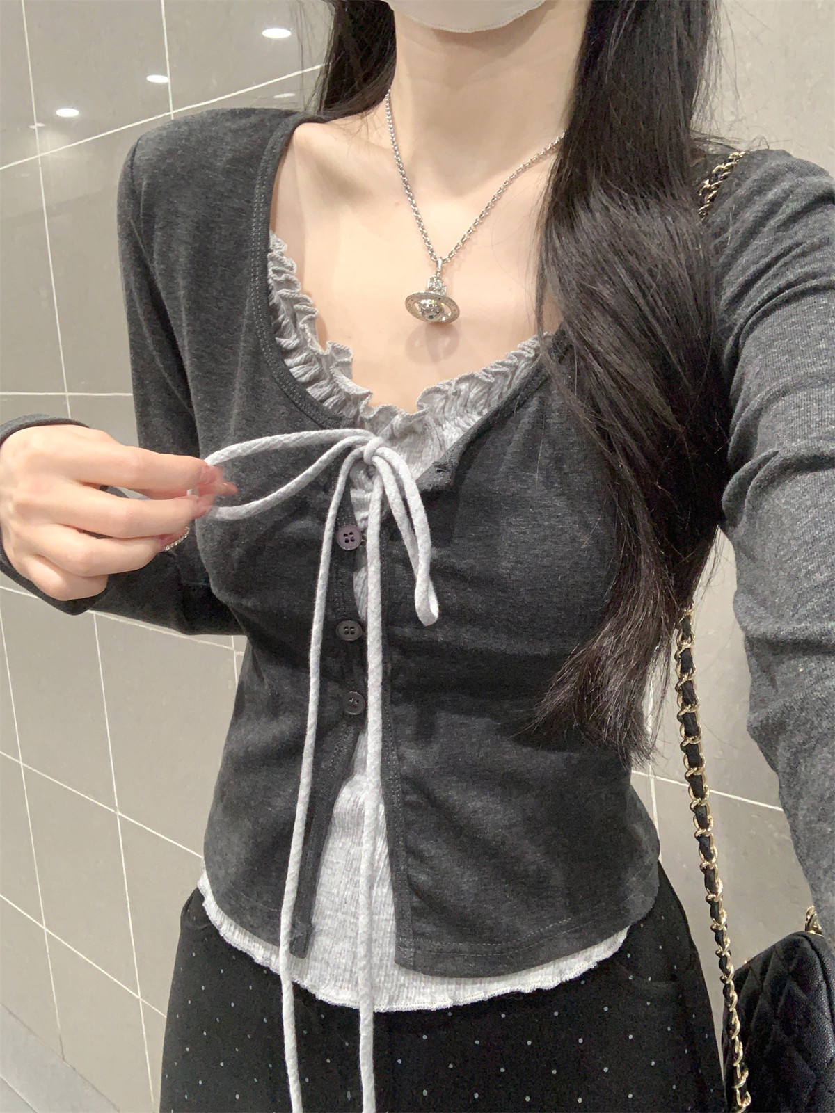 Korean Style Ruffled Design Fake Two-Piece Women's Long-Sleeve Spring New Tie-Neck Round-Neck Color-Block Slim Short Top