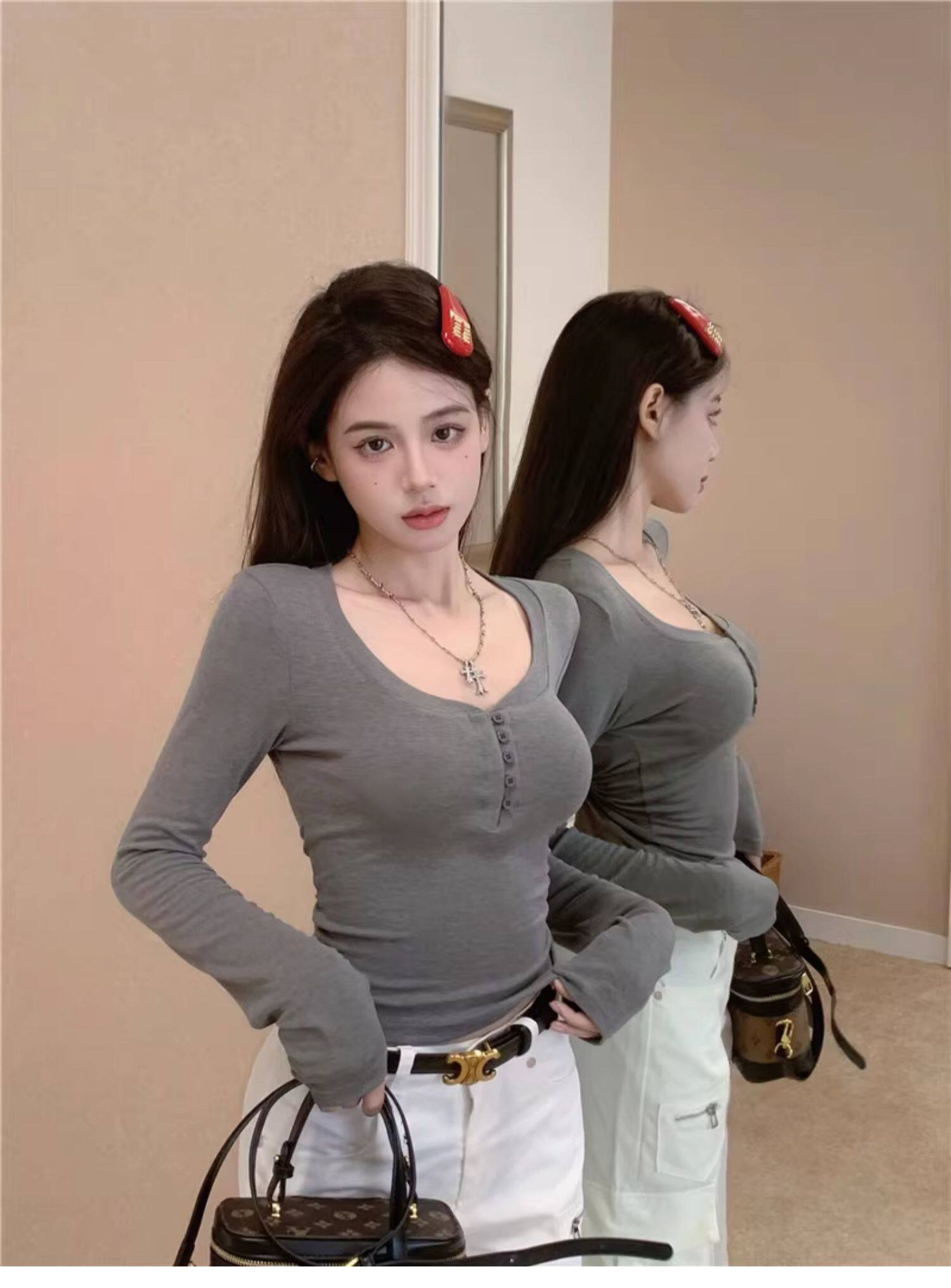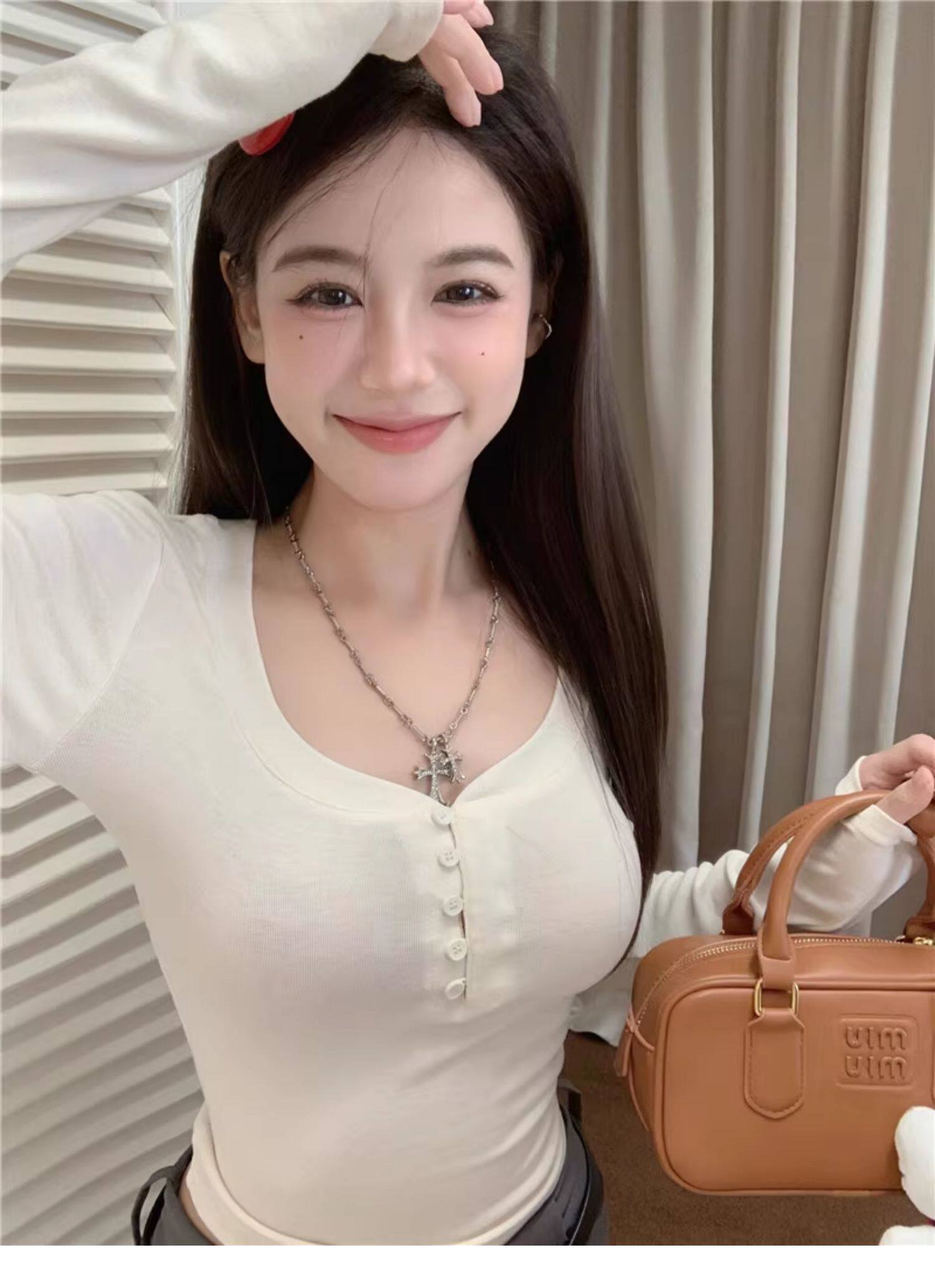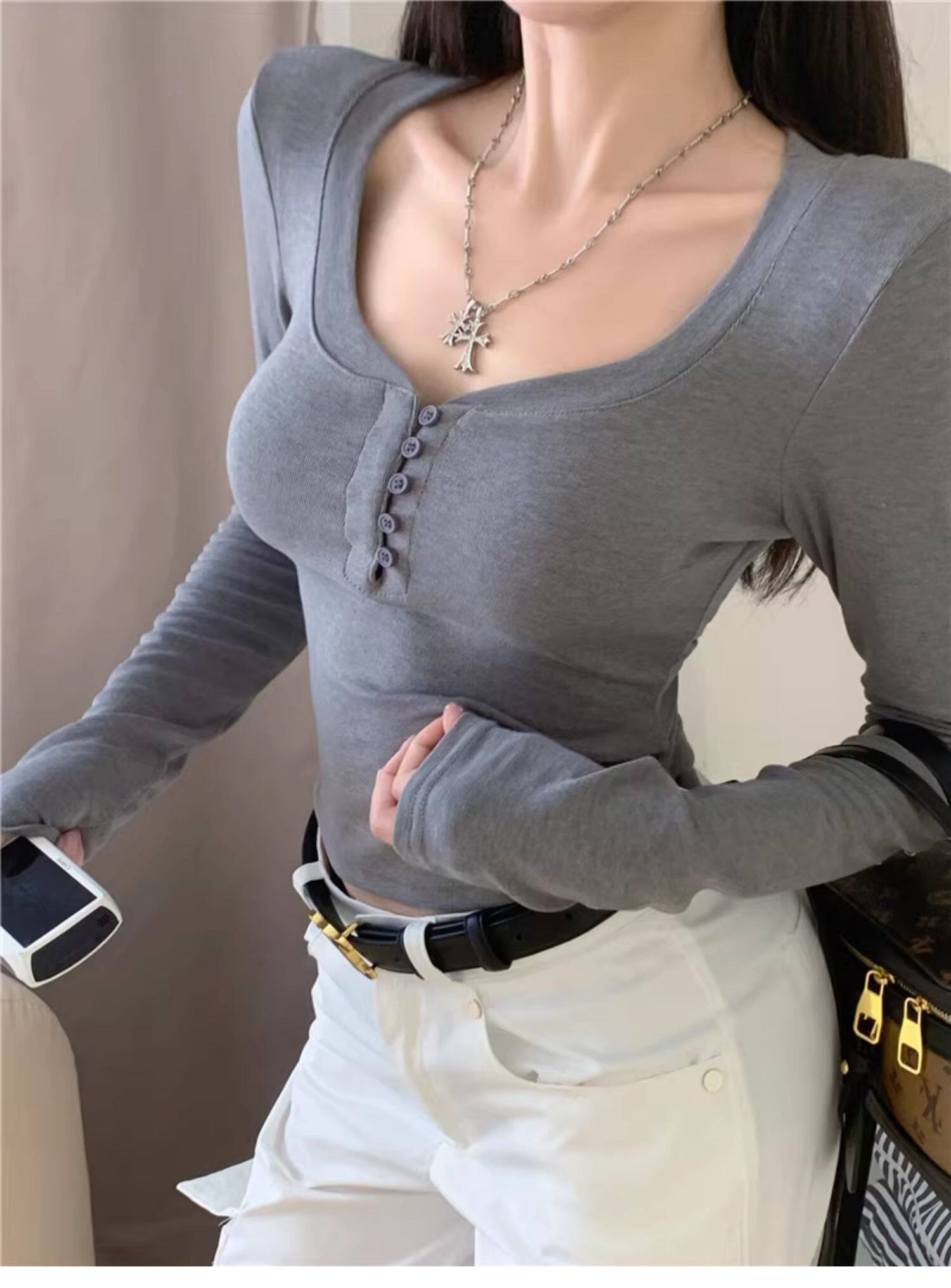 Sweet and Spicy Half-Open Collar Button-Up Long-Sleeve T-Shirt for Women, Autumn and Winter, Tight-Fitting, Chest-Enhancing, Short Style, Inner Layering Top