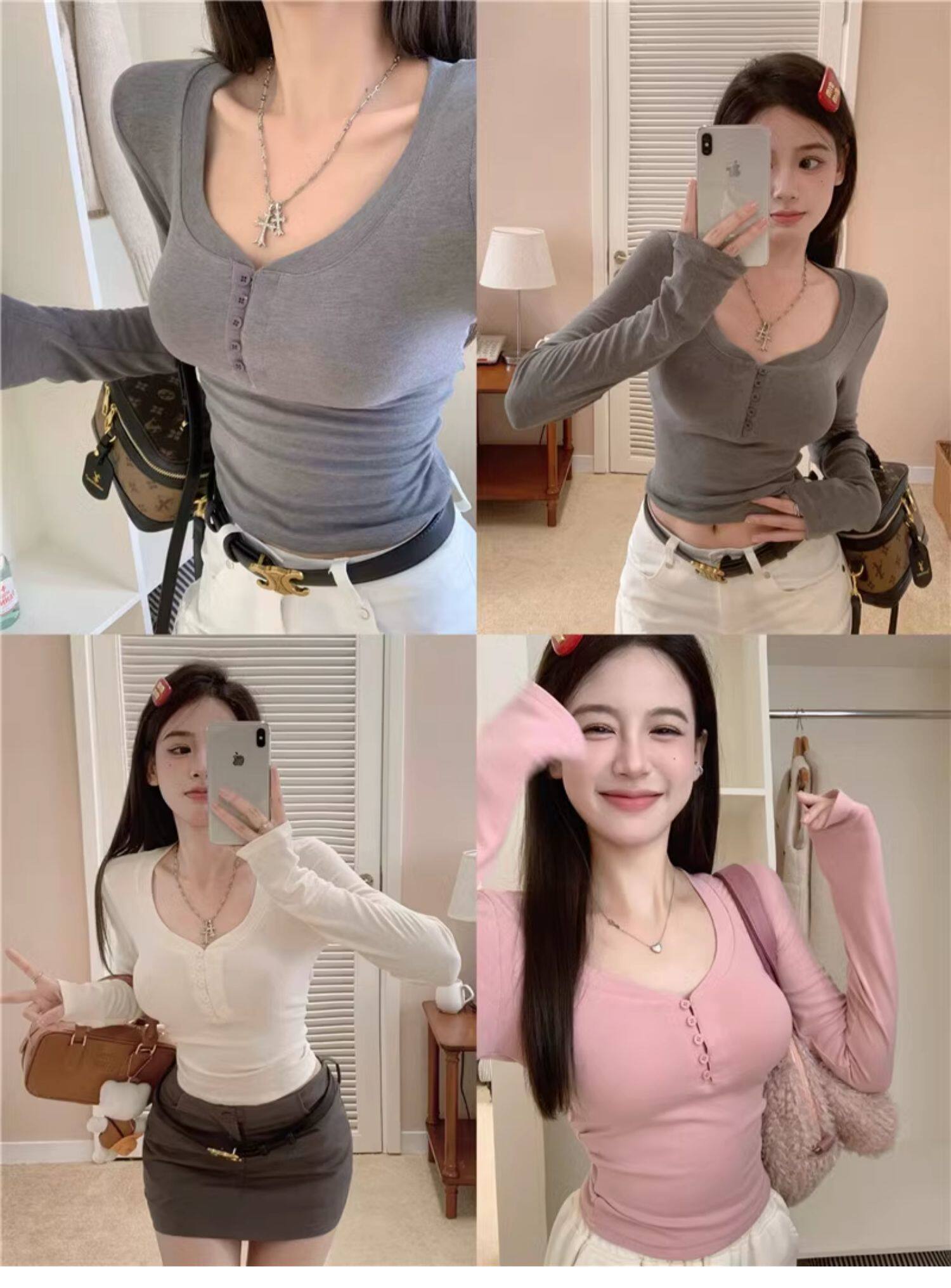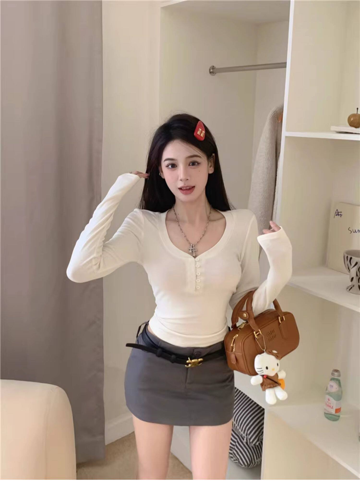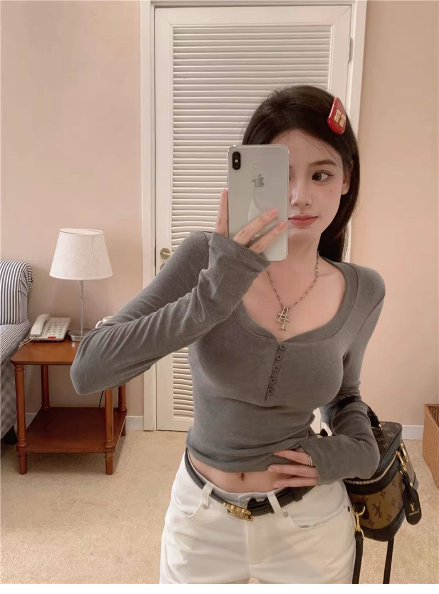 Sweet and Spicy Half-Open Collar Button-Up Long-Sleeve T-Shirt for Women, Autumn and Winter, Tight-Fitting, Chest-Enhancing, Short Style, Inner Layering Top