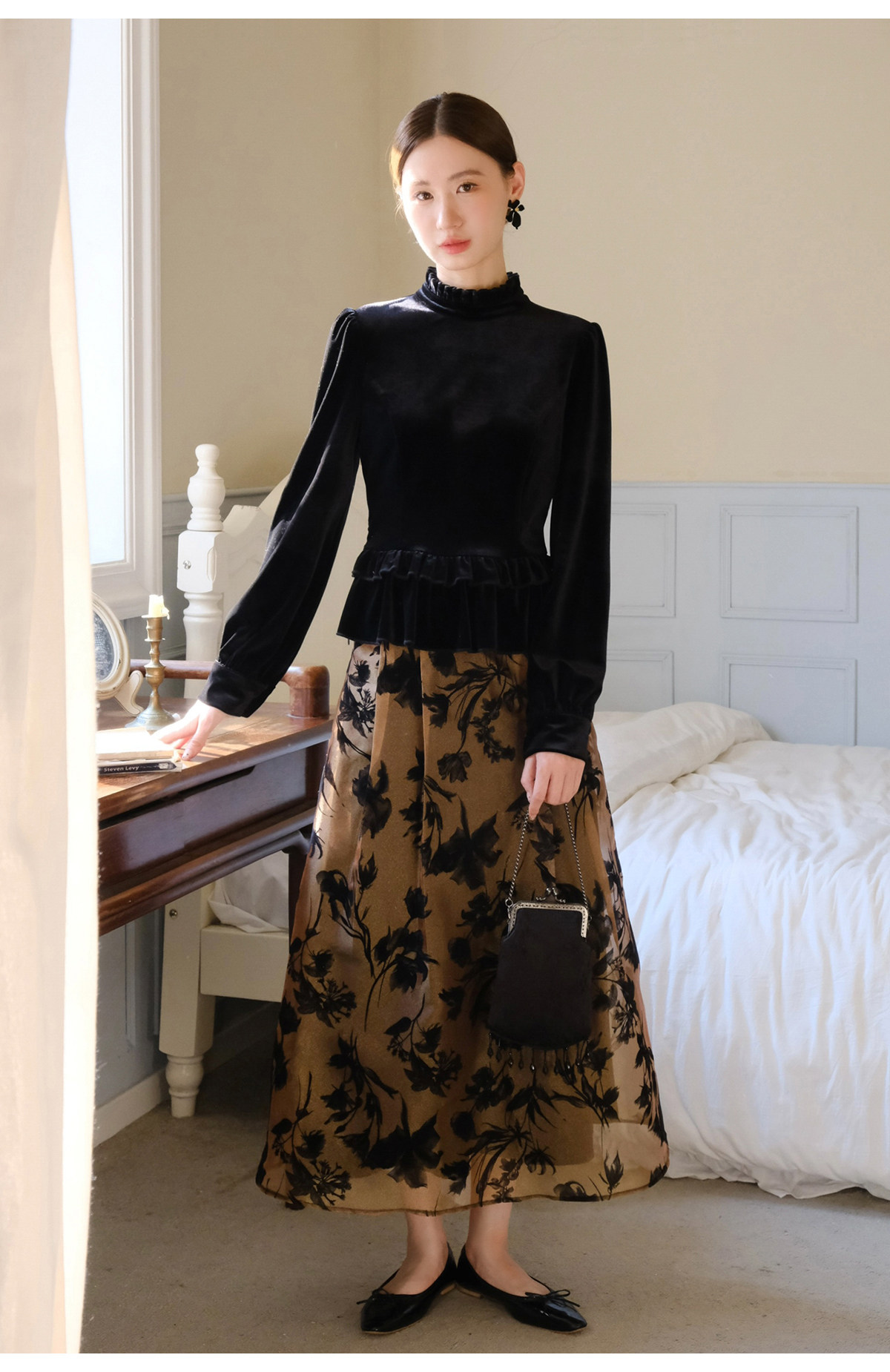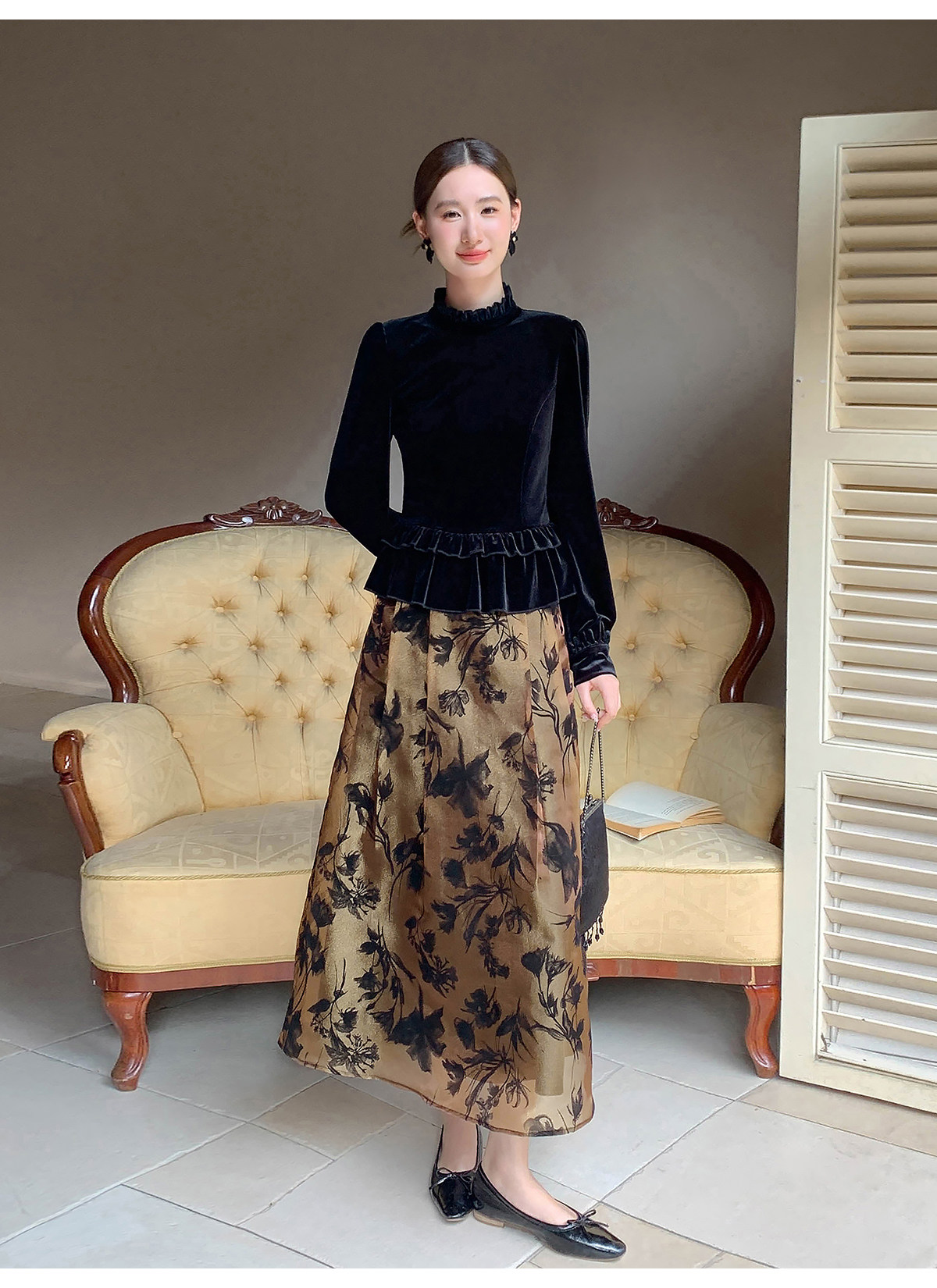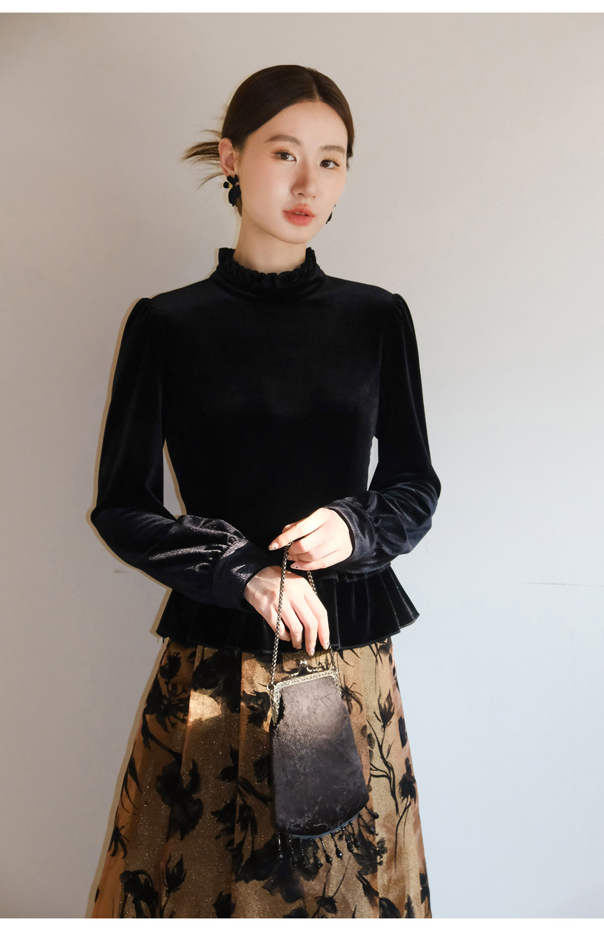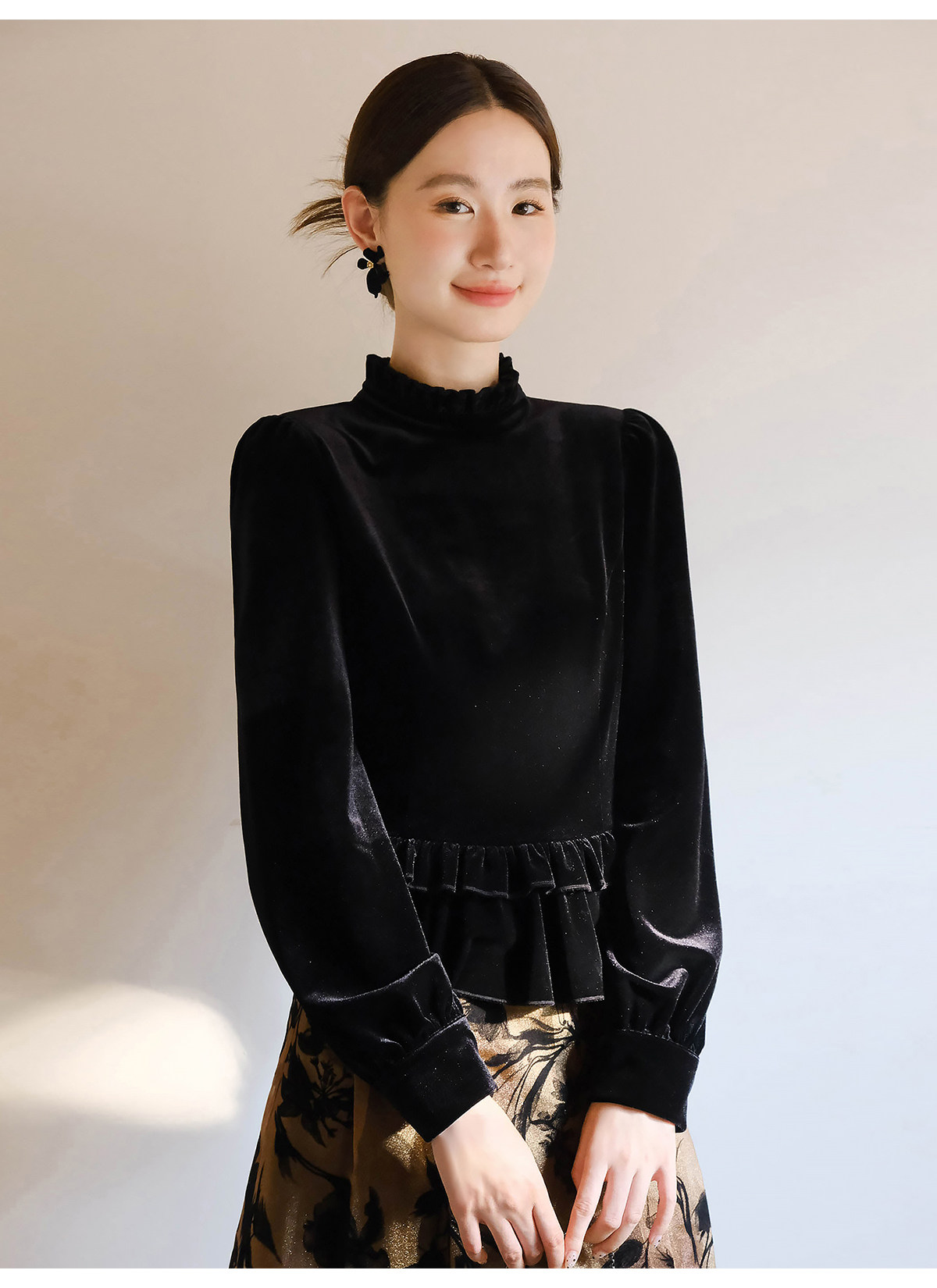 Xxning French-Style Ruffled Stand-Up Collar Velvet Shirt for Women, New Autumn and Winter Slim-Fit Outerwear Base Shirt
