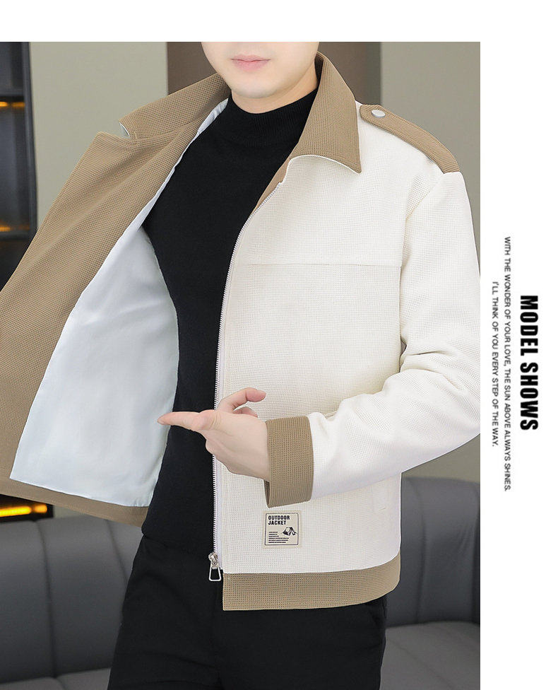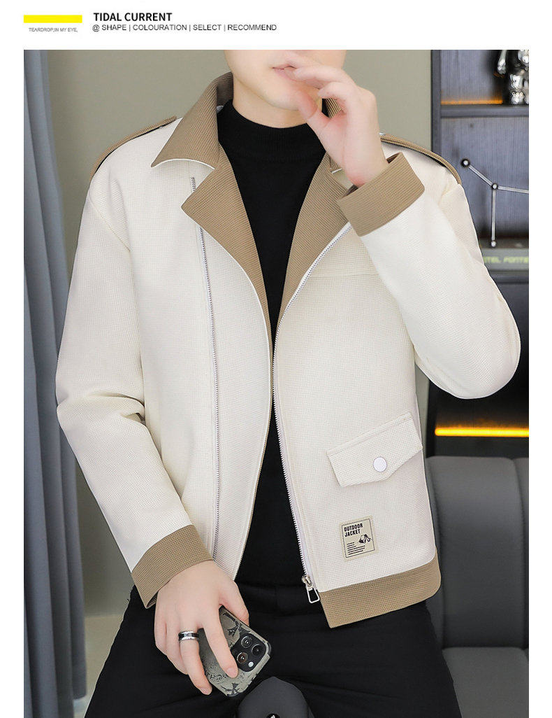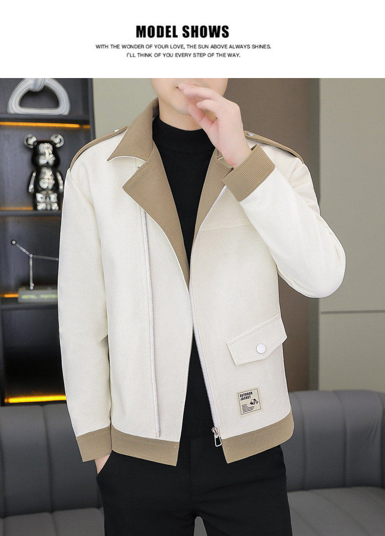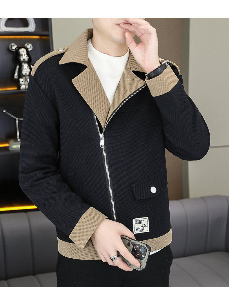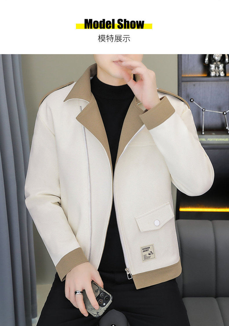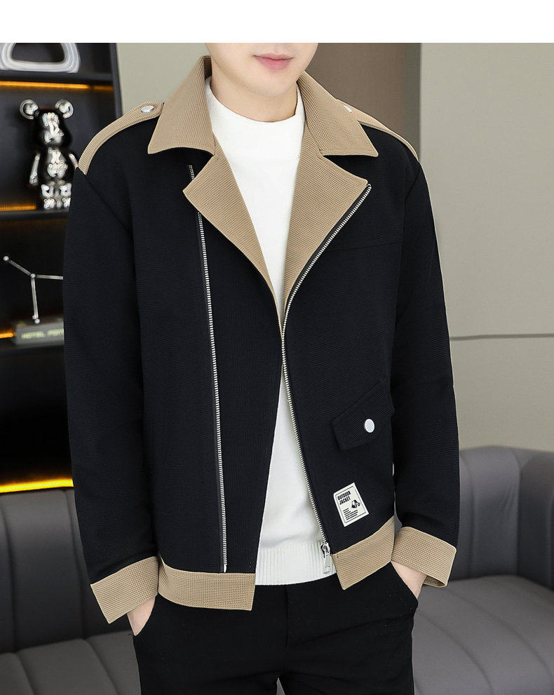 2025 Autumn New Style Lapel Color-Block Diagonal Zipper Waffle Jacket Men's Youth Slim Fit Versatile Coat