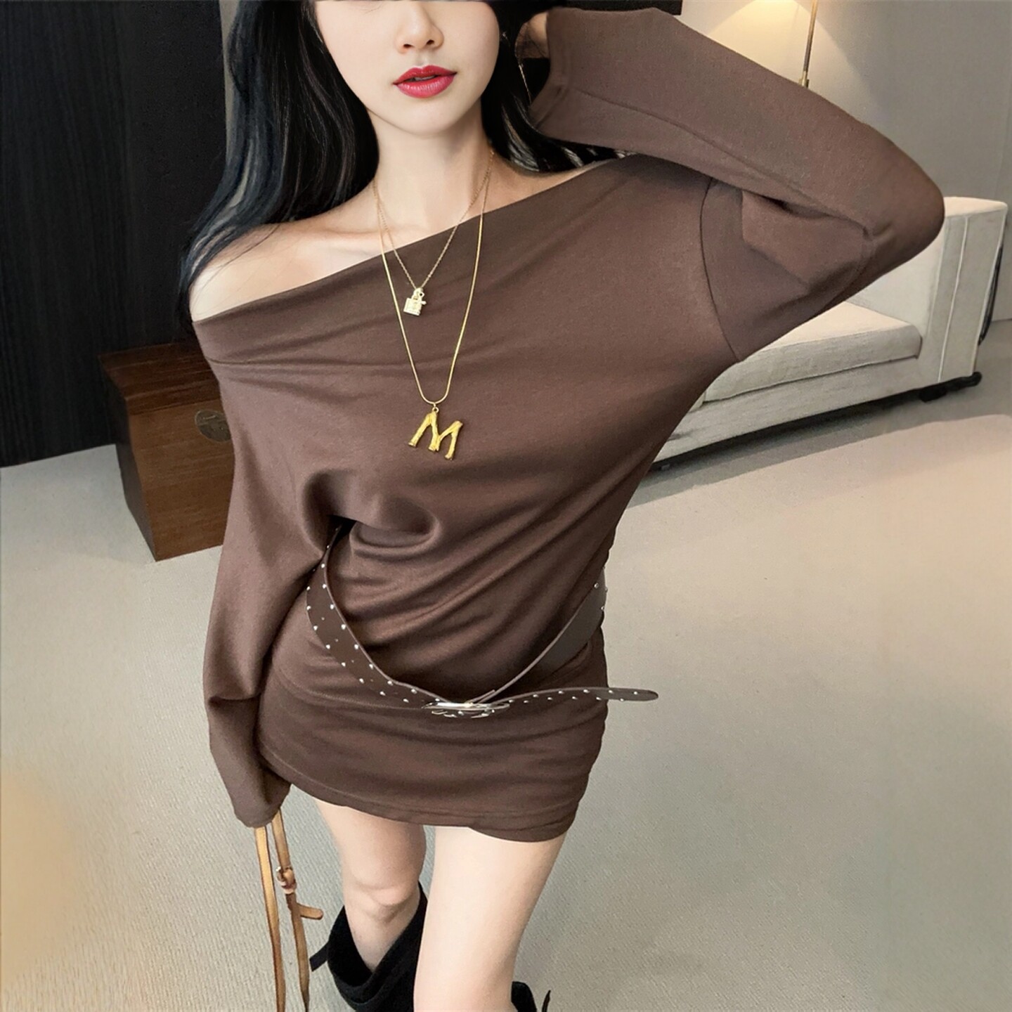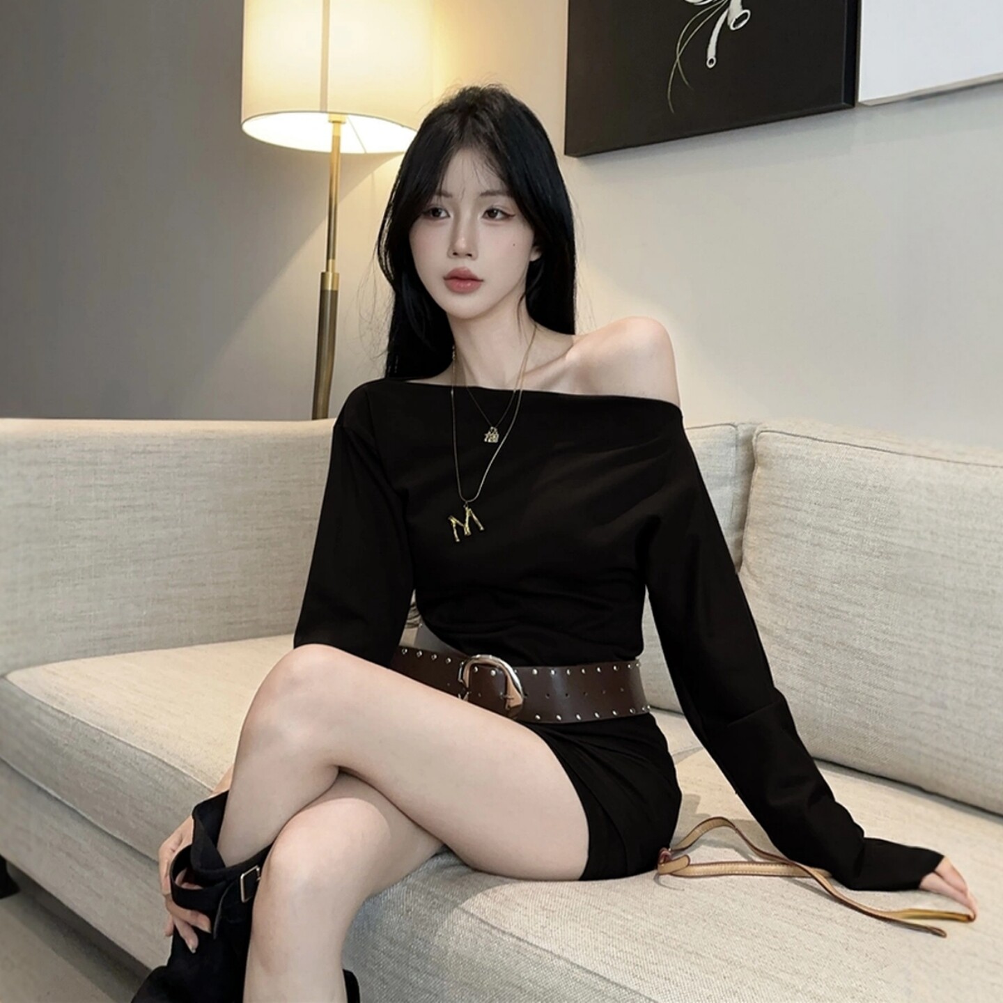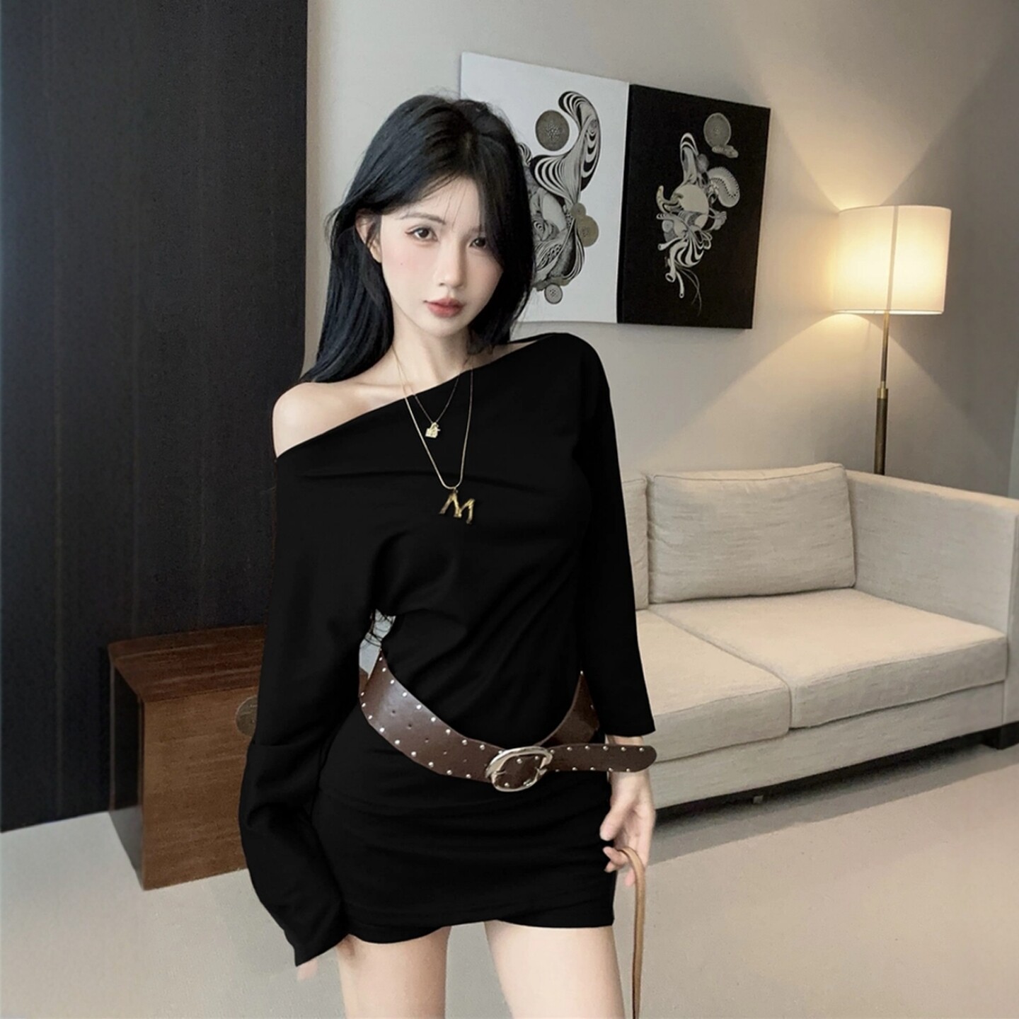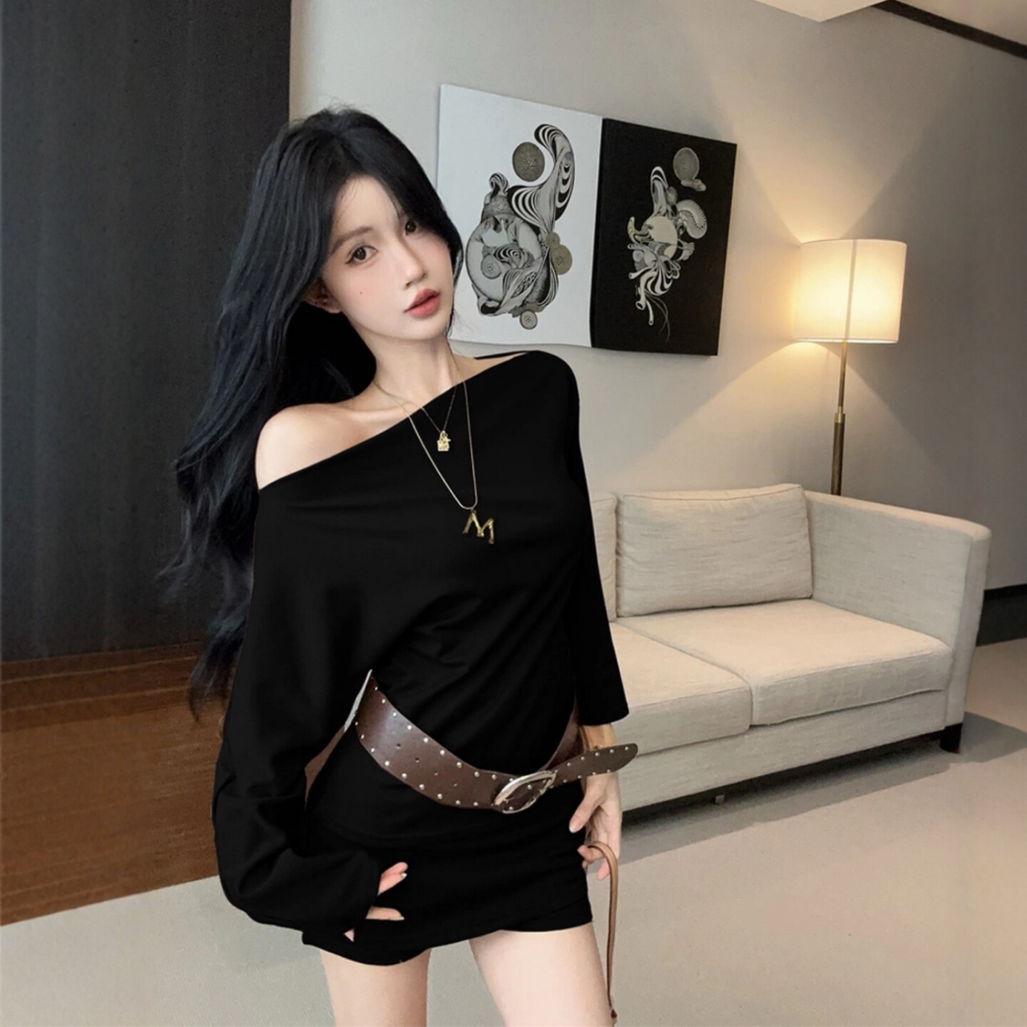 Purely Sensual Hot Girl Style One-Shoulder Black Suit for Women, Long-Sleeved T-Shirt Top, Slimming Hip-Hugging Short Skirt Pants Two-Piece Set