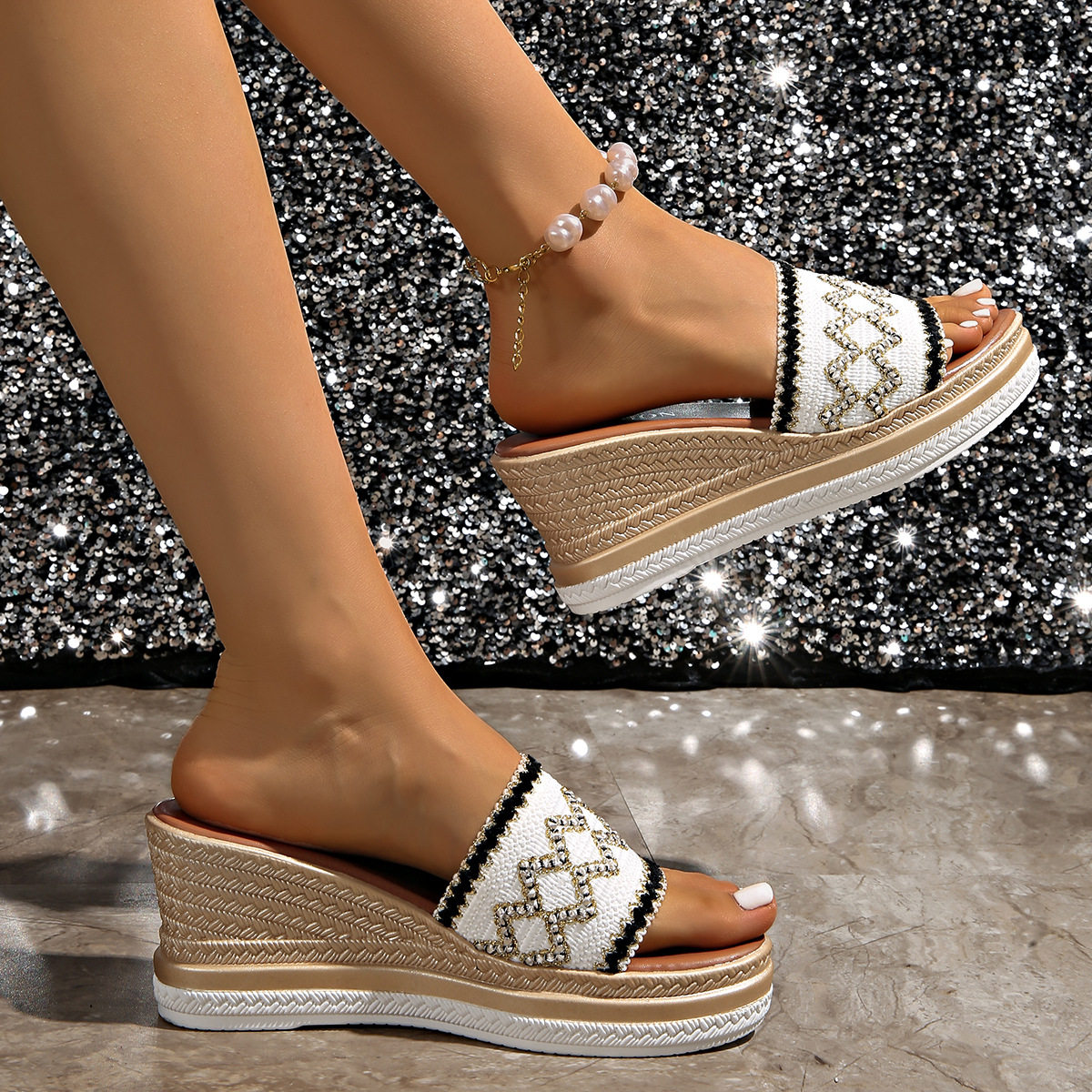 European and American Style Thick-Soled Slippers for Women, African Wave-Patterned Colorful Woven Strap Round-Toe Slide Slippers