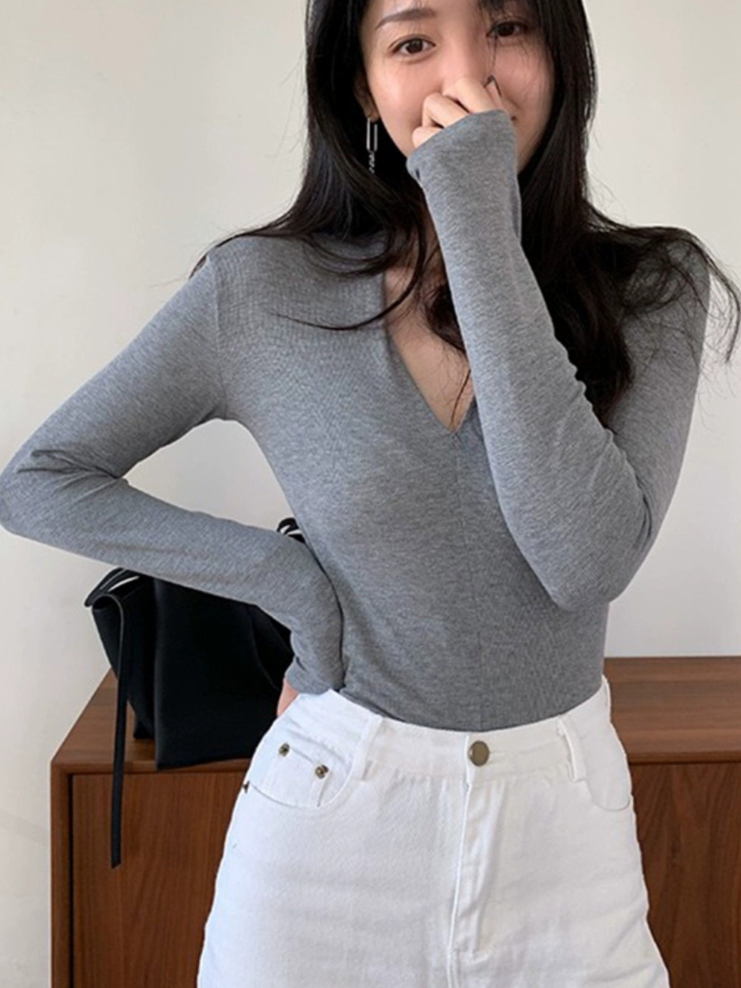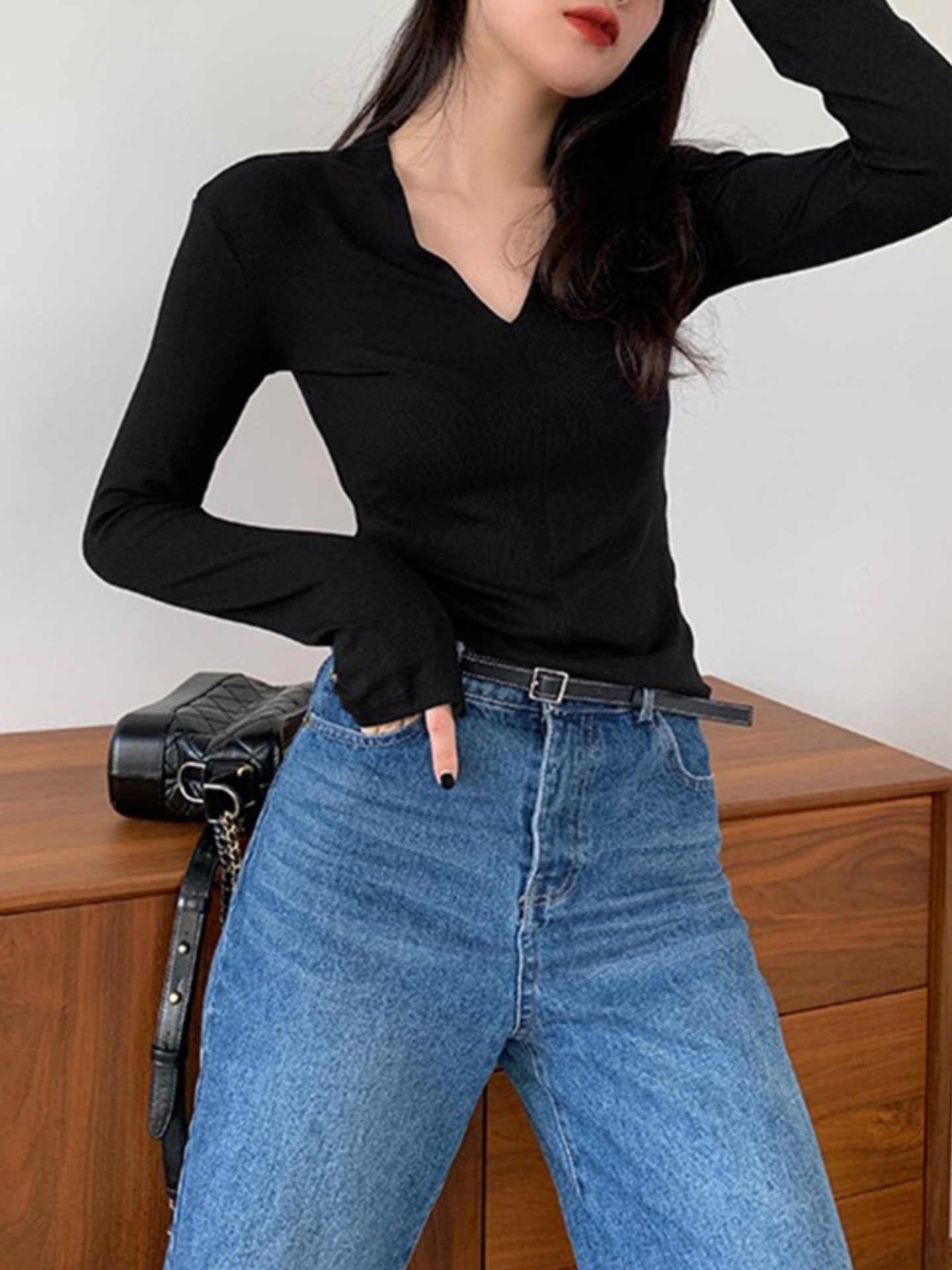 Designed V-Neck Tight-Fitting Long-Sleeved Top for Women in Autumn and Winter, Slimming, Sexy, Versatile, Stylish and Slim-Fitting Knitted Top